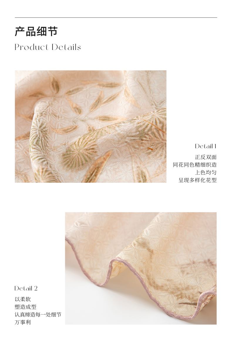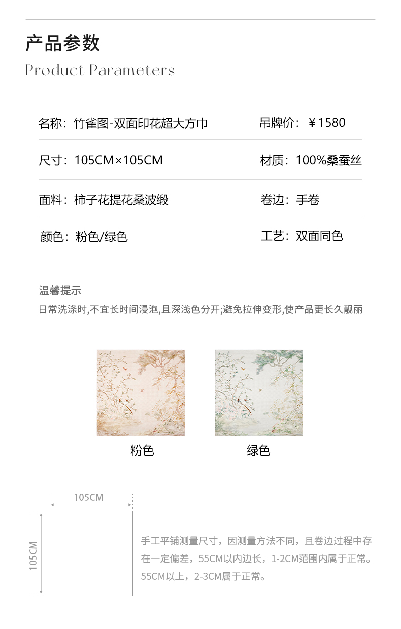 尺寸:105CM×105CM 材质:100桑蚕丝 面料:柿子花提花桑波缎 卷边:手卷 颜色:粉色/绿色 工艺:双面同色