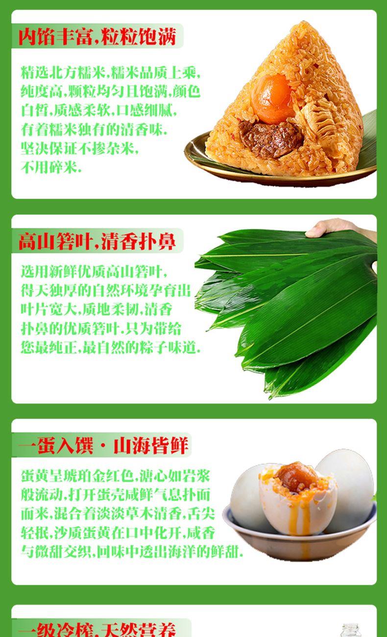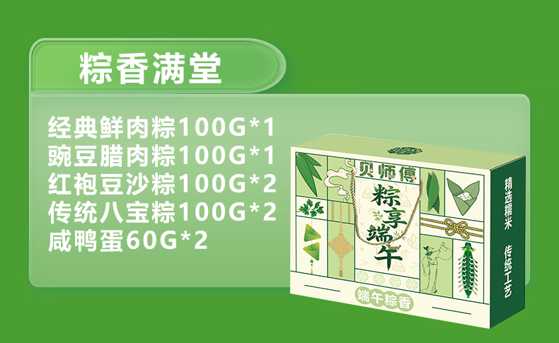 配置: 经典鲜肉粽100g*1 豌豆腊肉粽100g*1 红袍豆沙粽100g*2 传统八宝粽100g*2 高邮咸鸭蛋60g*2 推荐理由: 一口尝尽南北风味,咸甜皆不辜负。 经典鲜肉粽与豌豆腊肉粽,鲜香四溢,满足咸粽党的味蕾;红袍豆沙与传统八宝,甜而不腻,慰藉甜粽党的期待。 搭配两颗高邮咸鸭蛋,金黄流油,咸香起砂。 6件精品,荤素甜咸巧妙搭配,自享是对味蕾的犒劳,送礼更显独到心思。