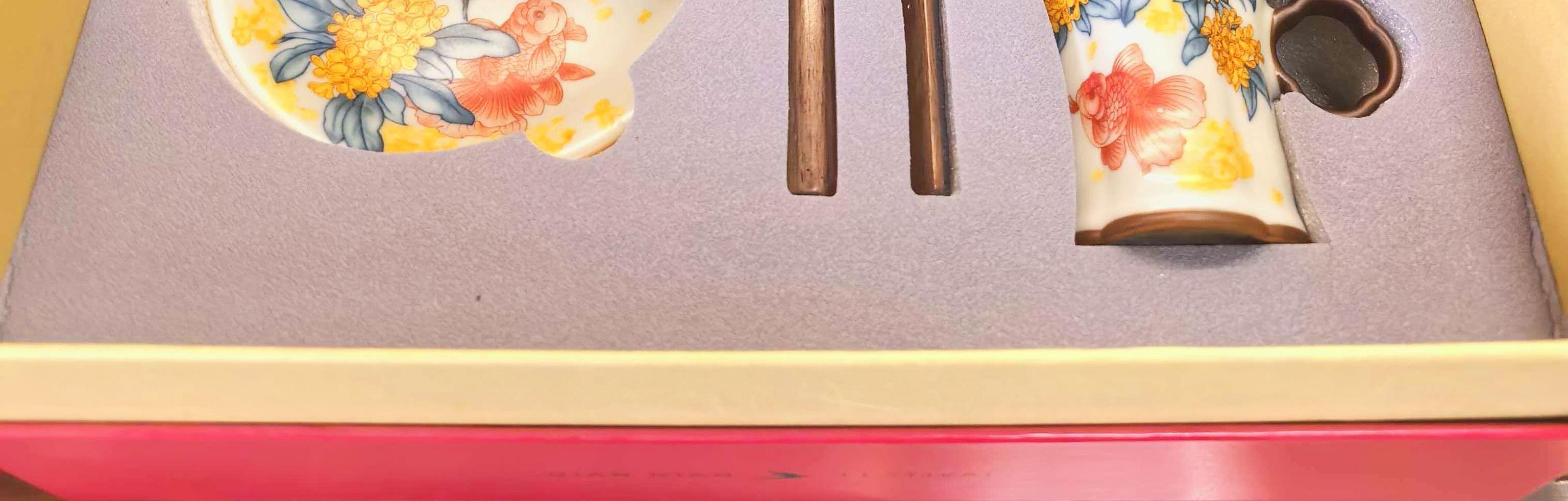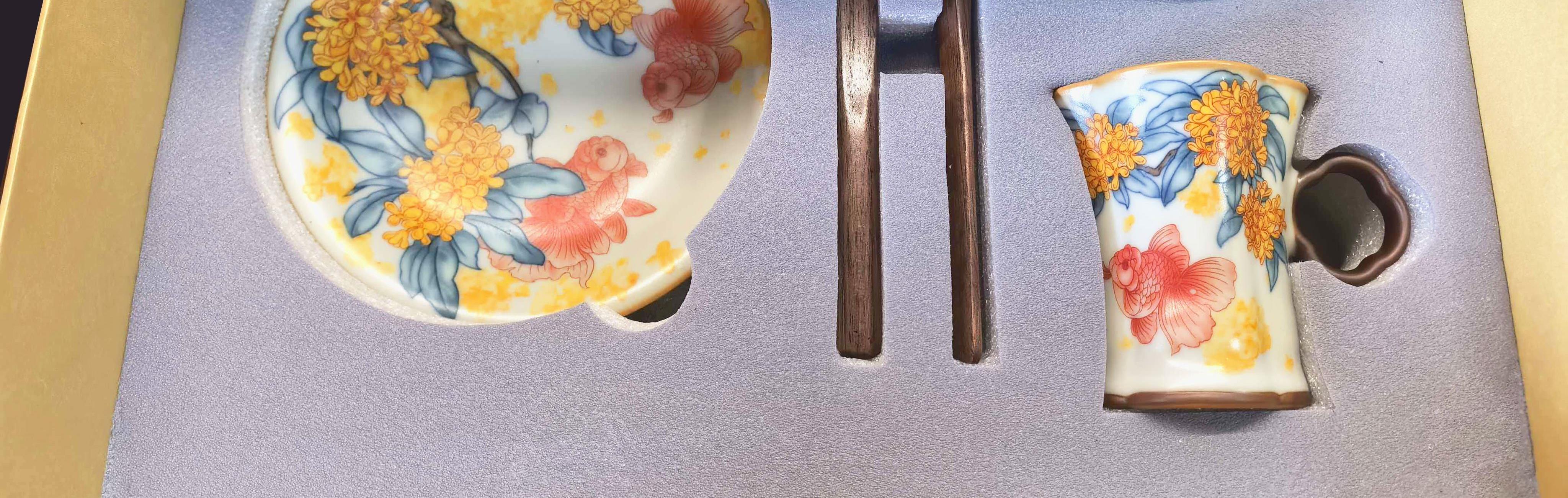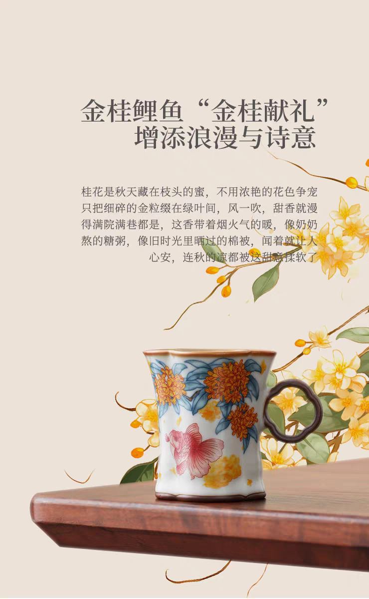 配制: 2杯 2盘 2搅拌棒 1礼盒手提袋 规格:杯子:8.8*7.3cm 盘 13.3*13.3cm 材质:黄汝窑 胡桃木 堆料。 推荐说明:金鲤桂花,寓意金贵。连年有鱼。内外皆有画面。玛瑙入釉,蝉翼开片。亚黄汝瓷,技术新品,采用高价优质瓷土,紫口铁足。立体浮雕杯身。杯身开片,可养瓷。