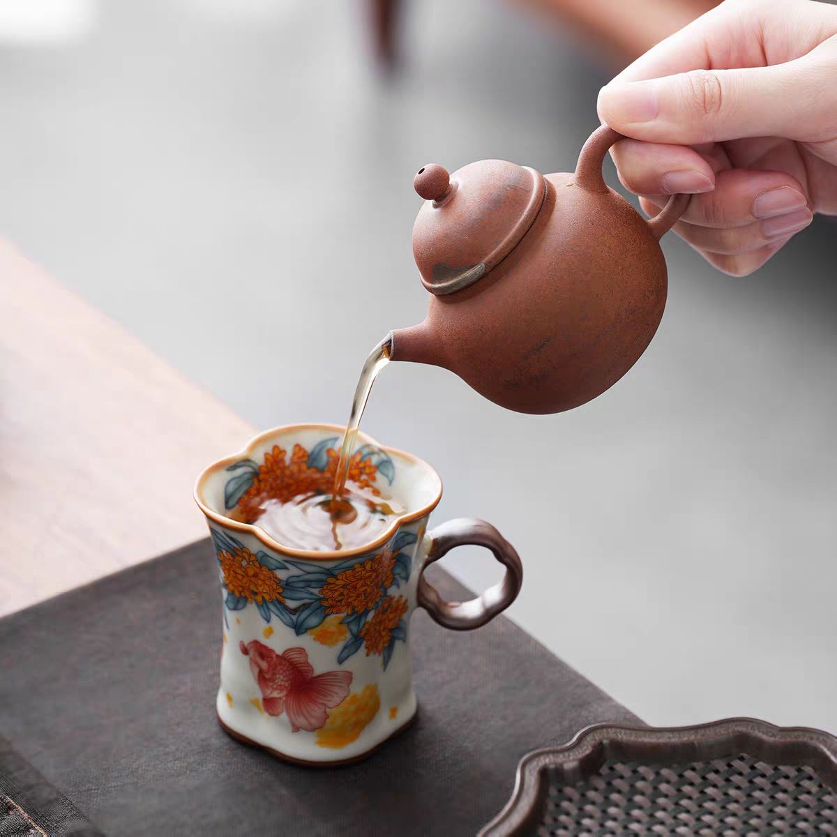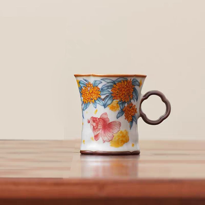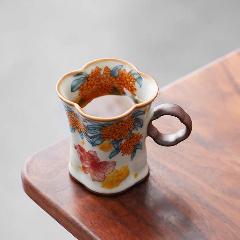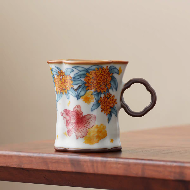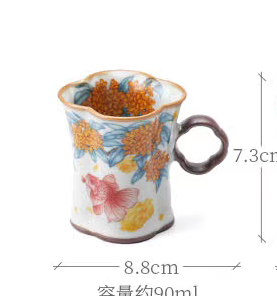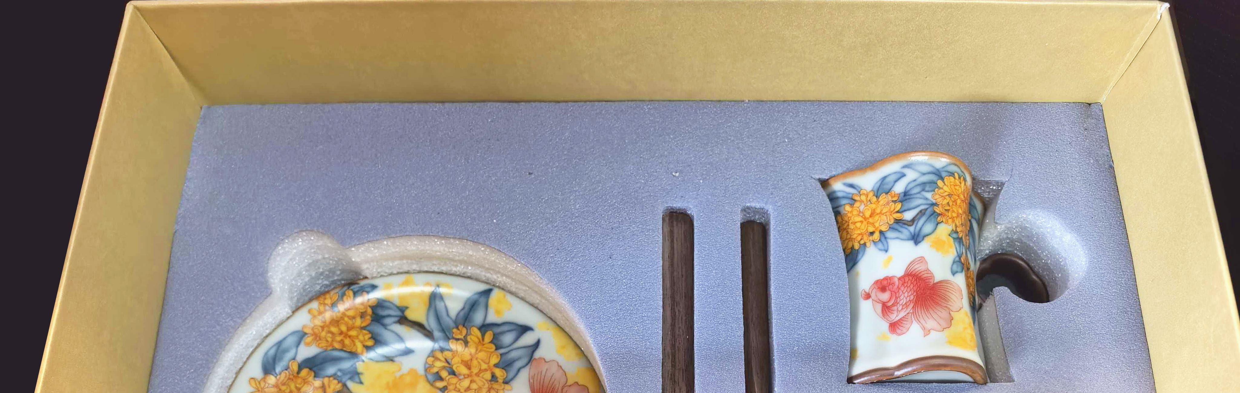 配制: 2杯 2盘 2搅拌棒 1礼盒手提袋 规格:杯子:8.8*7.3cm 盘 13.3*13.3cm 材质:黄汝窑 胡桃木 堆料。 推荐说明:金鲤桂花,寓意金贵。连年有鱼。内外皆有画面。玛瑙入釉,蝉翼开片。亚黄汝瓷,技术新品,采用高价优质瓷土,紫口铁足。立体浮雕杯身。杯身开片,可养瓷。