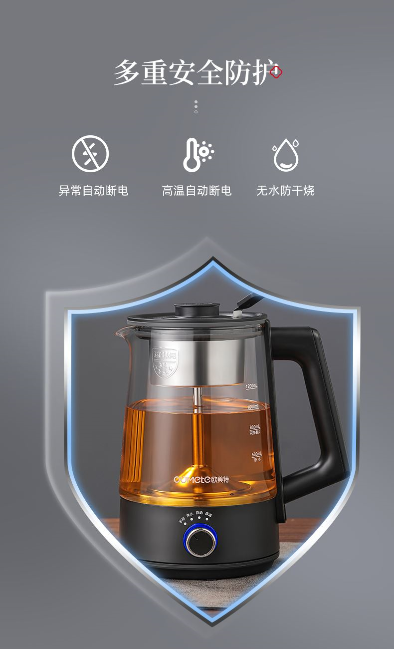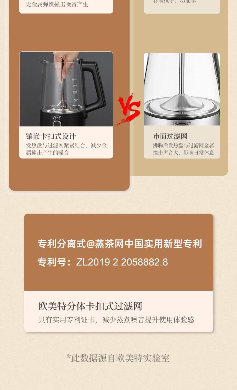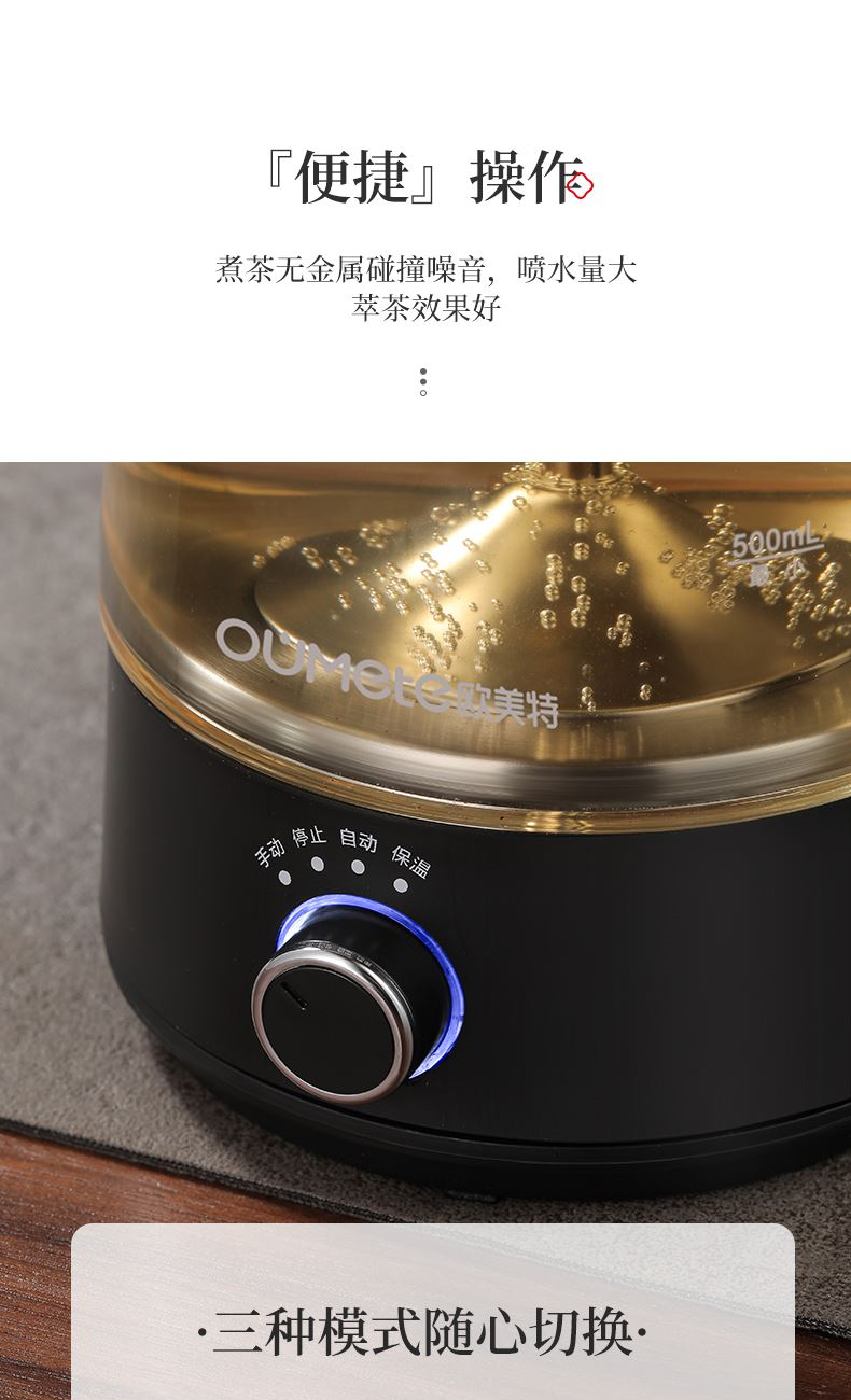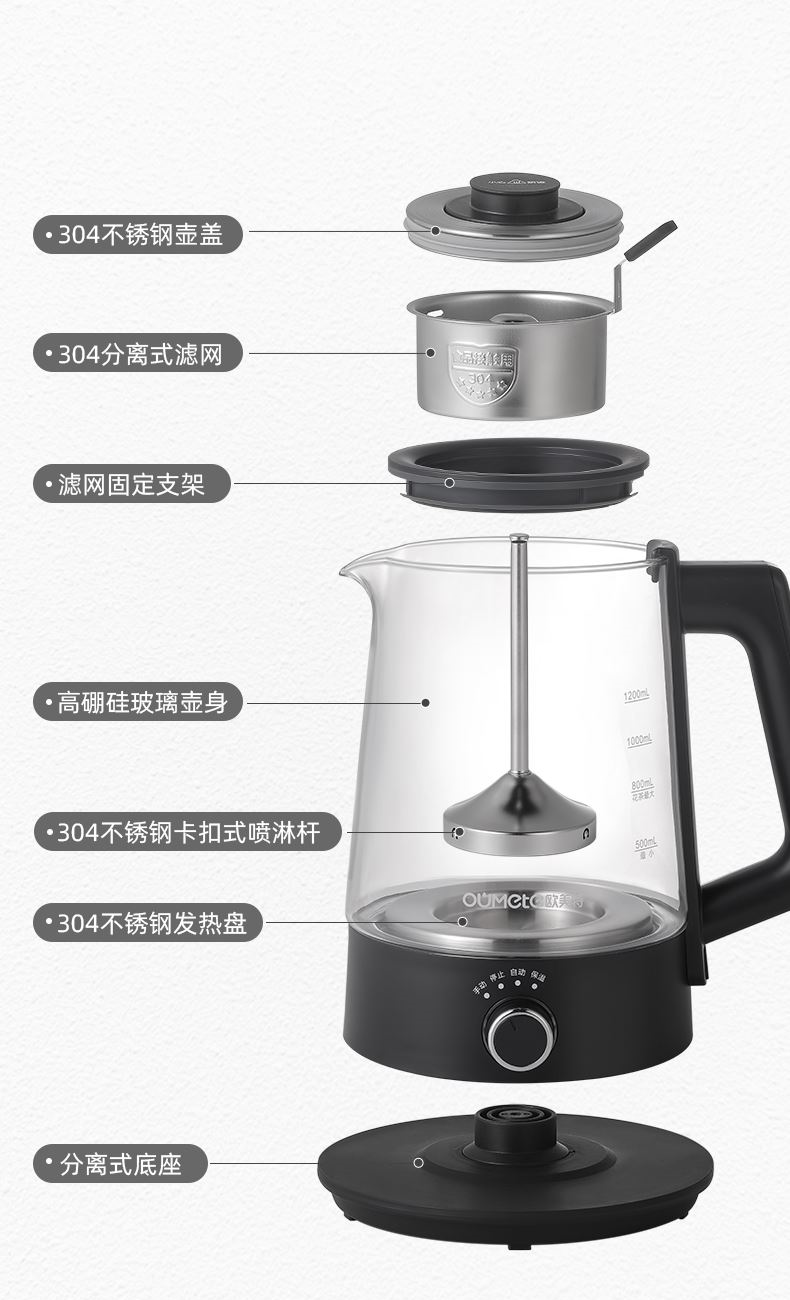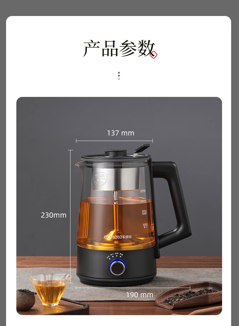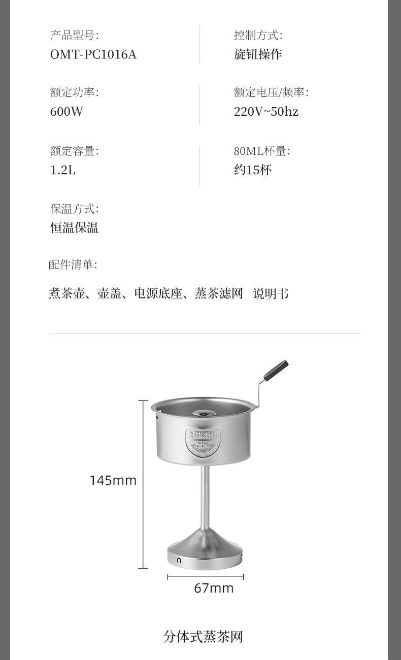 型号:OMT-PC1016A 容量:1.2L 功率:600W 功能:自动、手动、停止、保温 材质:杯体耐热玻璃,304不锈钢发热盘、过滤网、壶盖 符合群体:爱茶人士