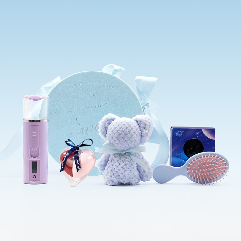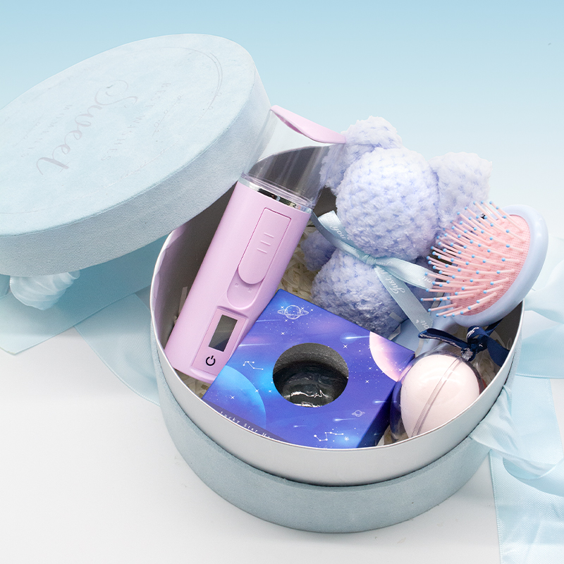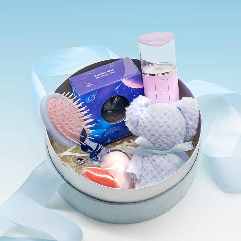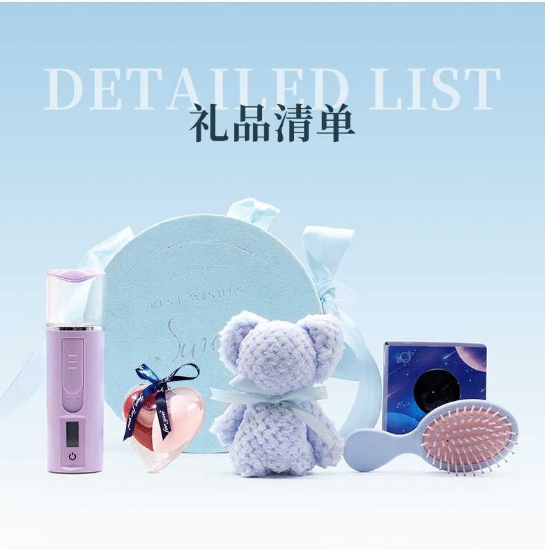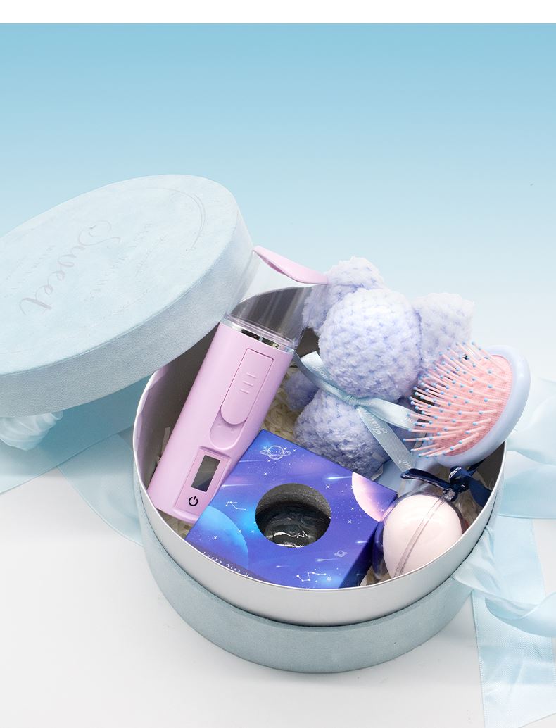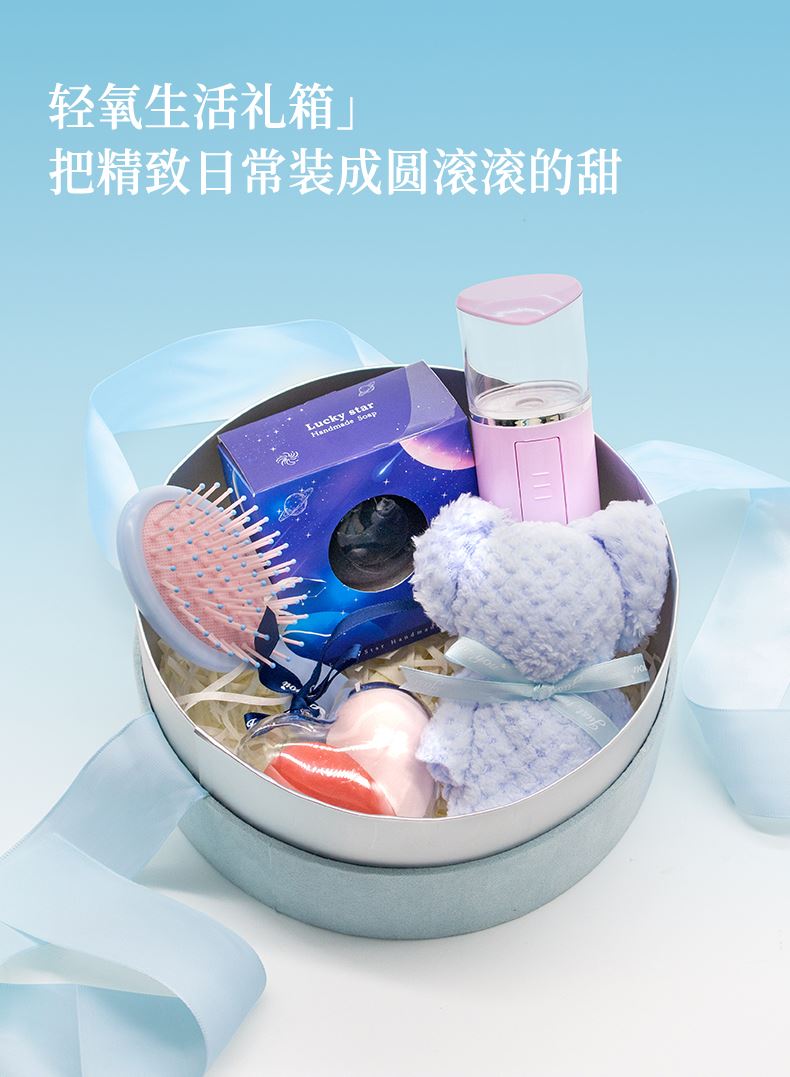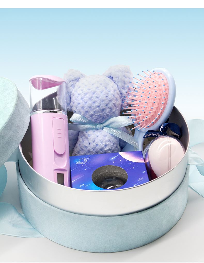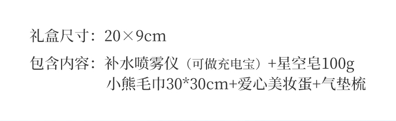 礼盒尺寸:20*9cm 补水喷雾仪(可用作充电宝) 气垫梳子 爱心美妆蛋 星空皂:100g 小熊毛巾:30*30cm