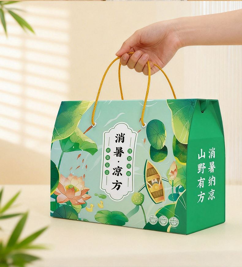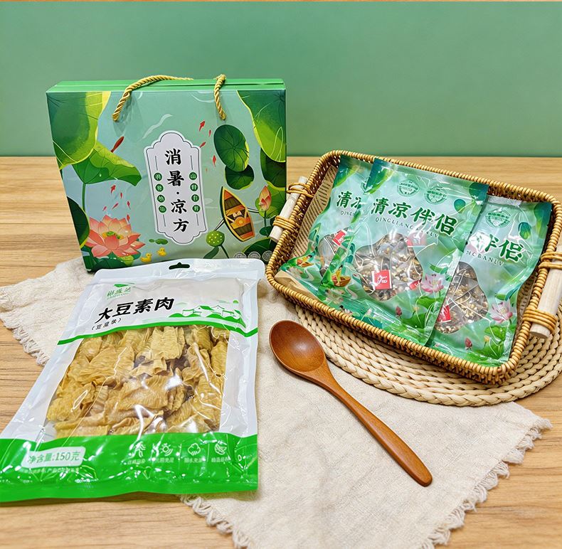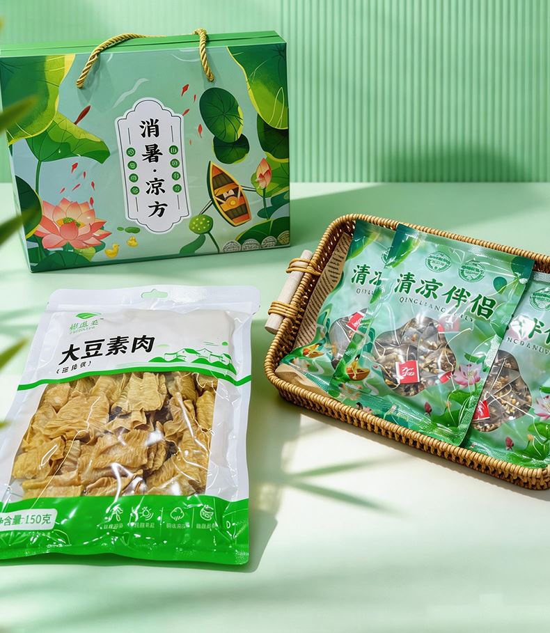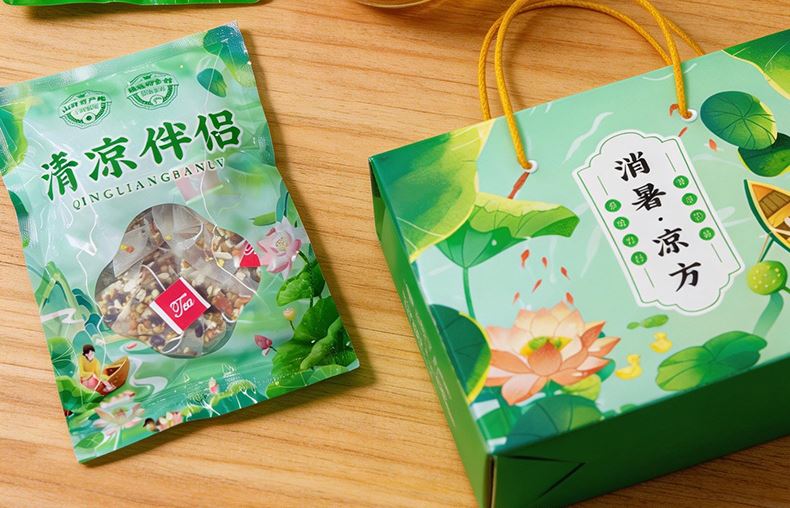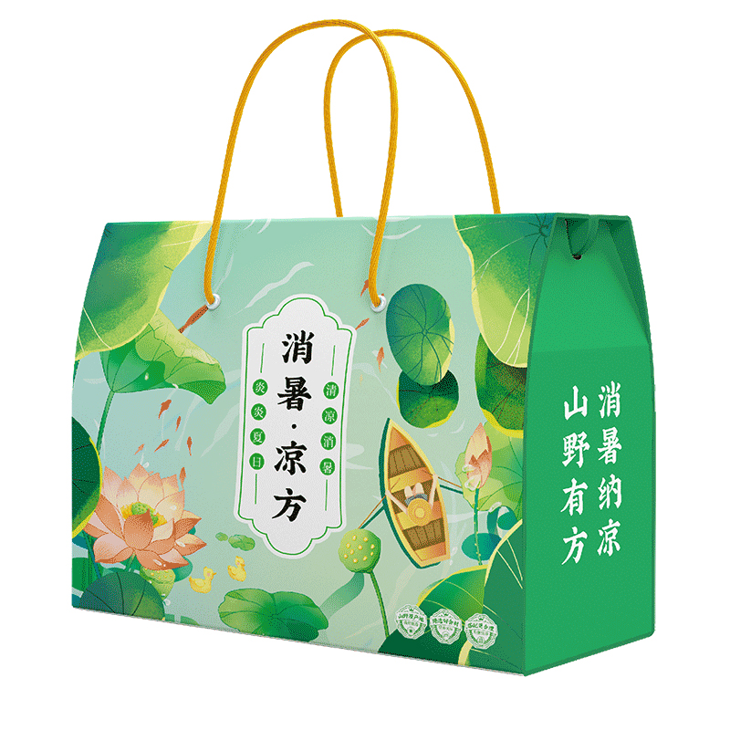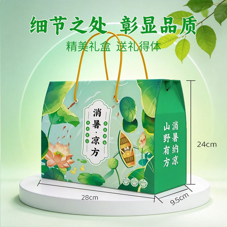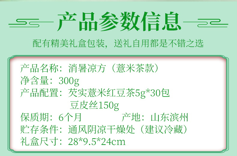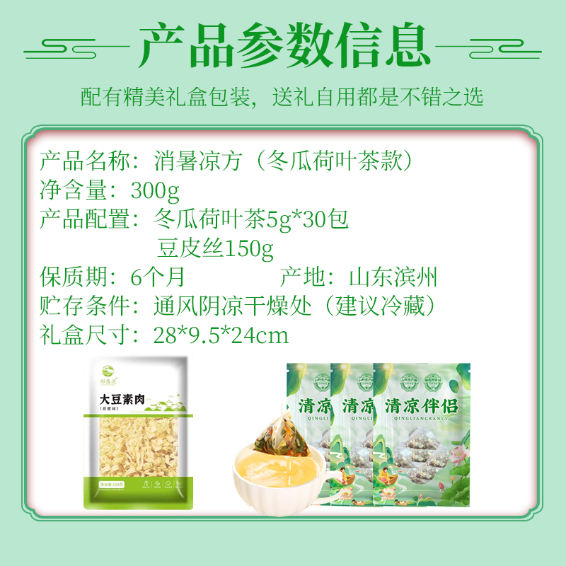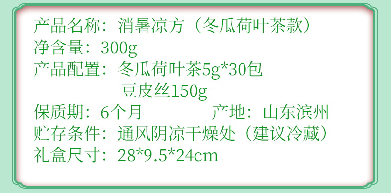 消暑凉方(冬瓜荷叶茶款) 净含量:300g 产品规格配置:冬瓜荷叶茶5g*30包豆皮丝150g 配料:大麦茶、决明子、橘皮、薏仁、冬瓜、荷叶、山楂、栀子 盒尺寸:28*9.5*24cm 箱尺寸:58*40*50 箱重量:13kg