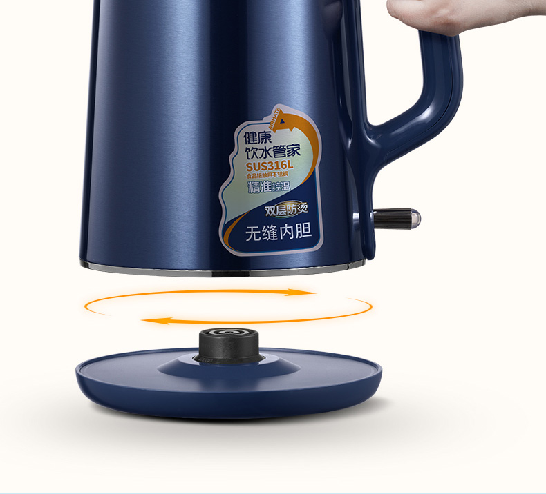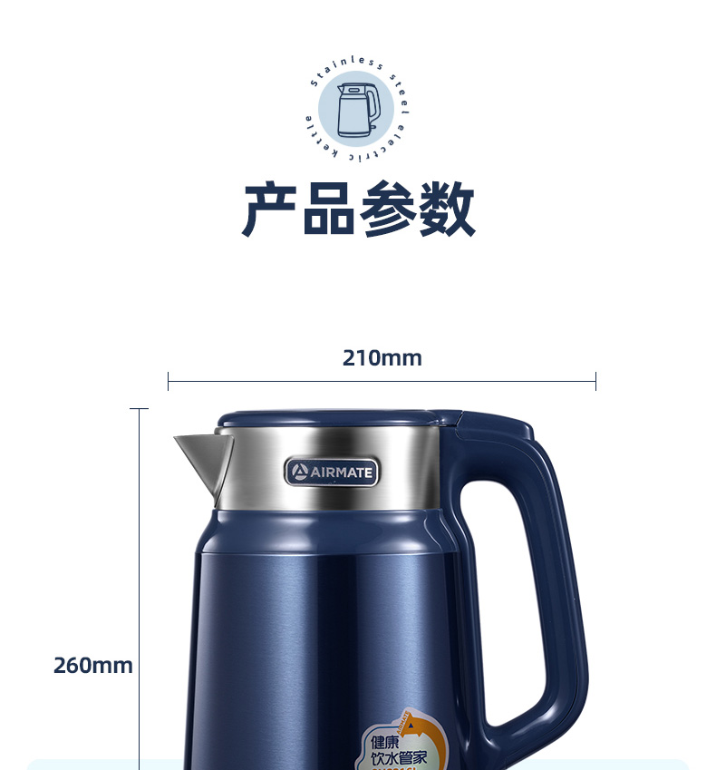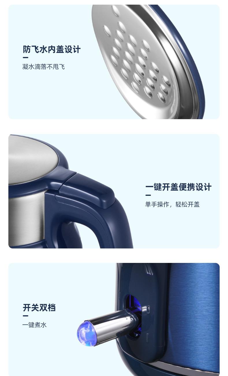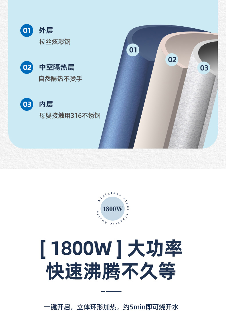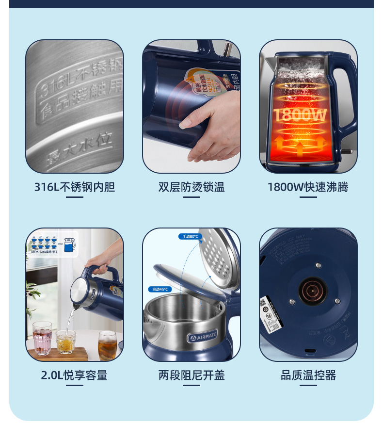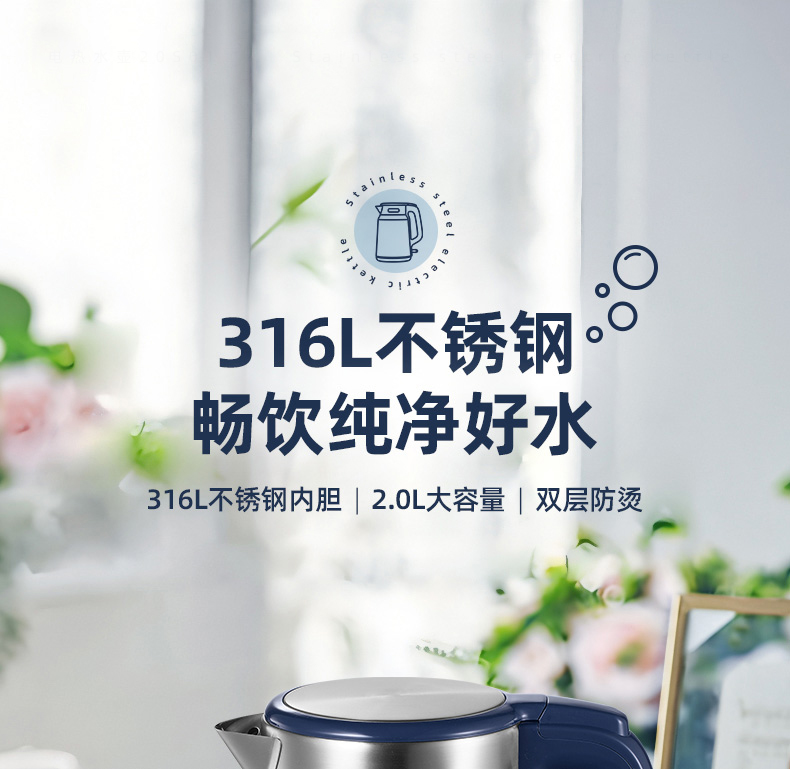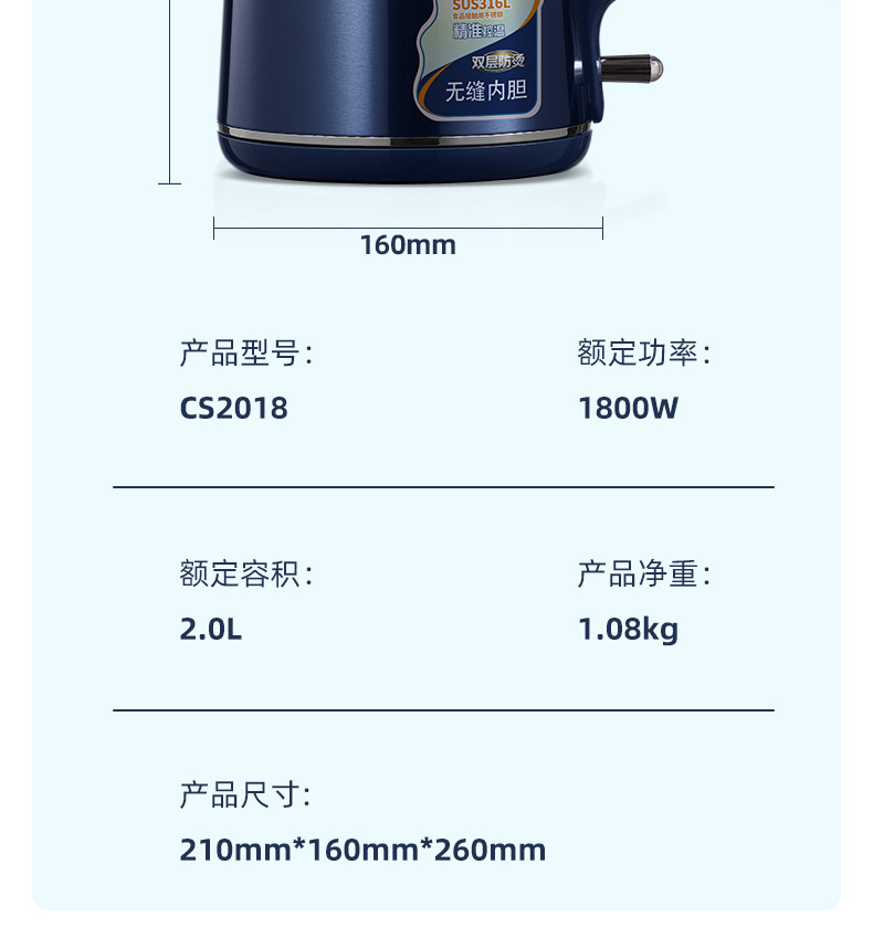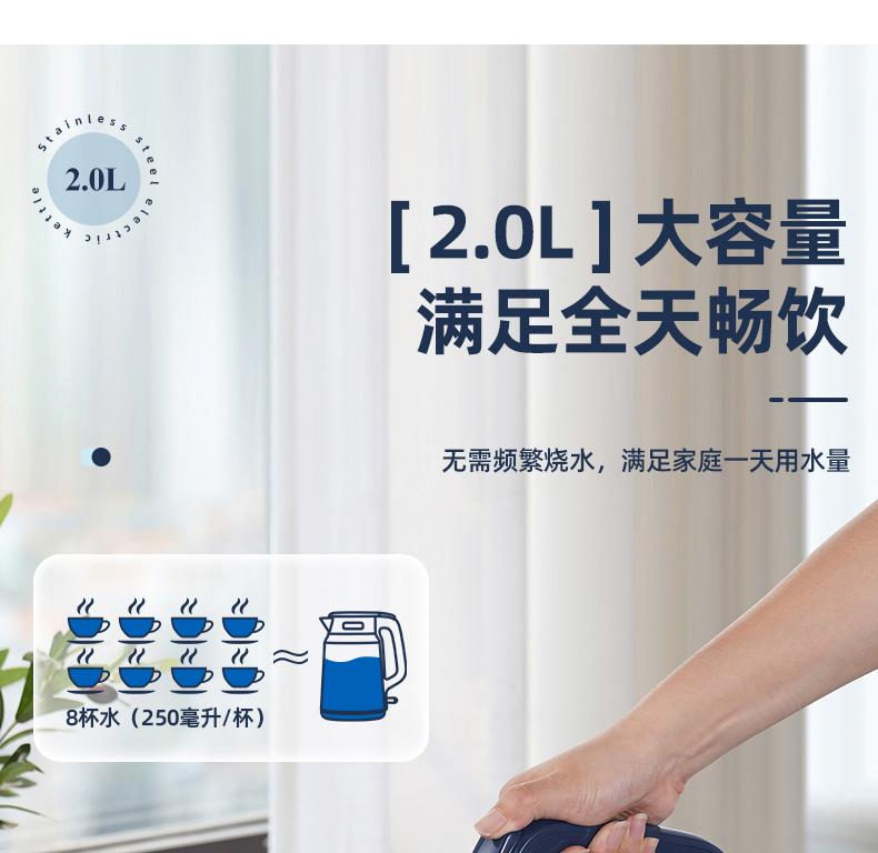 额定容量:2.0L 额定功率:1800W 额定电压:220V- 额定频率:50HZ 净重:1.08Kg 毛重:1.42K9 包装尺寸:230x190x310mm 1.316L 食品级不锈钢内胆,饮水更安心 2.2.0L大容量直供全家需求 3.双层防烫设计隔绝高温 4.无缝内胆清洗更彻 底 5.外塑内钢设计,既防烫又锁温,全家都能安心使用