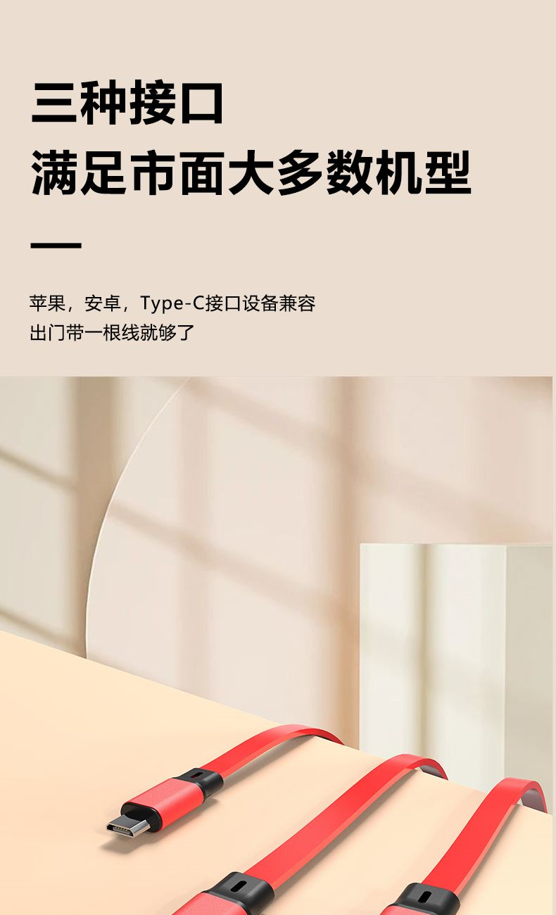 长度:1.2M 材质:TPE/ABS/铝合金 功率:66W 适用:TYPE-C/苹果/安卓 颜色:红色,蓝色,绿色,白色,黑色 产品重量:约46g 产品包装尺寸:140*90*27mm(彩盒) 产品卖点:Type-c接口支持快充, TPE环保材质,防缠绕,耐拉伸,经久耐用,加固接头,广泛兼容,适用市面绝大多数手机。