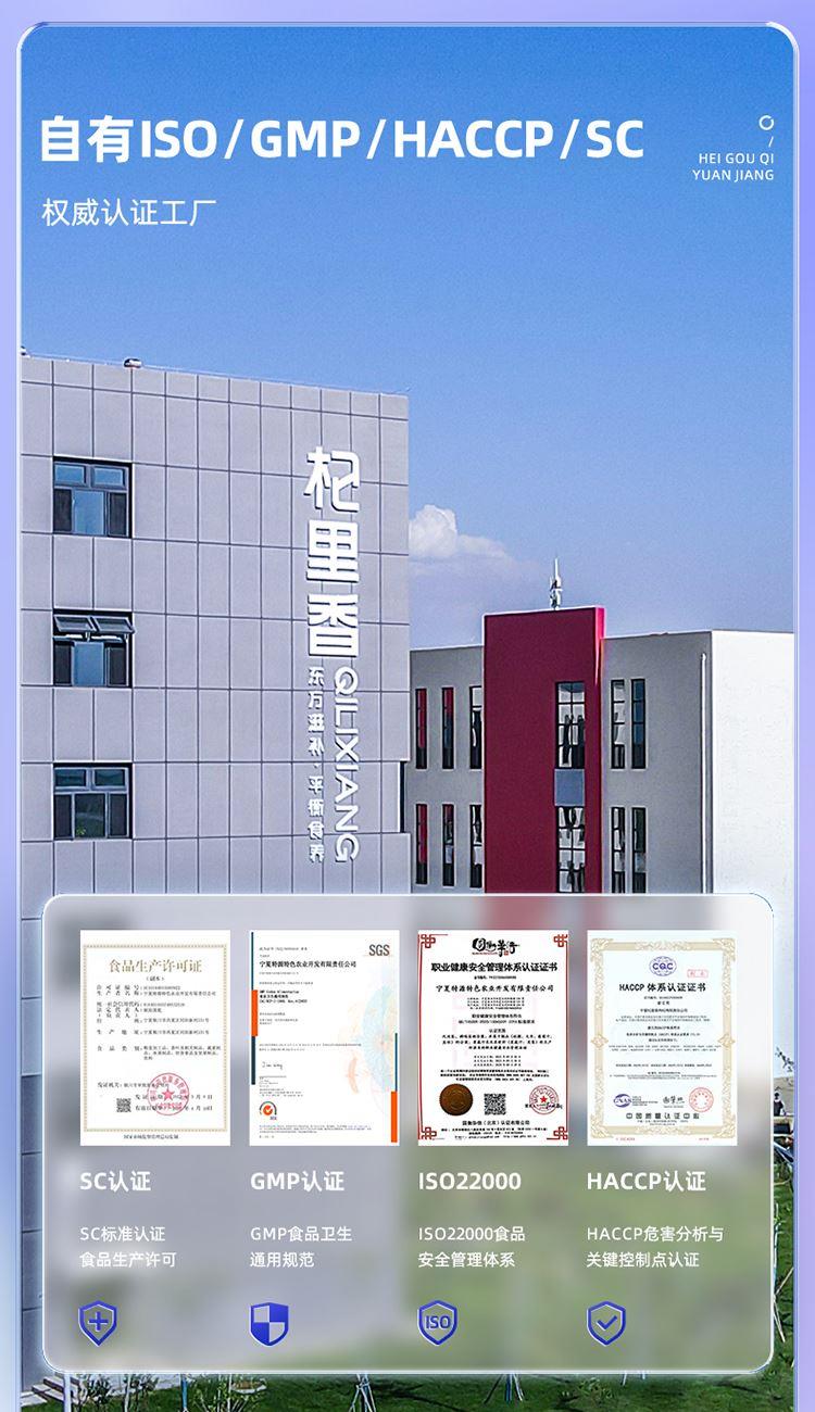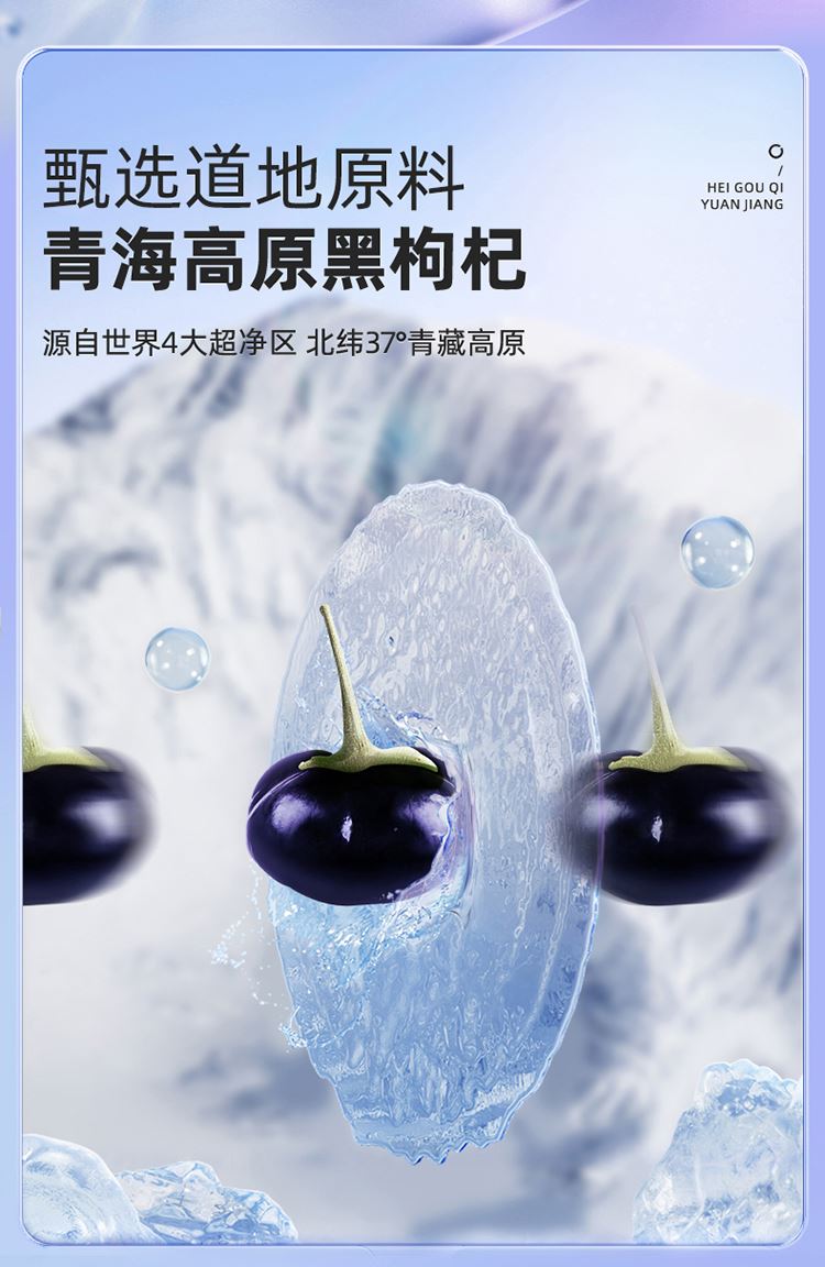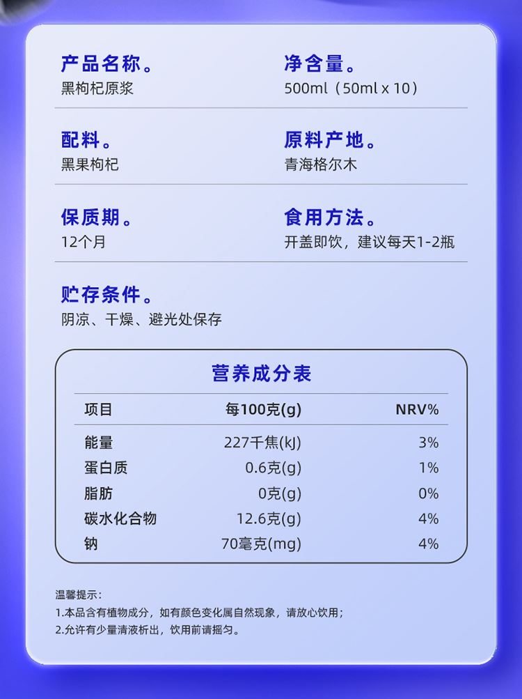 产品 名 称:黑枸杞原浆 配料:黑果枸杞 保质期:12个月 净含量:500ml(50mlx10) 原料产地:青海格尔木 食用方法:开盖即饮,建议每天1-2瓶 贮存条件:阴凉、干燥、避光处保存 温馨提示: 1.本品含有植物成分,如有颜色变化属自然现象,请放心饮用; 2.允许有少量清液析出,饮用前请摇匀