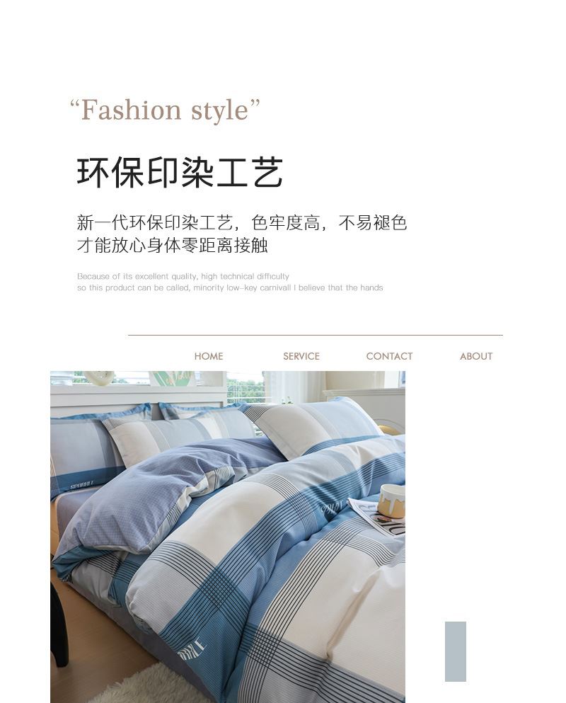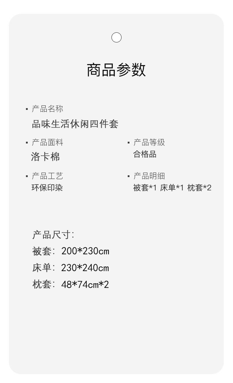 被套:200*230cm 床单:230*240cm 枕套:48*74cm*2 面料材质:洛卡棉 产品特点: 1.洛卡棉面料经过特殊处理,具有良好的色牢度。 2.洛卡棉面料耐水性好,手感柔软,亲肤性好。 3.洛卡棉具有良好的透气性,具有防霉抗皱的特性。