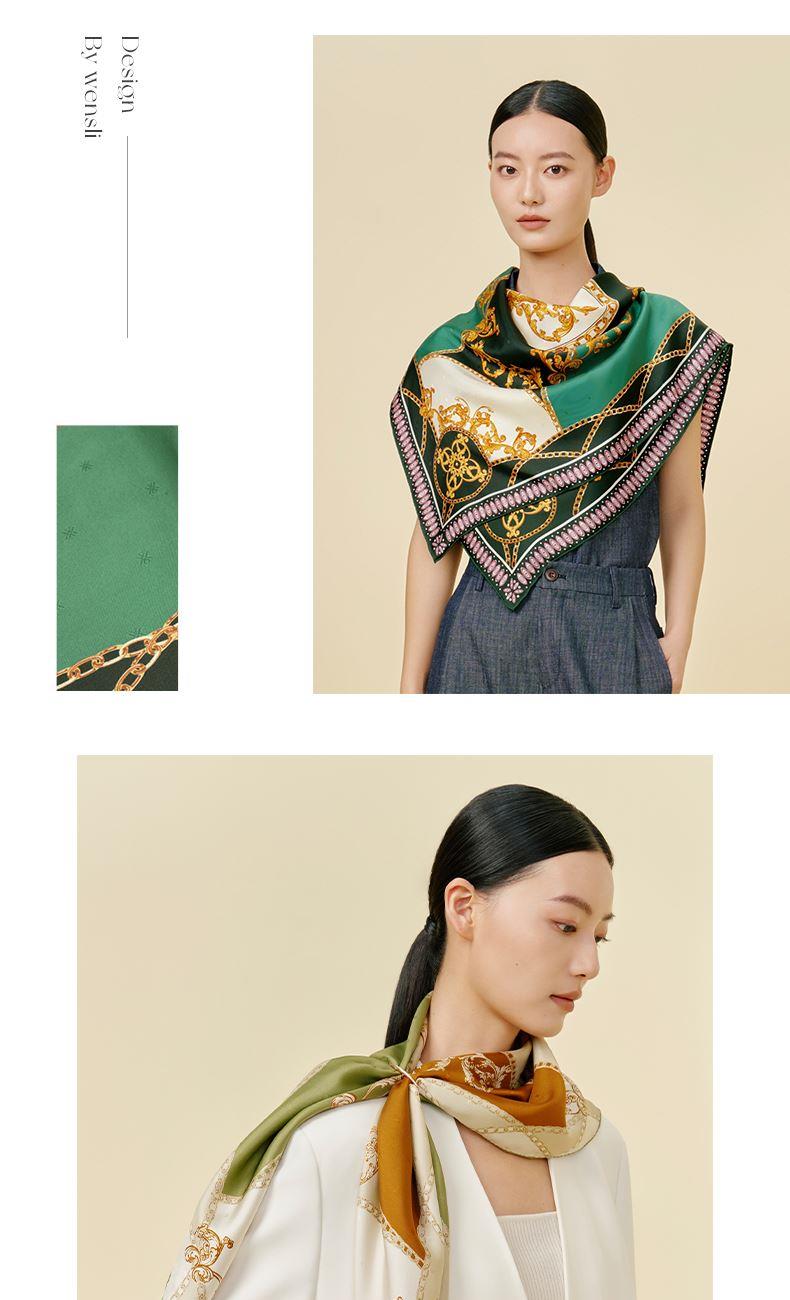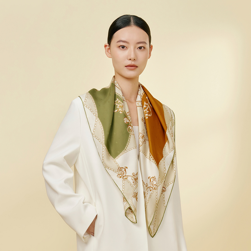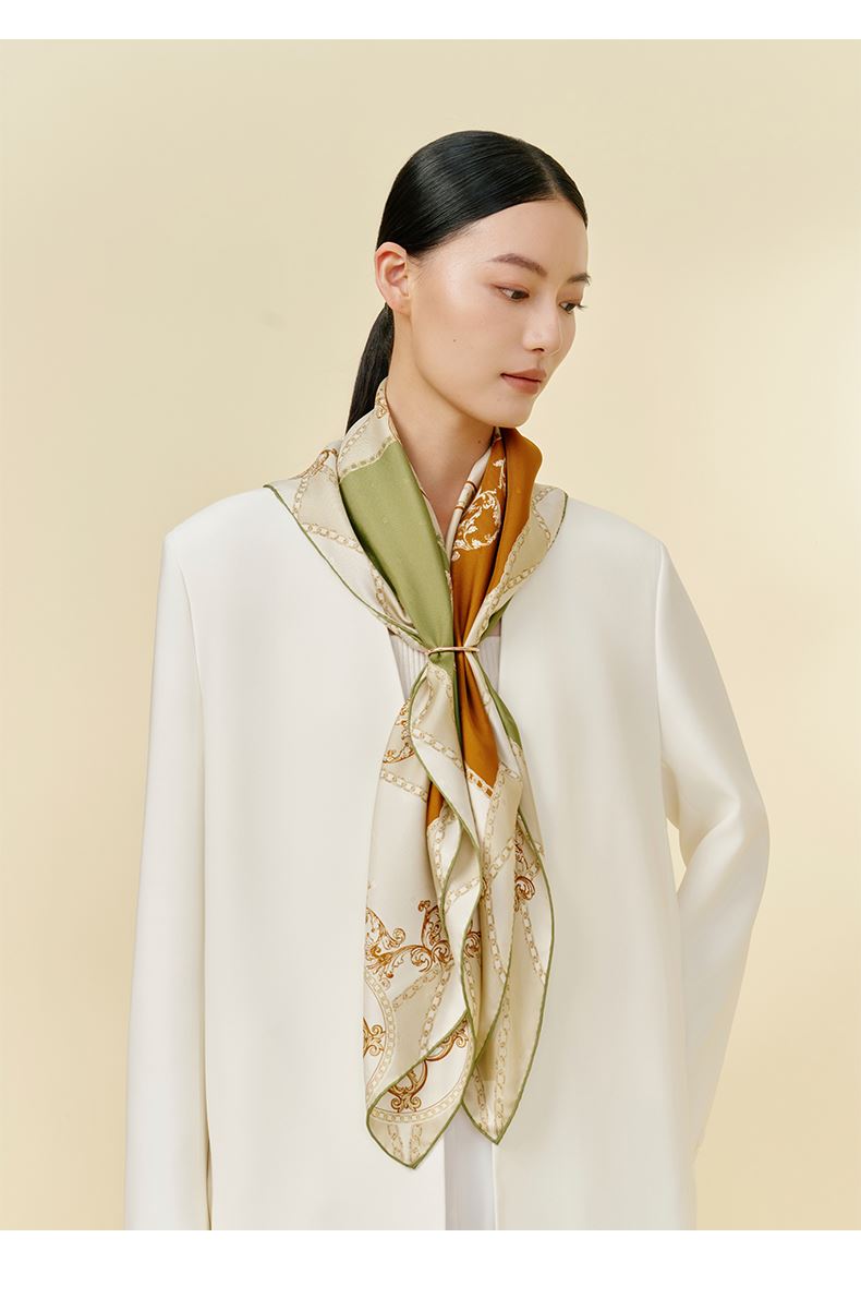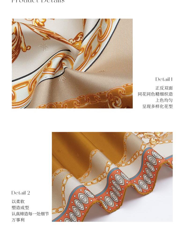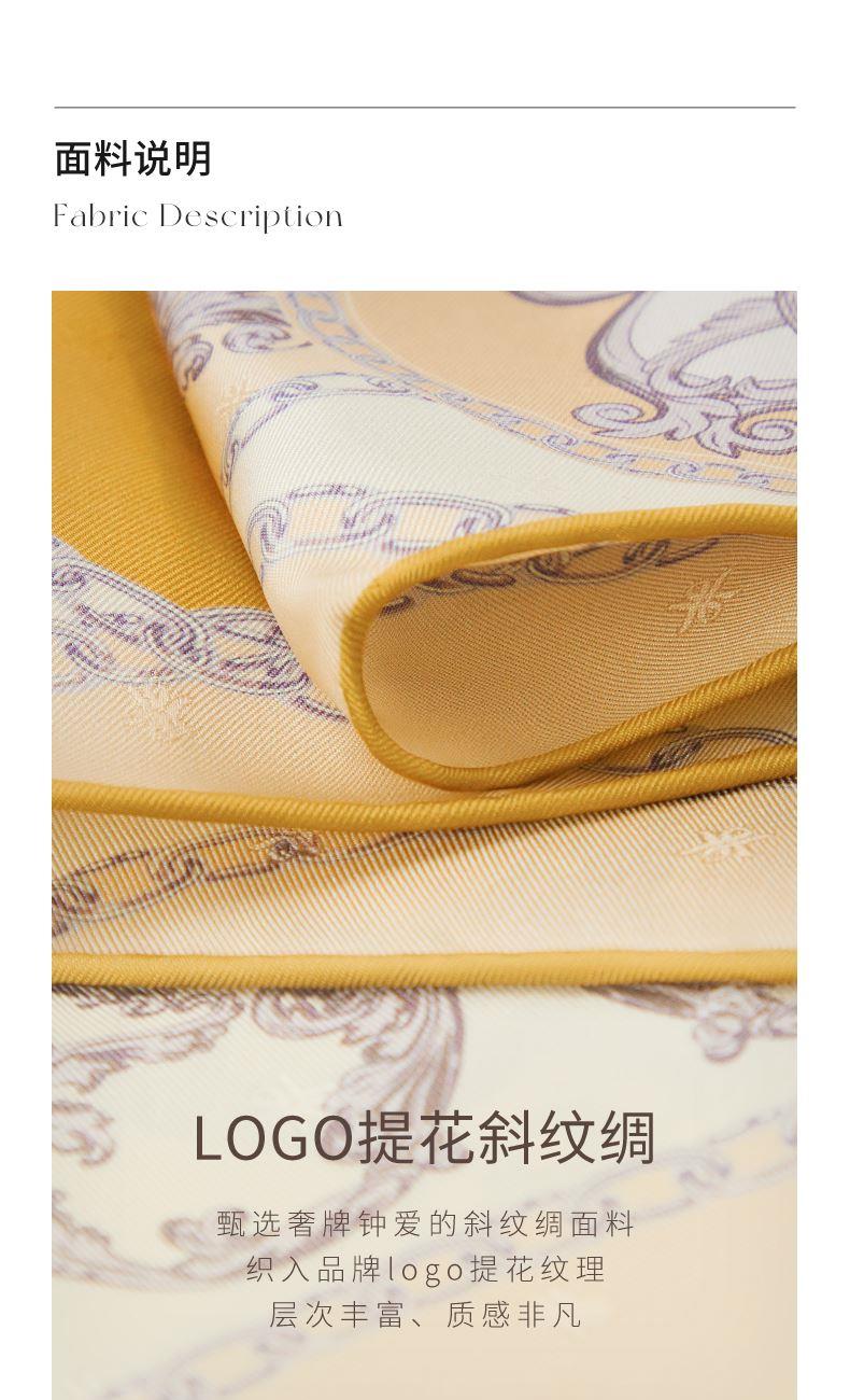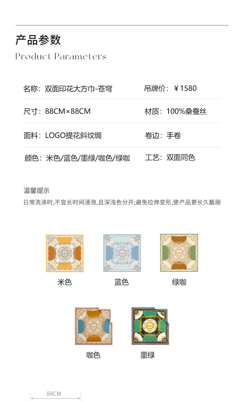 尺寸:88CM×88CM 材质:100桑蚕丝 面料:LOGO提花斜纹绸 卷边:手卷 颜色:米色/蓝色/墨绿/咖色/绿咖 工艺:双面同色