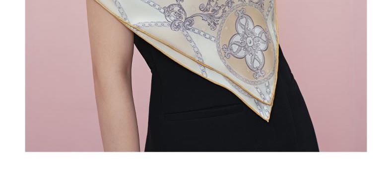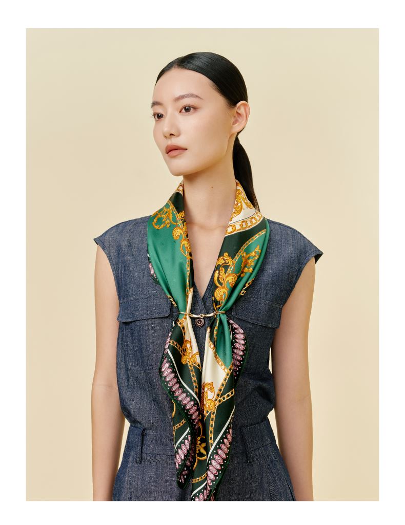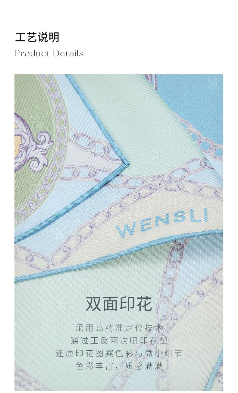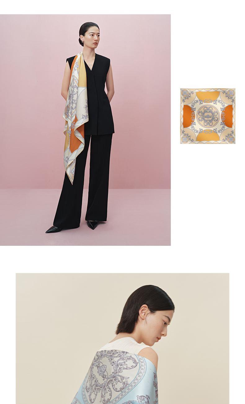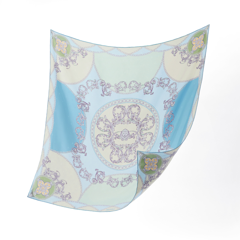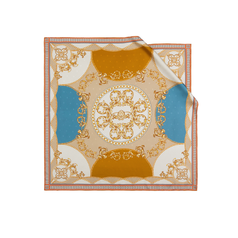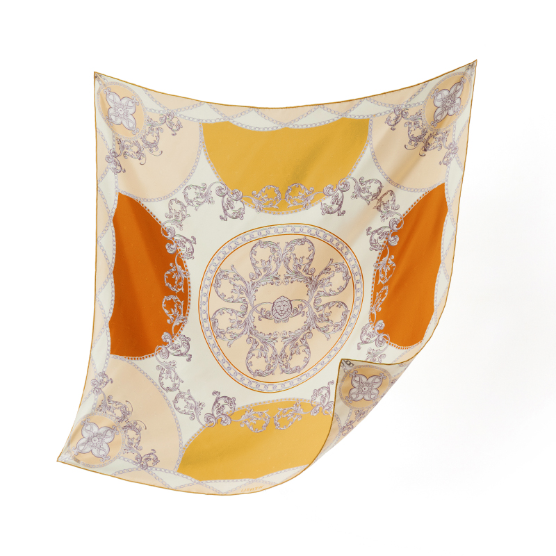 尺寸:88CM×88CM 材质:100桑蚕丝 面料:LOGO提花斜纹绸 卷边:手卷 颜色:米色/蓝色/墨绿/咖色/绿咖 工艺:双面同色