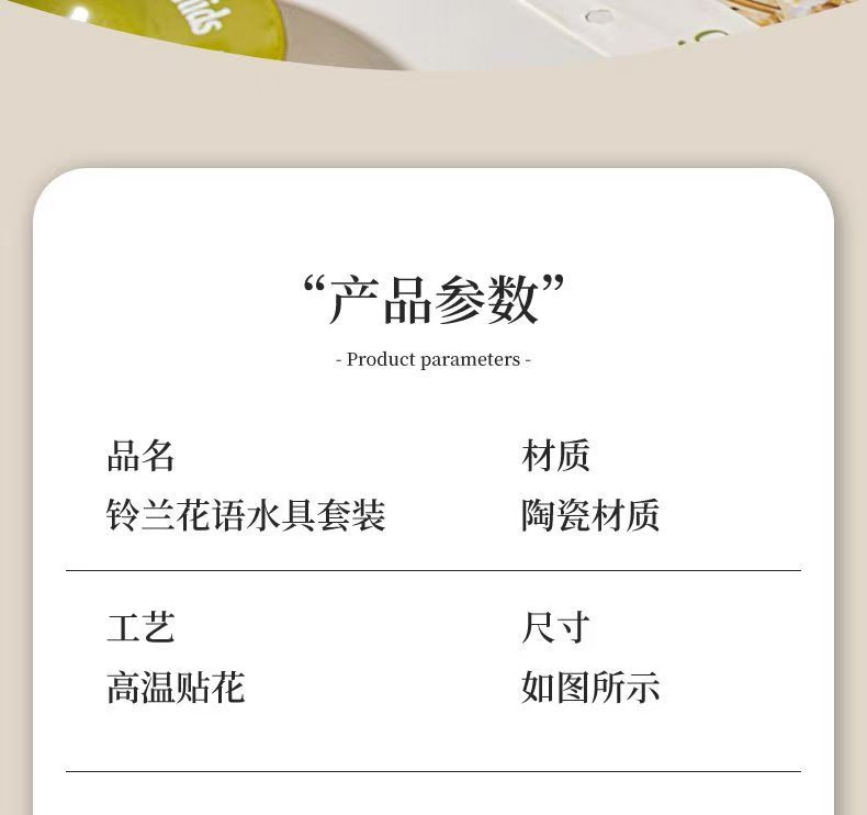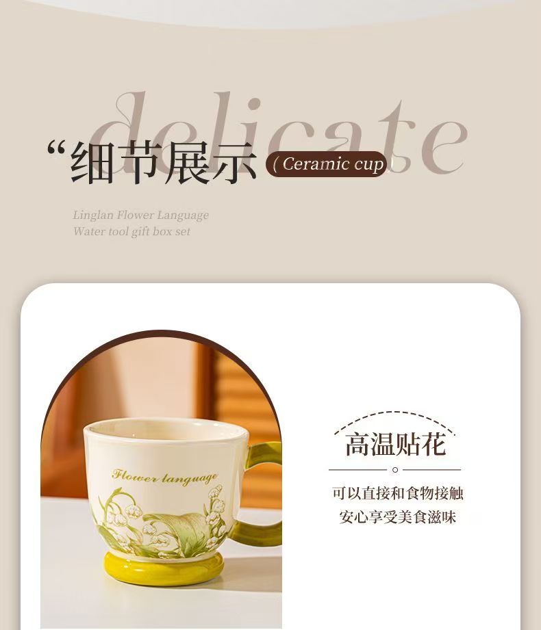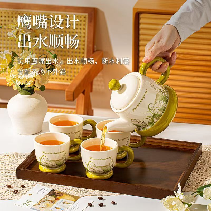 清新铃兰手绘:奶白瓷底搭配清新铃兰纹样,绿釉点缀,像把春日林间的铃兰摘进了杯壶里,温柔又温馨。