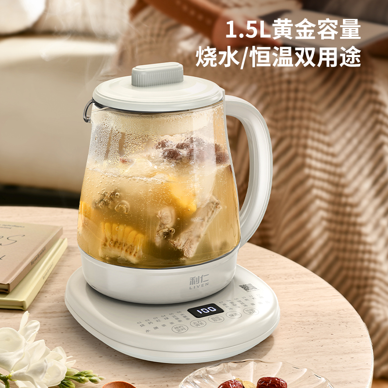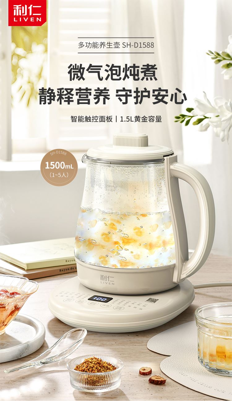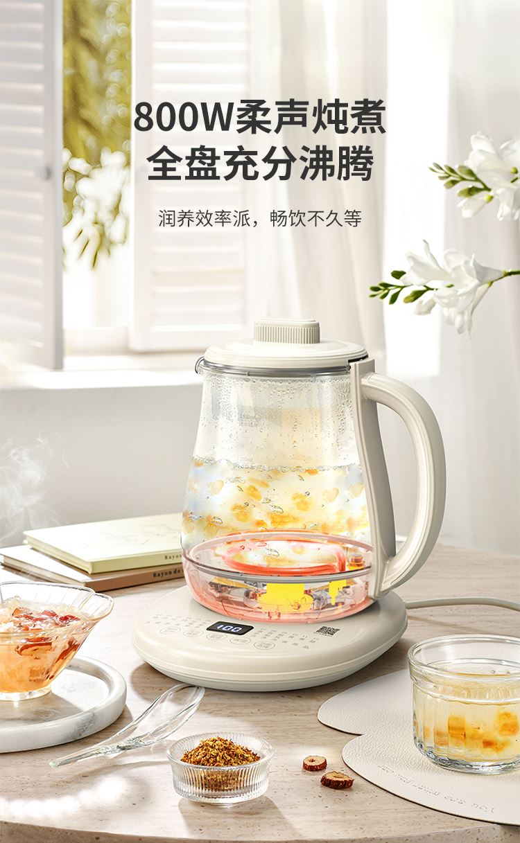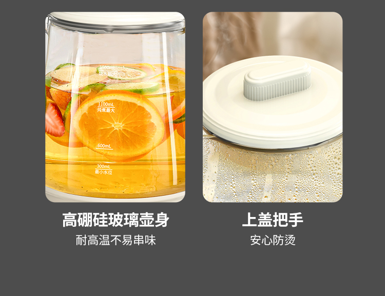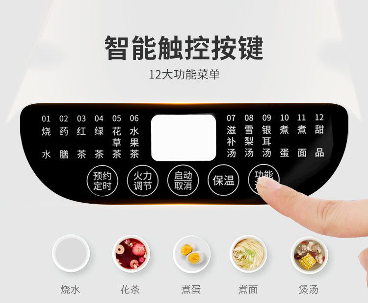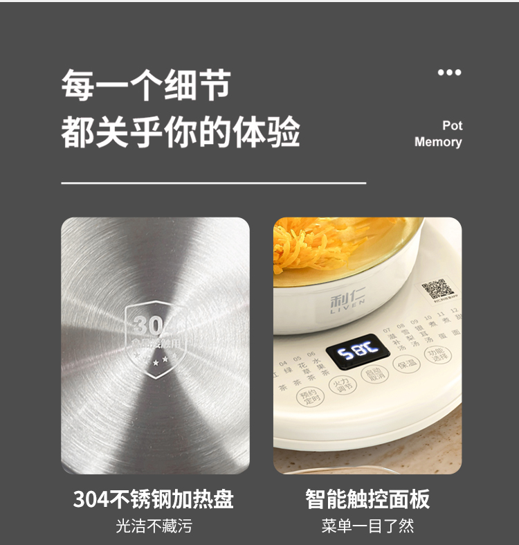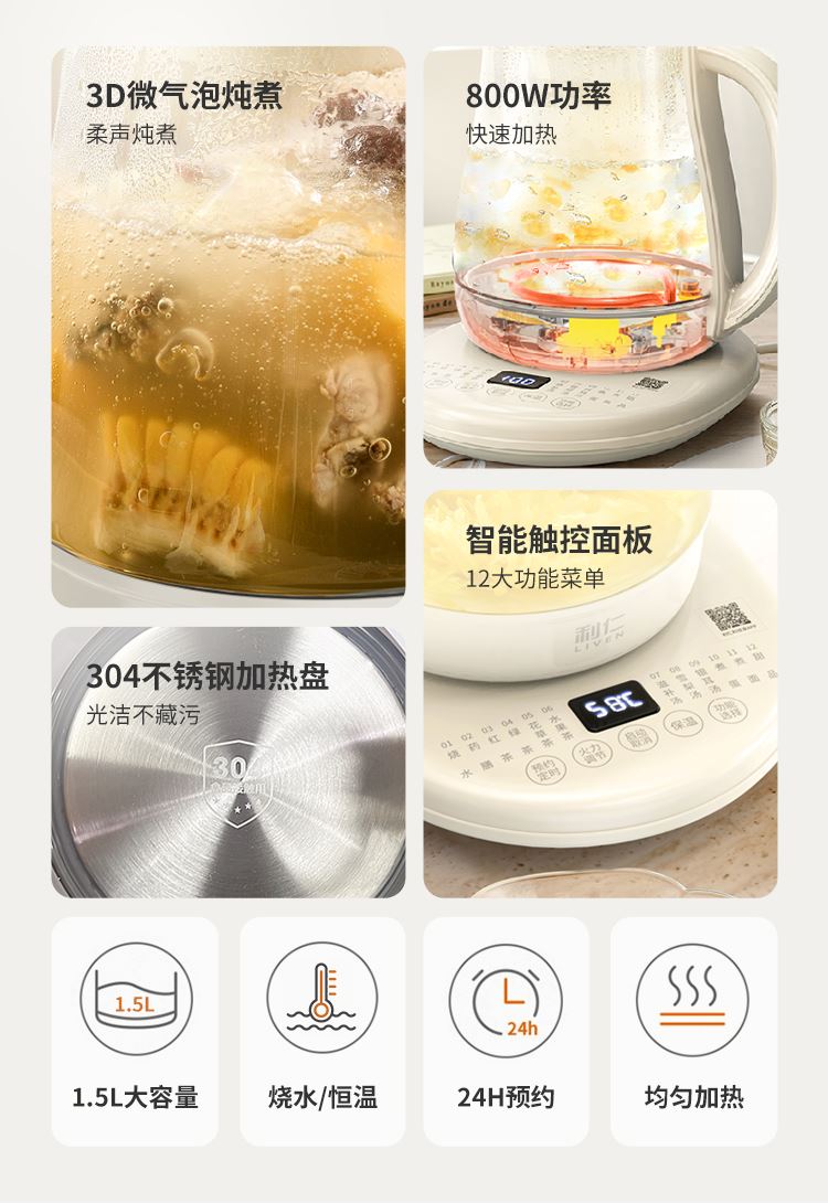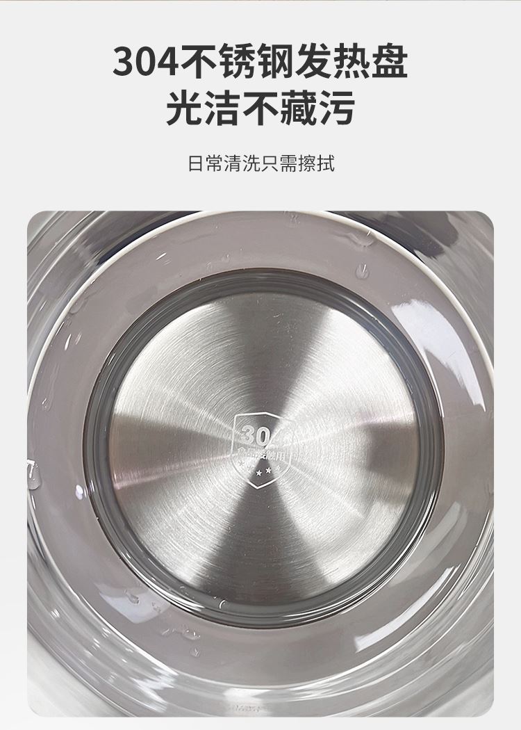 304不锈钢发热盘,光洁不藏污 12大功能菜单,多菜单更简单 24H智能预约,壶内温热等你品味 V型壶嘴倒水流畅顺滑水柱不易外溅 智能触控面板菜单一目了然 高硼硅玻璃壶身耐高温不易串味