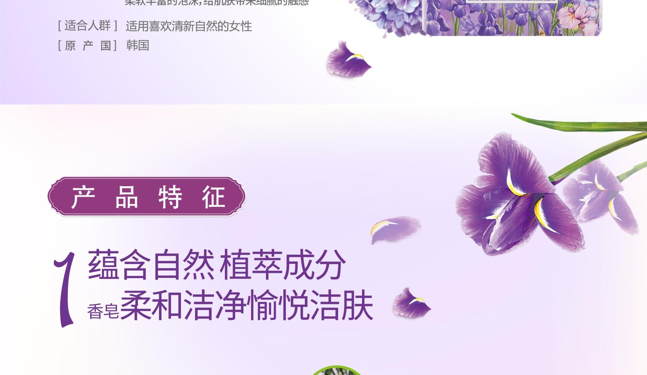 韩国进口,蕴含自然植萃成分,香皂柔和洁净愉悦洁肤。 润体乳:1、香水配方,持久留香; 2、添加3钟保湿精油保湿身体乳; 3、低刺激配方,5不添加敏感肌肤也使用(不添加甲酸酯、人工色素、三乙醇胺、丙二醇、矿物油)
