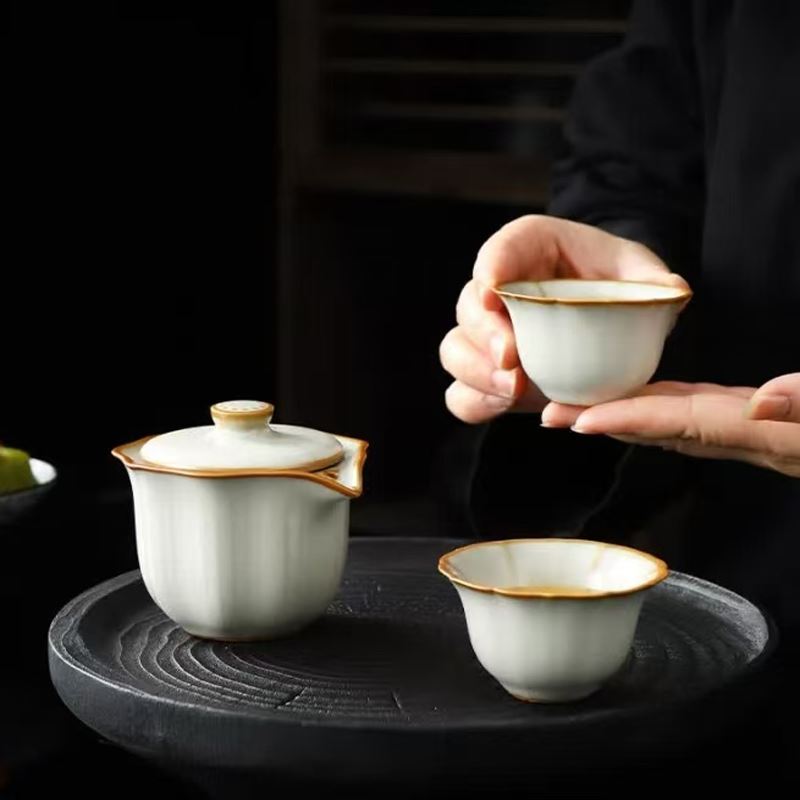 鹏翼亚黄汝窑胡桃木茶盘套装