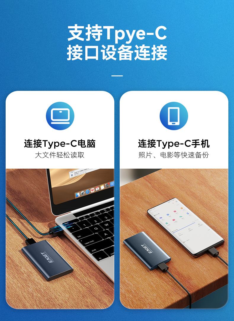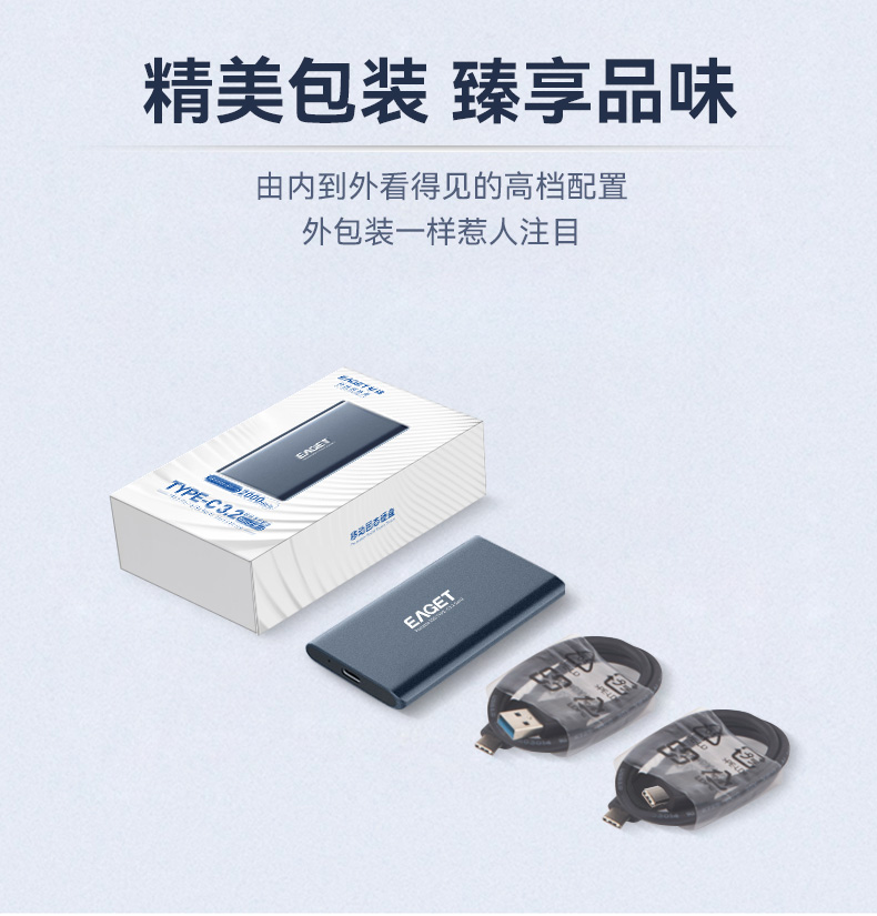 采用Type-C/USB3.2接口 固态TLC高速传输 电镀商务蓝金属效果,美观大气 专属礼盒包装,送礼佳品 产品尺寸:88*46*7.6mm 包装尺寸:135*80*30mm 单品重量:50g