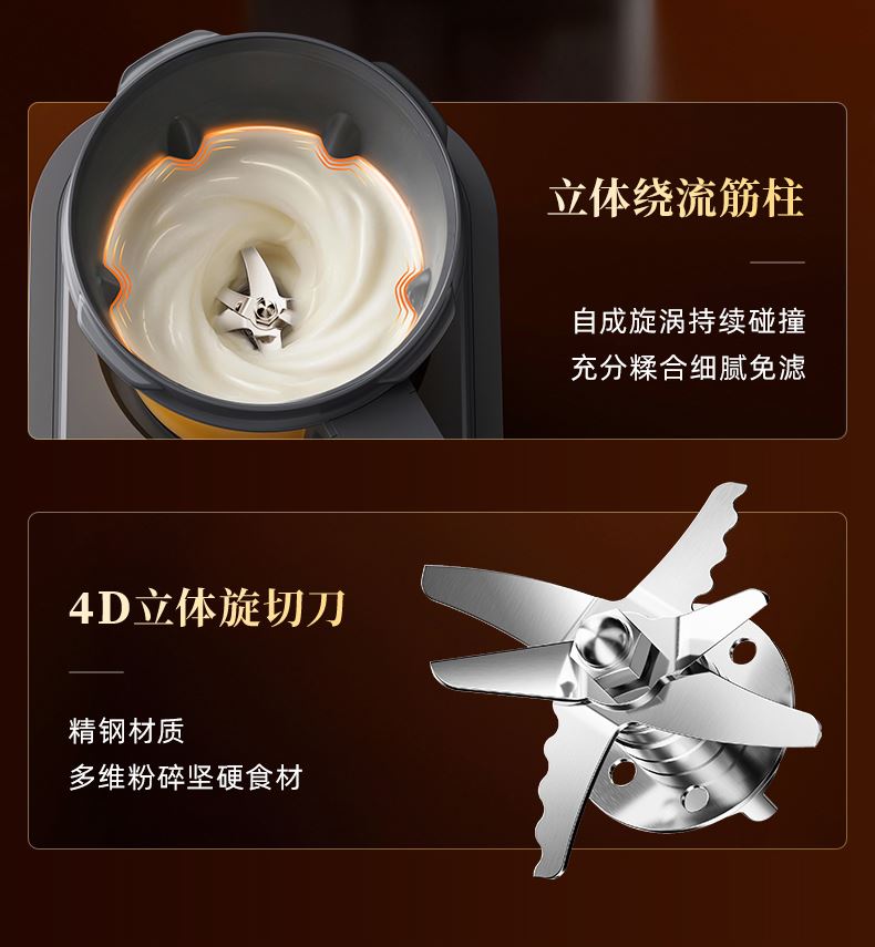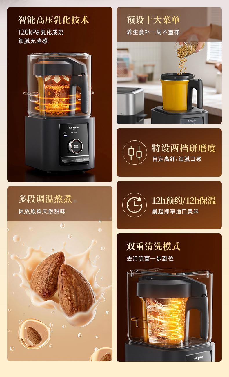1.智能高压乳化技术,120kPa乳化成奶,大豆粒径低至0.76μm,细腻无渣感 2.特设两档研磨度,多段调温熬煮,释放原料天然甜味 3.12小时预约保温,高温烘洗,热烘 4.预设10大菜单,养生食补一周不重样,醇豆奶 坚果奶 花生奶 燕麦奶 玉米汁 五谷浆 快浆 果蔬汁 奶昔 营养粥