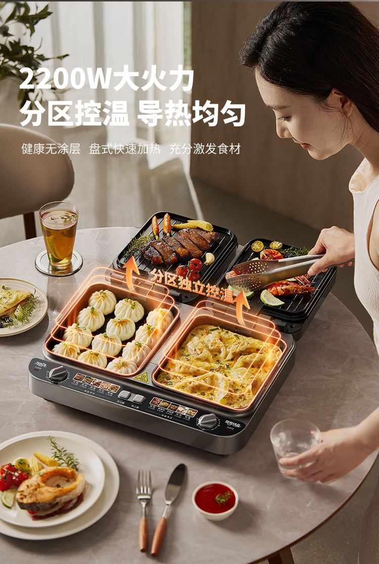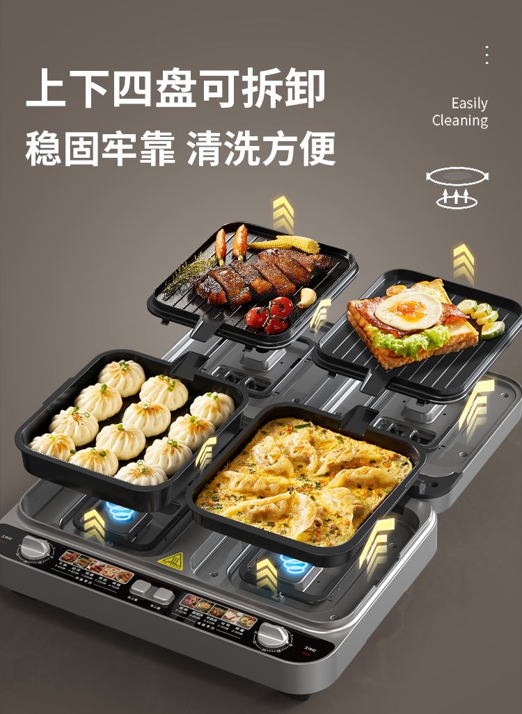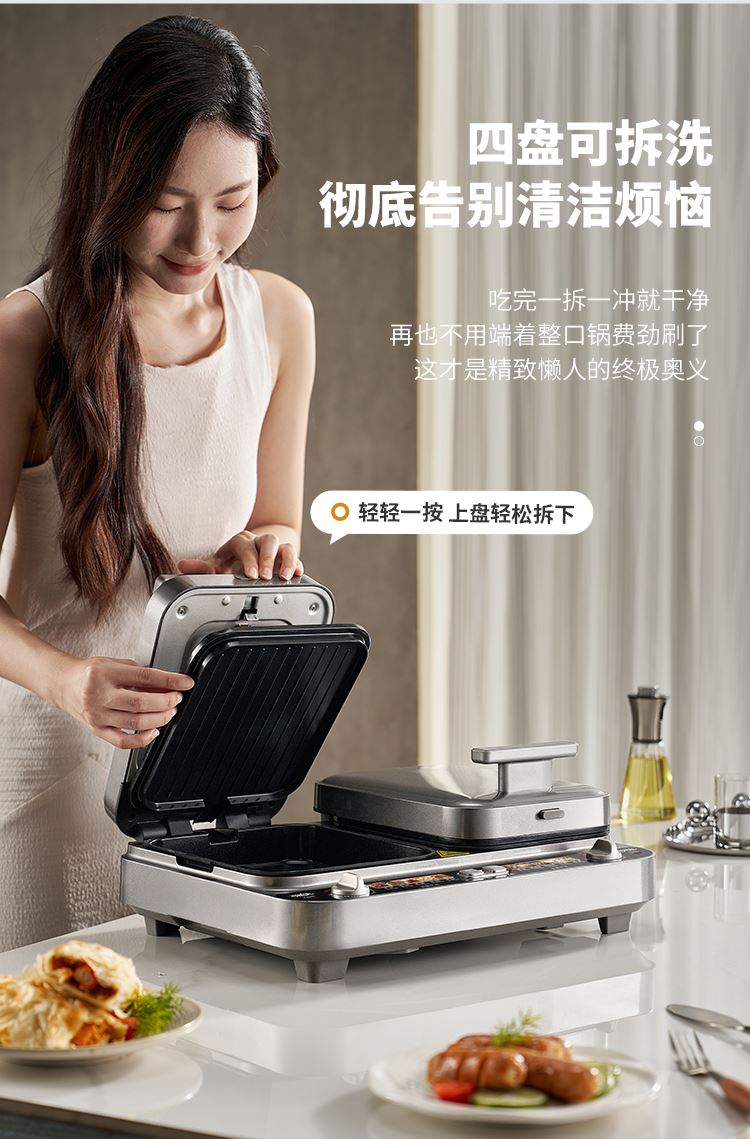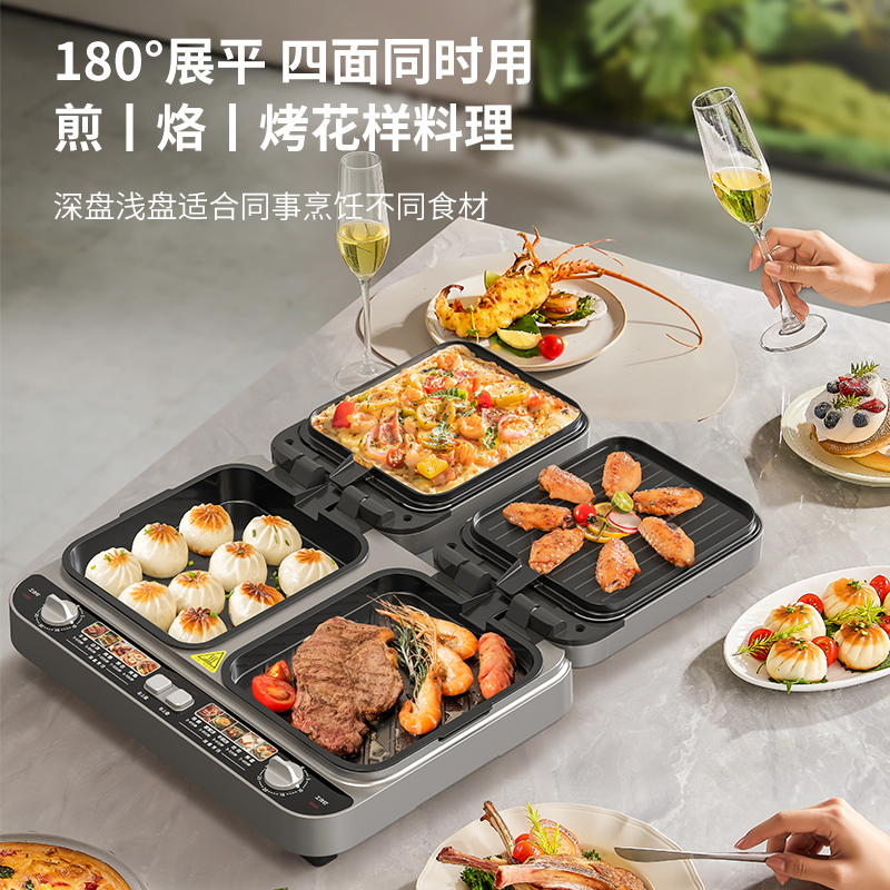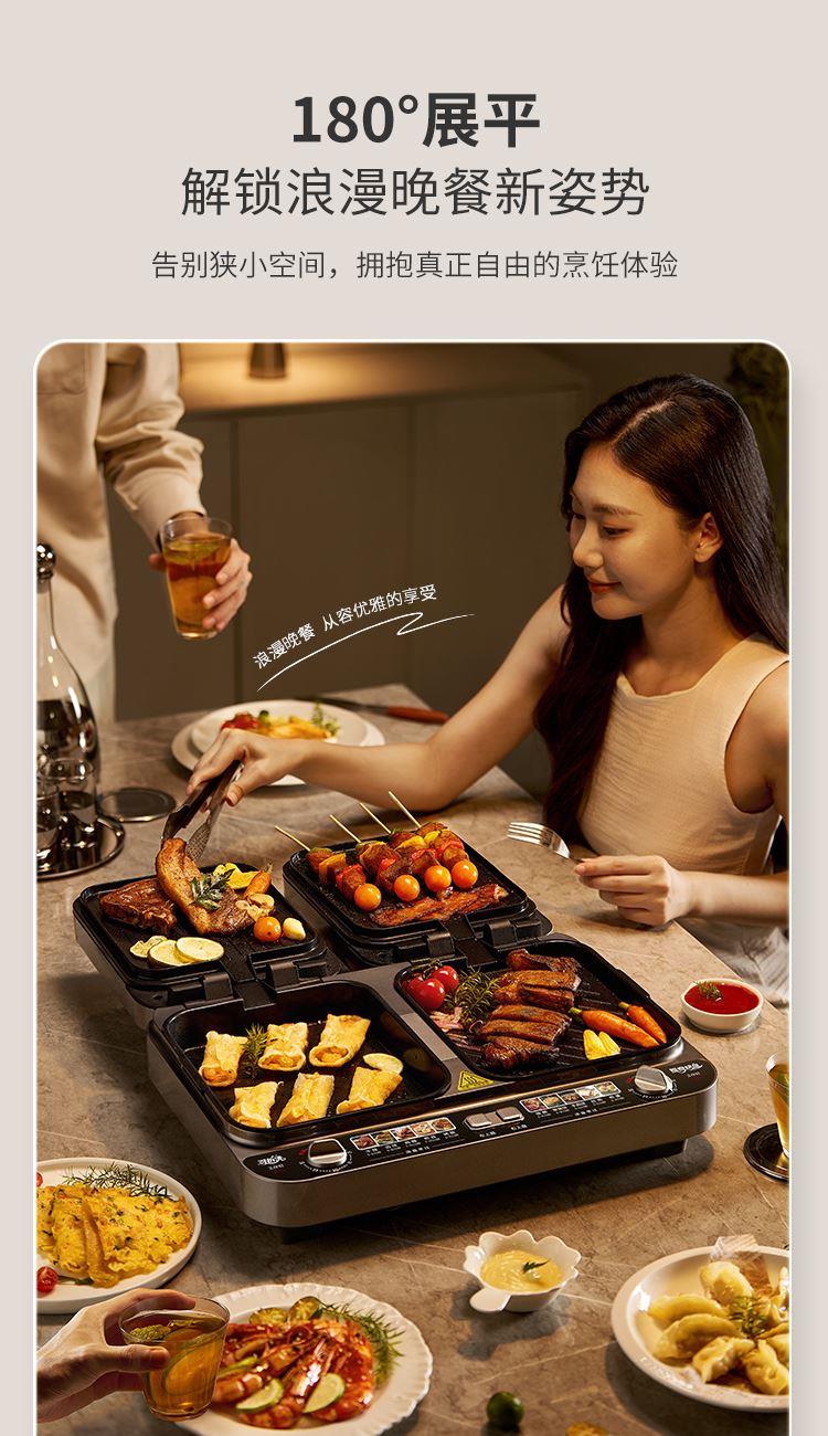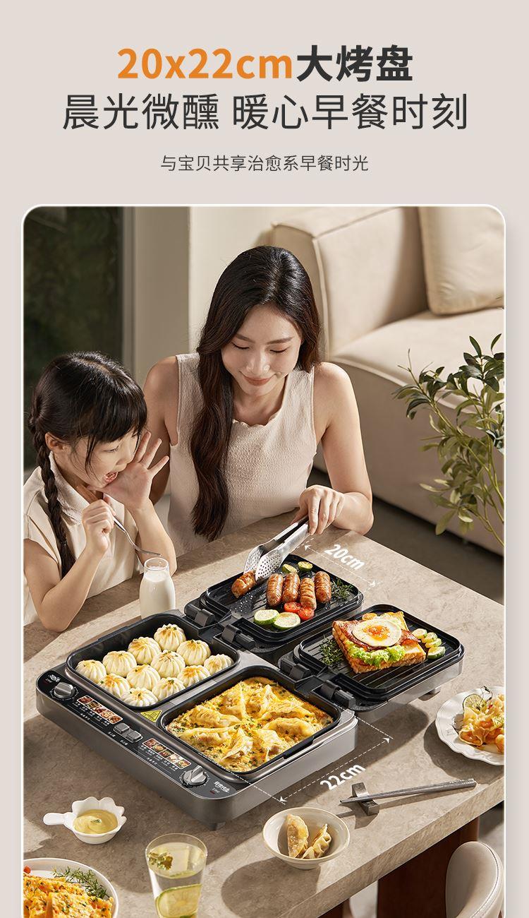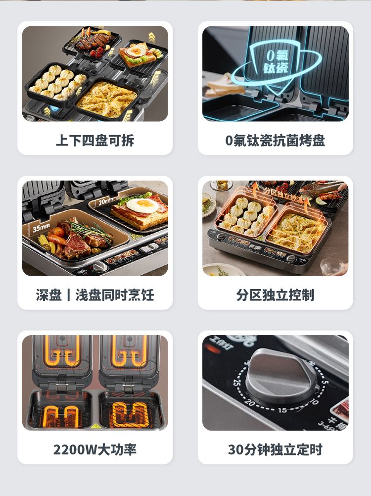 上下四盘可拆,告别清洁烦恼 0氟钛瓷烤盘 ,耐高温健康安心 深盘浅盘同时烹饪,分区独立控制 操作简单,煎,烤,烙一机搞定 10大指引菜单,多样料理简单做