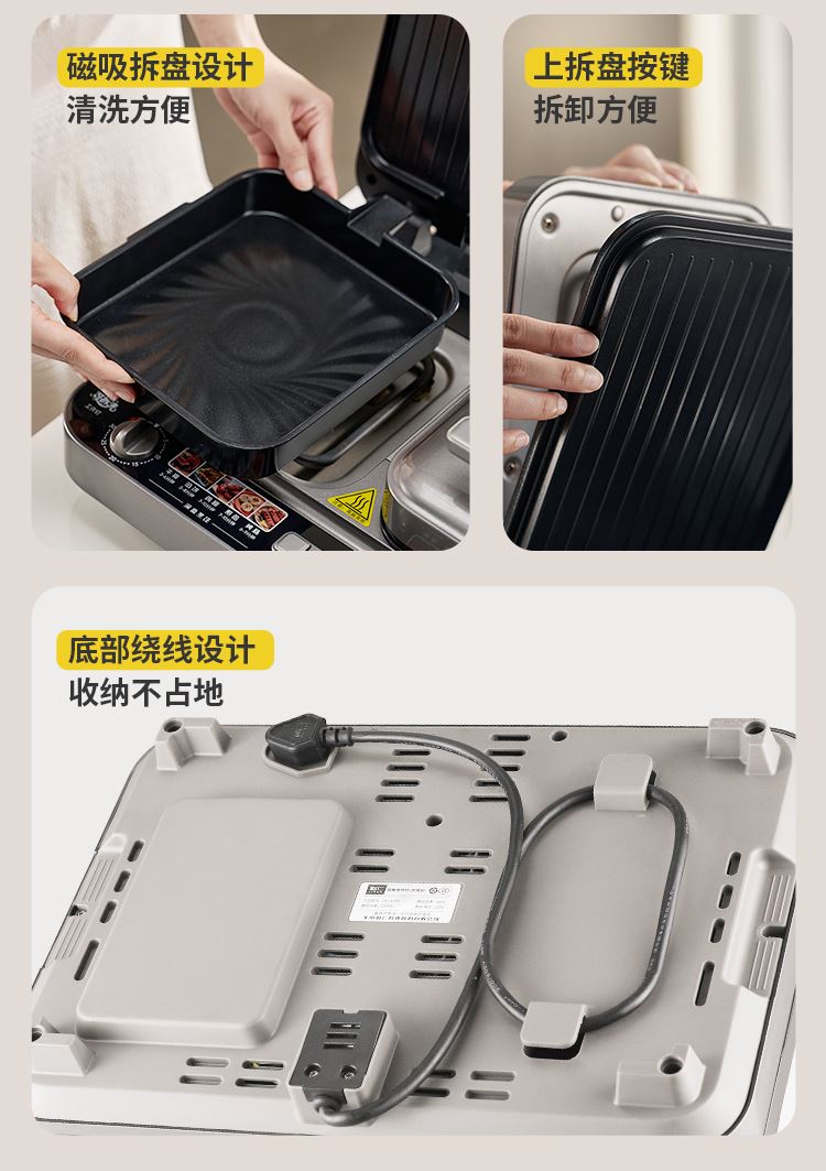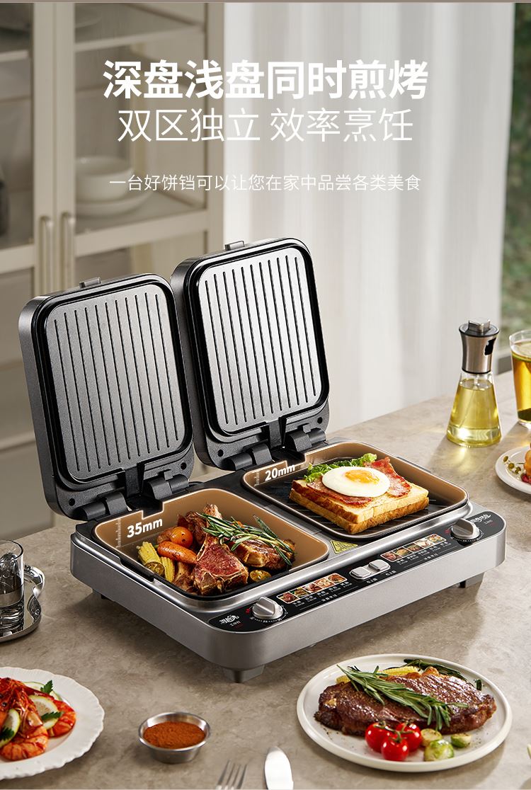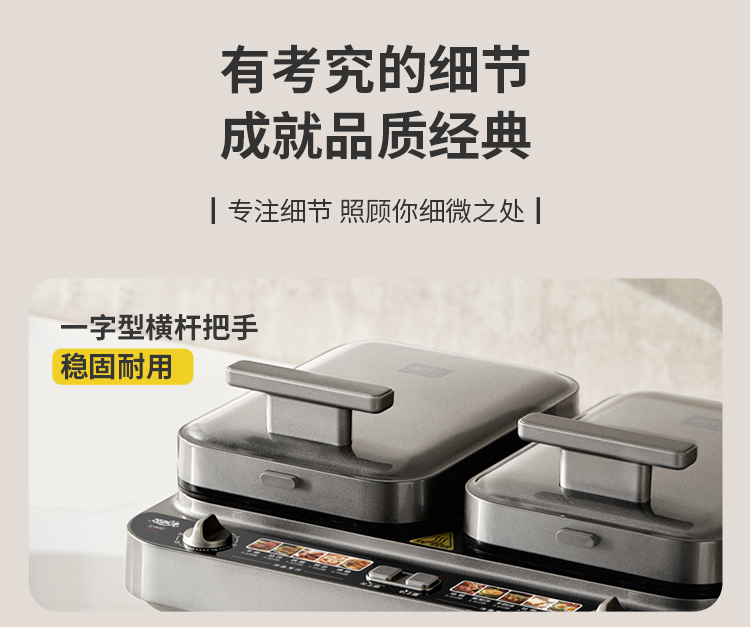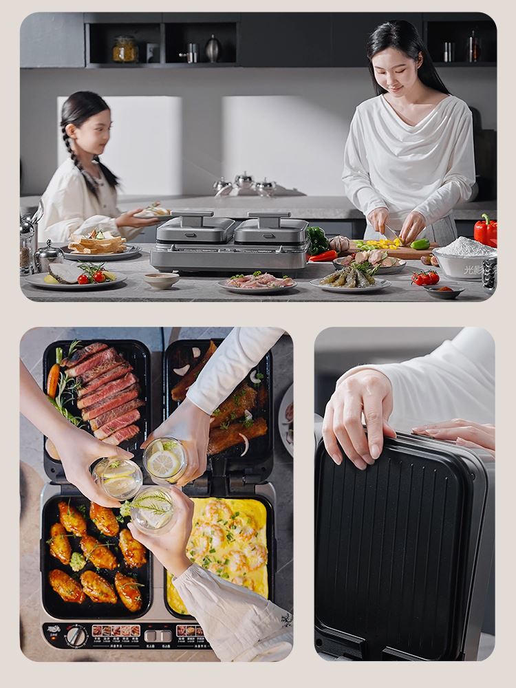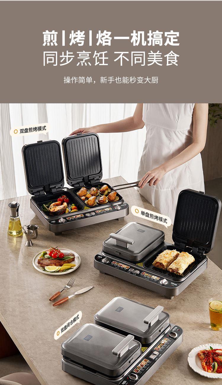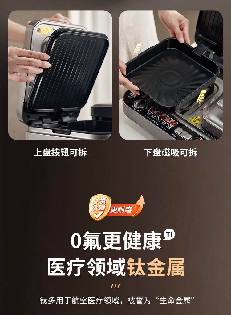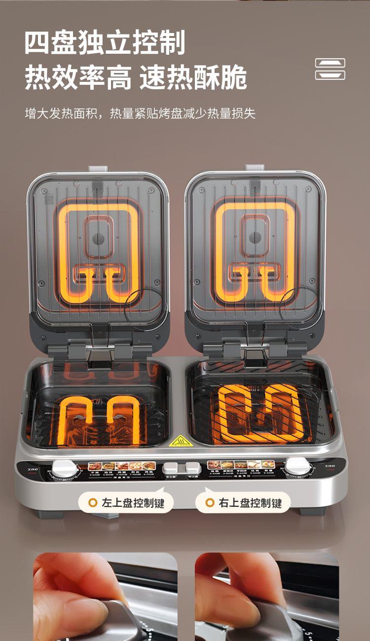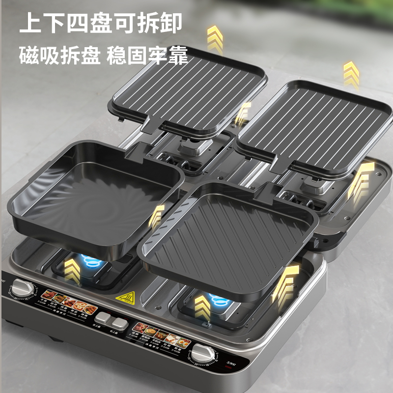 上下四盘可拆,告别清洁烦恼 0氟钛瓷烤盘 ,耐高温健康安心 深盘浅盘同时烹饪,分区独立控制 操作简单,煎,烤,烙一机搞定 10大指引菜单,多样料理简单做