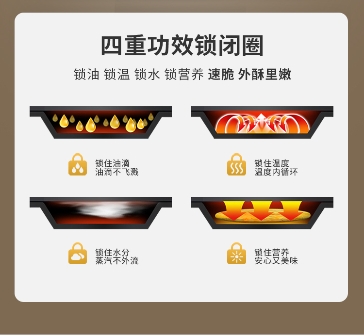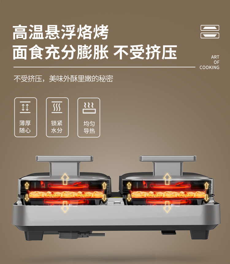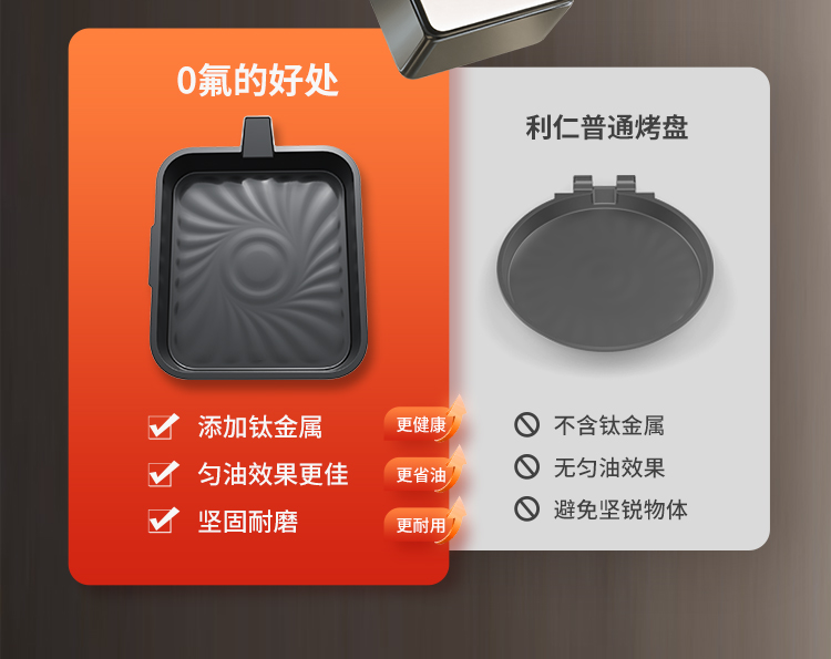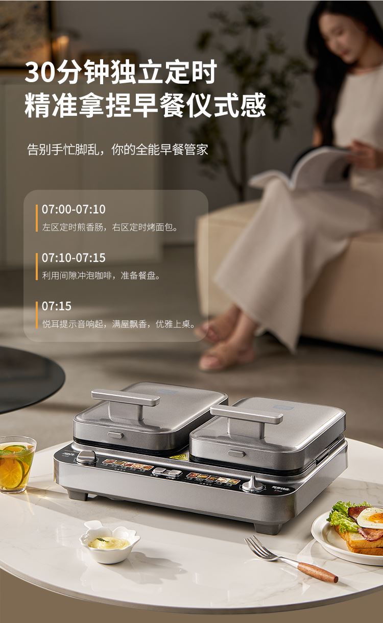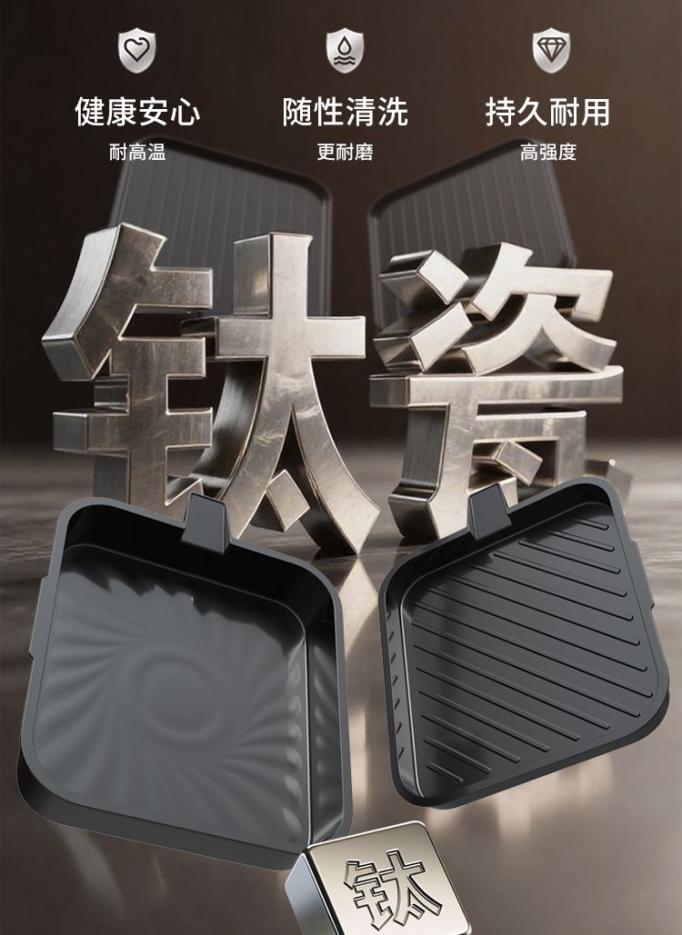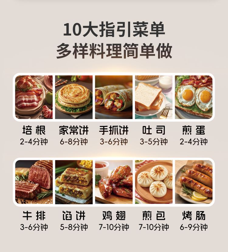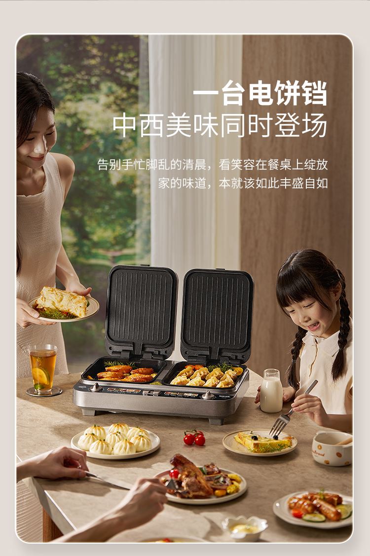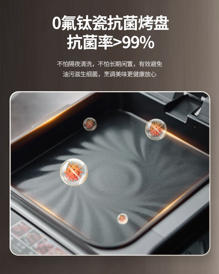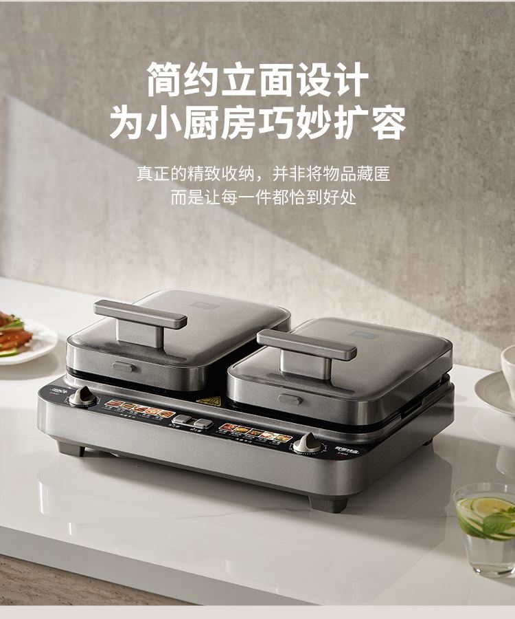 上下四盘可拆,告别清洁烦恼 0氟钛瓷烤盘 ,耐高温健康安心 深盘浅盘同时烹饪,分区独立控制 操作简单,煎,烤,烙一机搞定 10大指引菜单,多样料理简单做