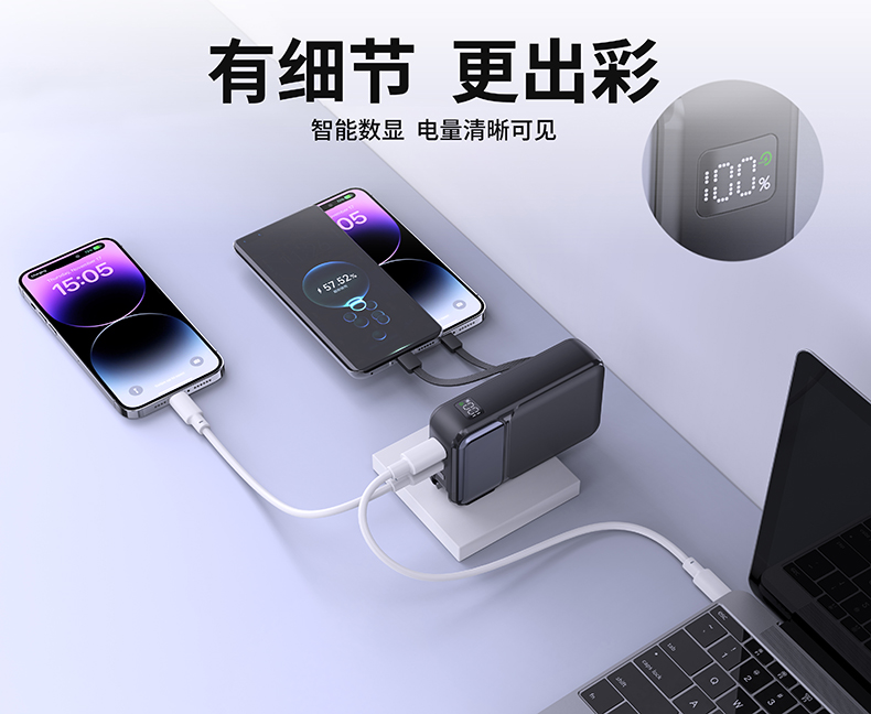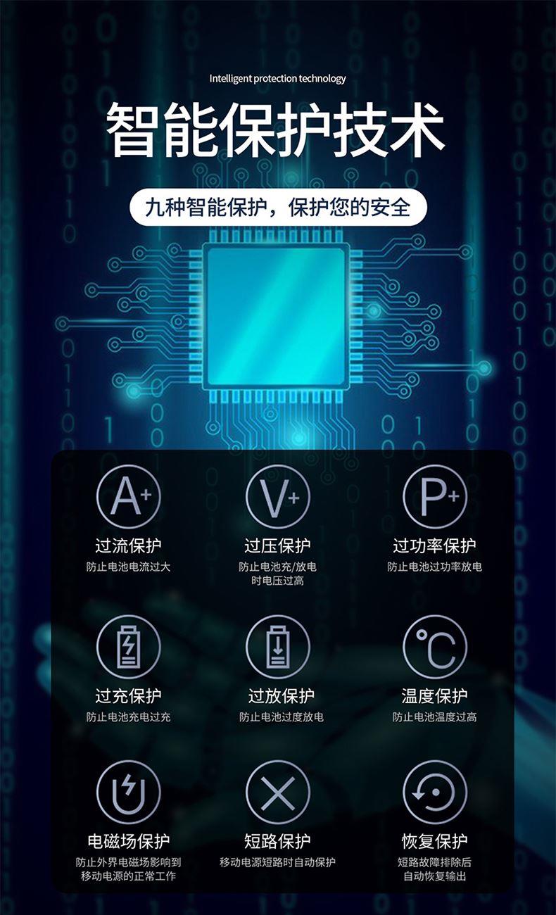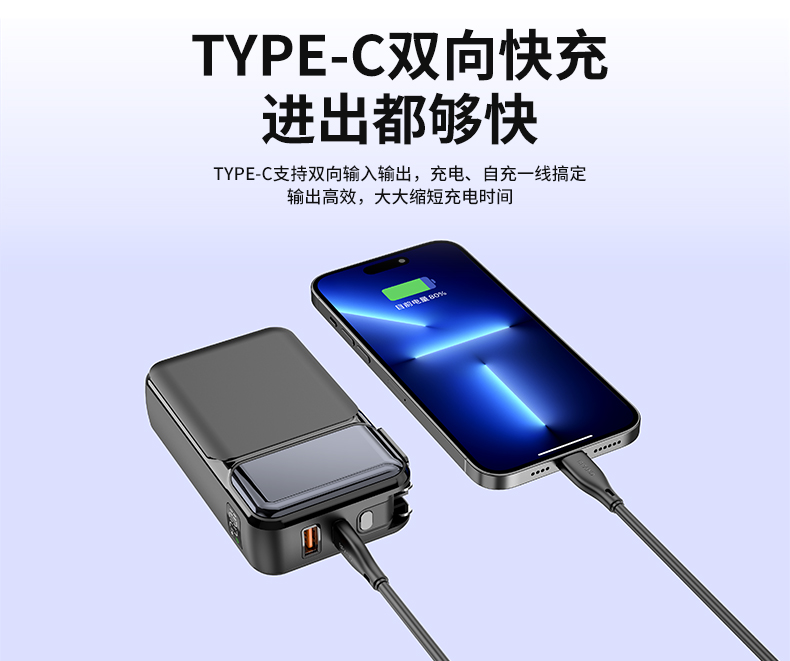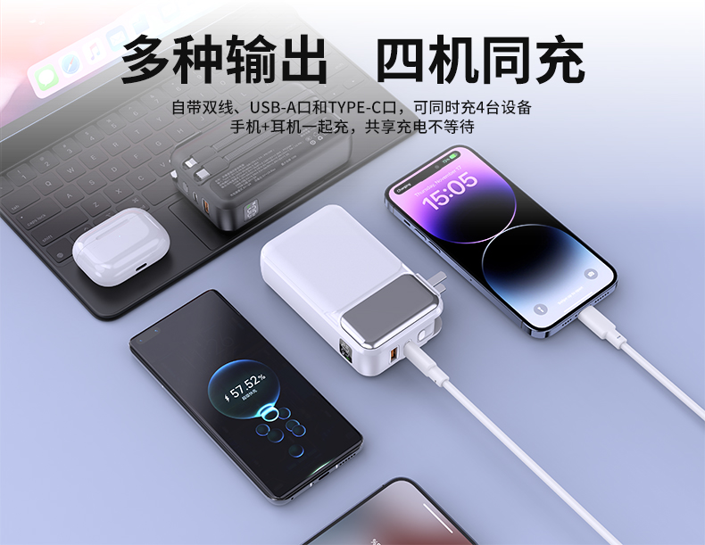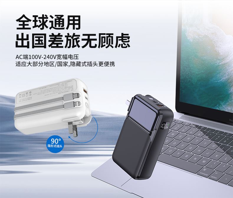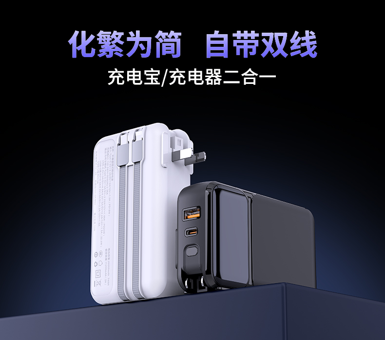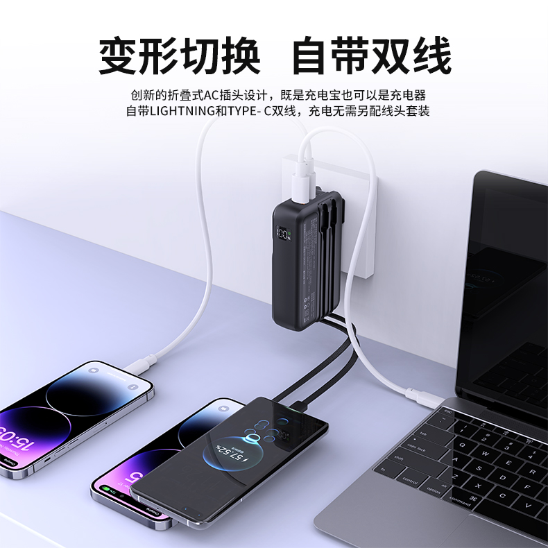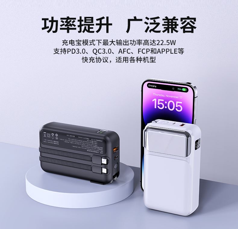 自带双线创新的折叠式AC插头设计,既是充电宝也可以是充电器,充电宝模式下输出功率高达22.5W,支持快充协议,适用各种机型充电/自充一线搞定输出高效,可带上飞机