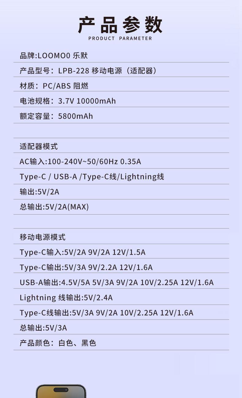 USB-A输出:4.5V=5A 5V=3A 9V=2A 10V=2.25A 12V=1.6A Lightning 线输出:5V=2.4A ;