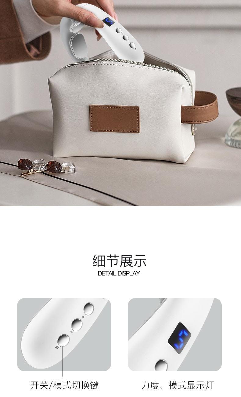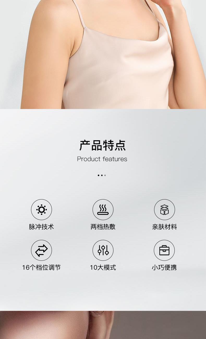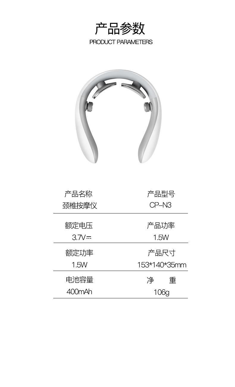颜色:白色 额定电压/功率:3.7V/1.5W 电池:400mAh 产品外形尺寸:153X140X35mm 产品净重:242g 包装清单:主机X1;充电线x1、说明书x1 微电脉冲,马达震动 热敷加热,持久续航 10大模式。16档力度 蜂鸣提示,小巧机身