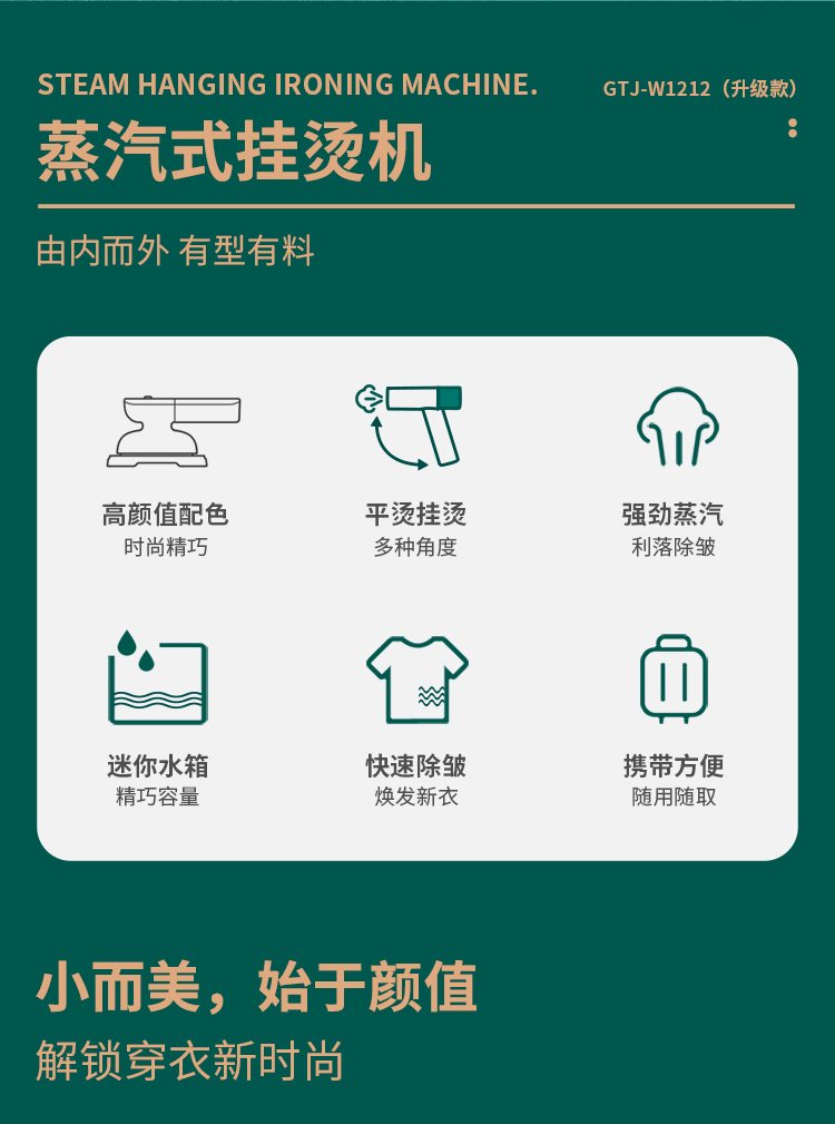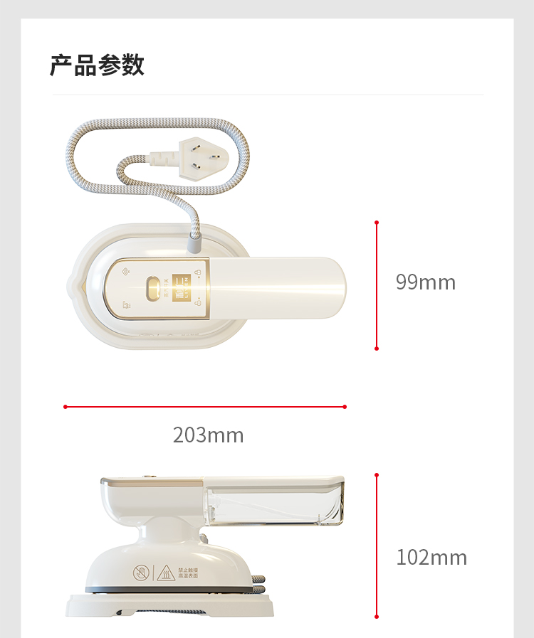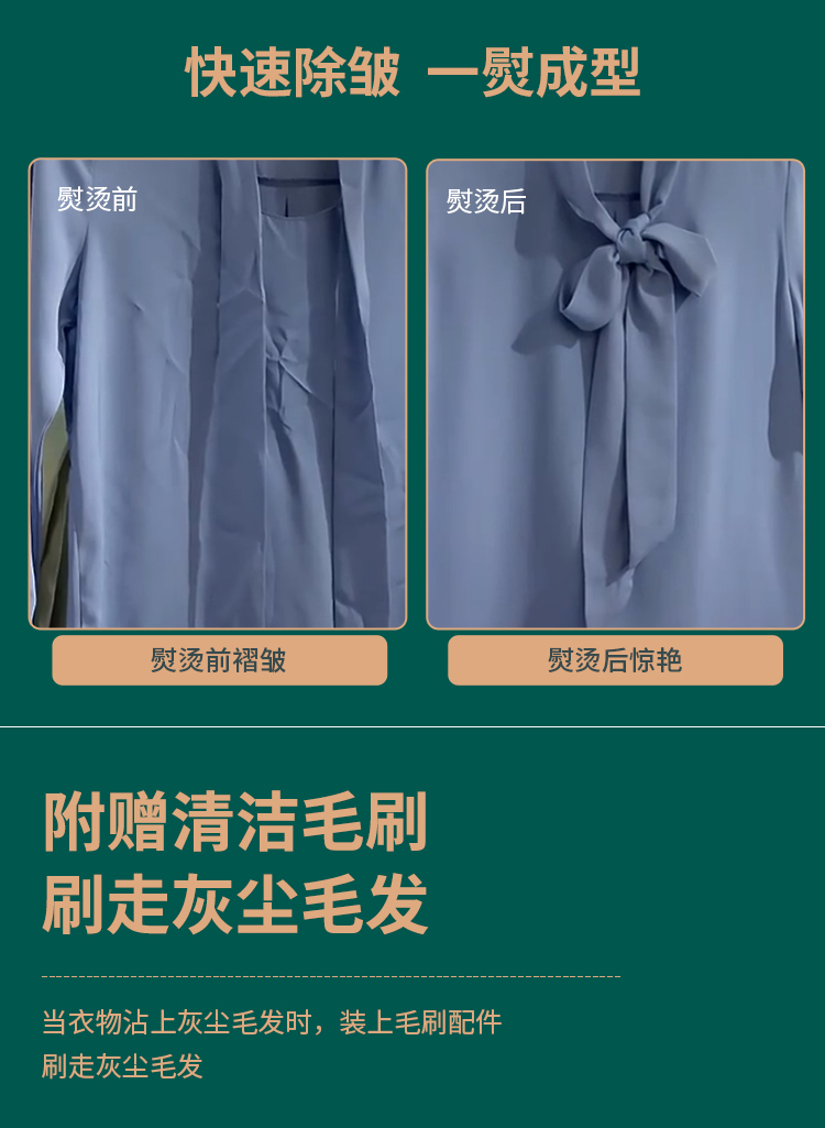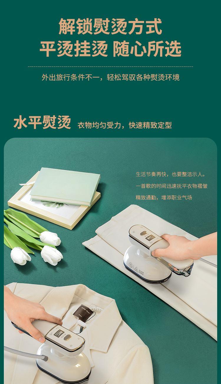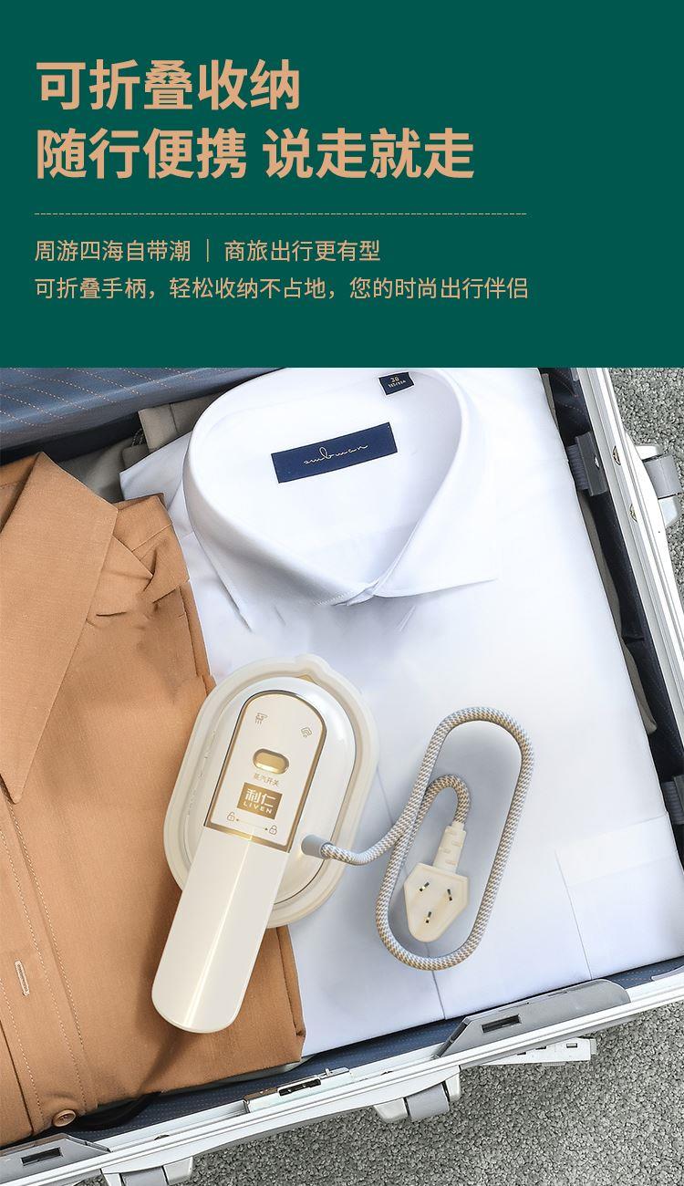 可折叠收纳,随行便捷,说走就走 轻盈握感,手持不累,让你爱不释手 水平熨烫,衣物均匀受力,快速精致定型 附赠清洁毛刷,刷走灰尘毛发 恒温干蒸汽不温衣,即烫即穿 不挑面料,各种面料照料得当