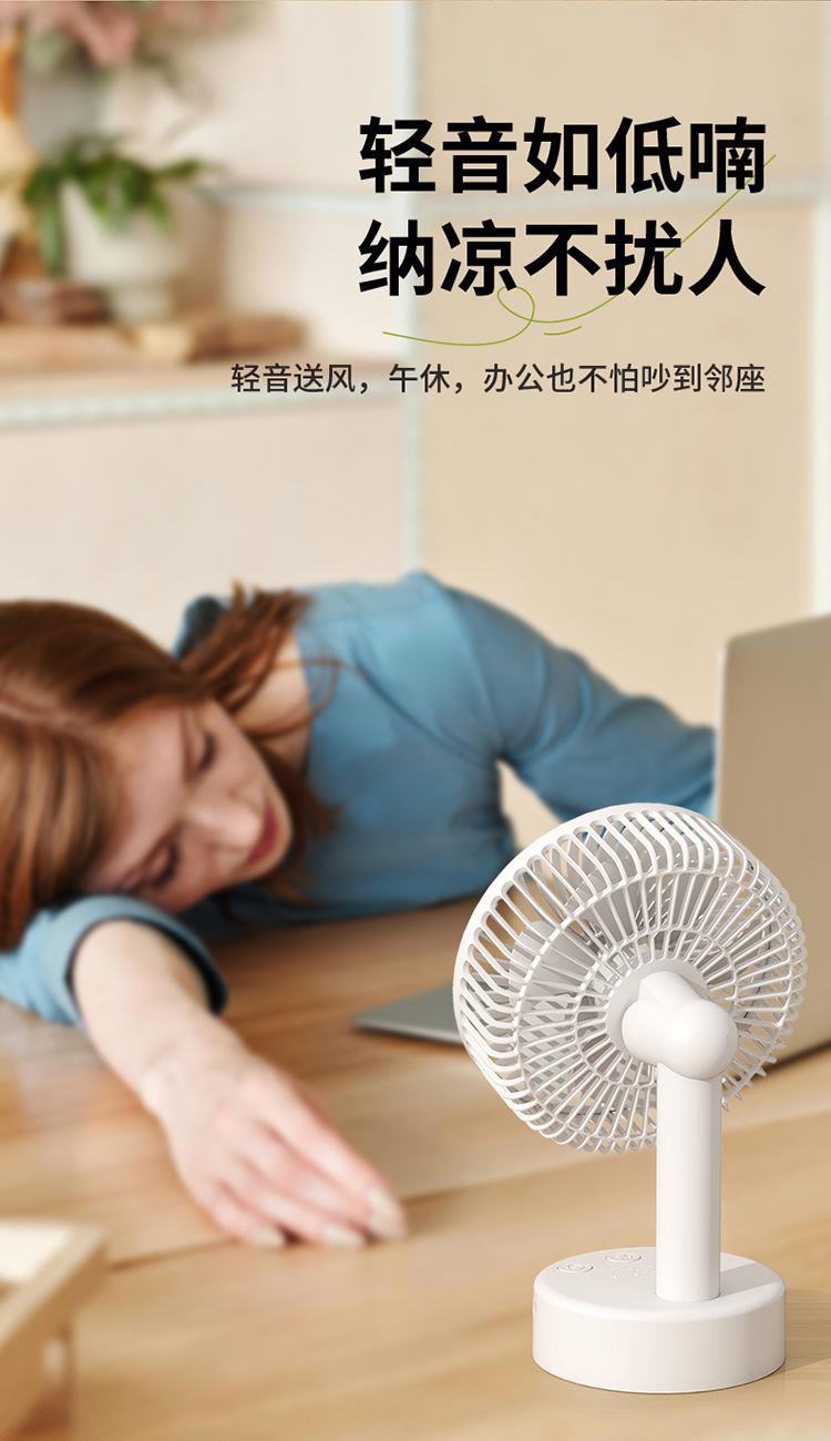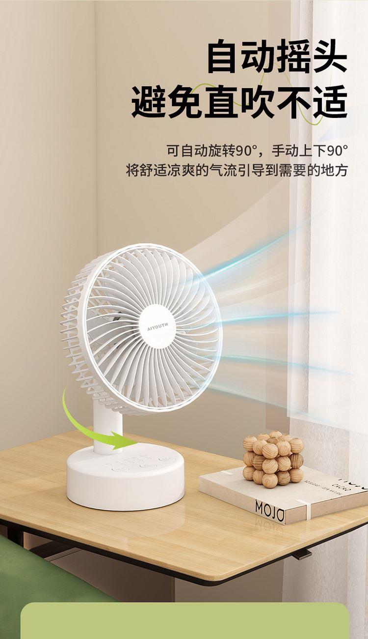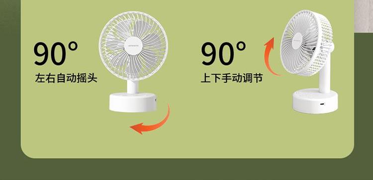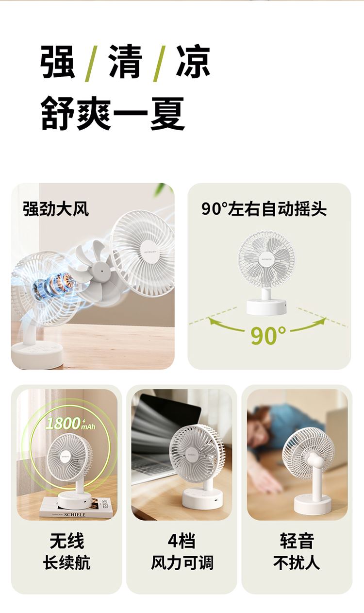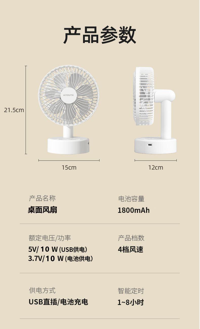 额定功率:10W 额定电压:5V 电池容量:1800mAh 产品颜色:白色 产品毛重:0.52kg/台 包装尺寸:230*160*130mm 包装清单:主机、说明书、数据线 主要材质:ABS 1. 风速/摇头/定时,独立功能按键 2. 四档风速,静怡自然,凉爽 3. 1-8小时定时关机,舒睡自然关机 4. 细密网罩,温馨呵护,不担心夹手 5. 高速无刷电机,运行平稳,有效降噪 6. 逆时针旋转拆卸,轻松拆洗,简单打理 7.90°自动摇头,广角送风 近距离聚焦风力