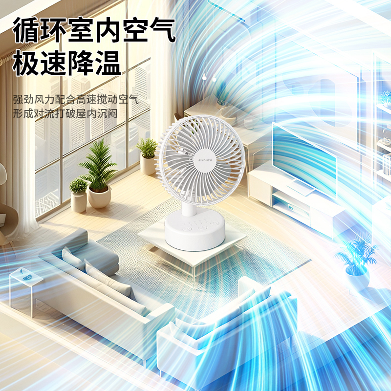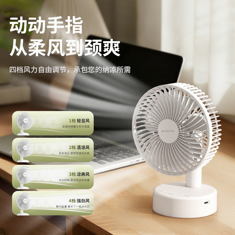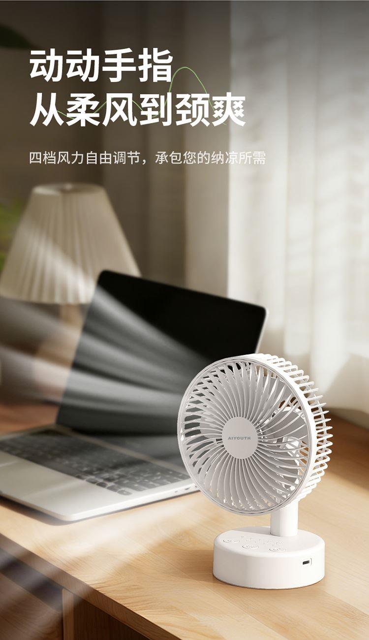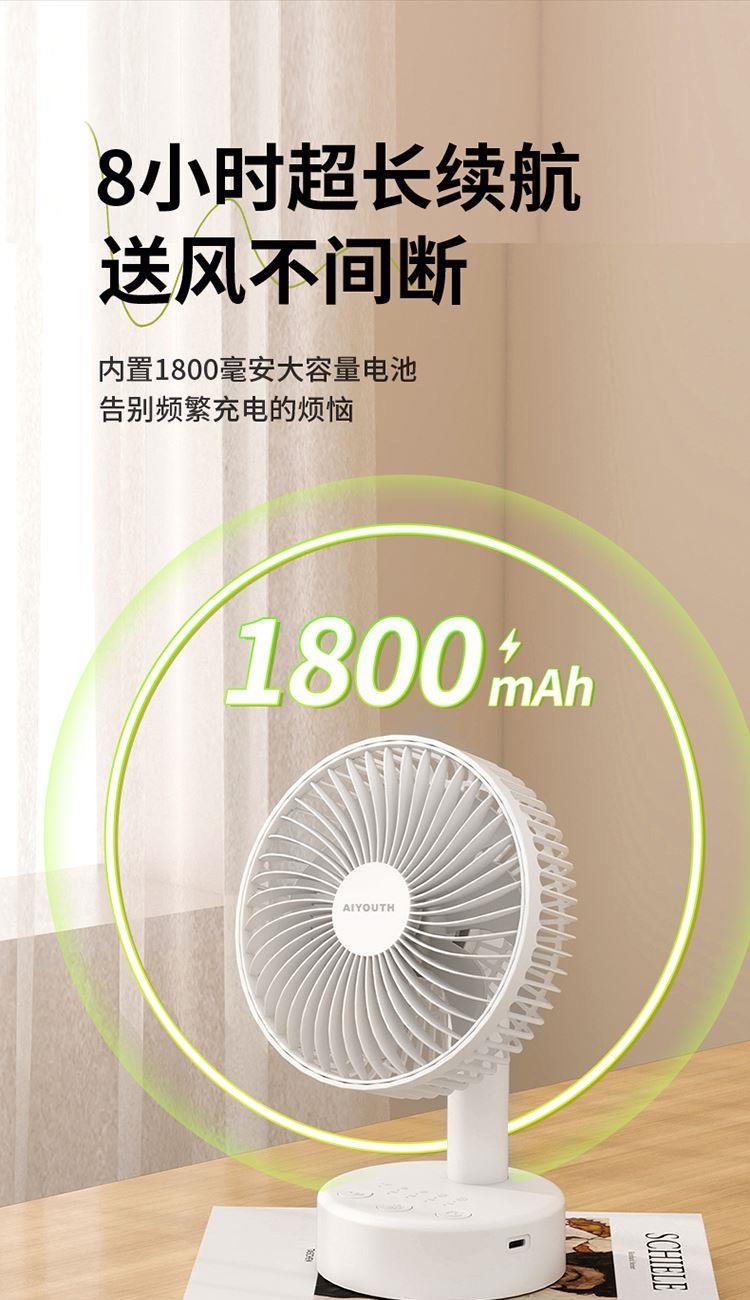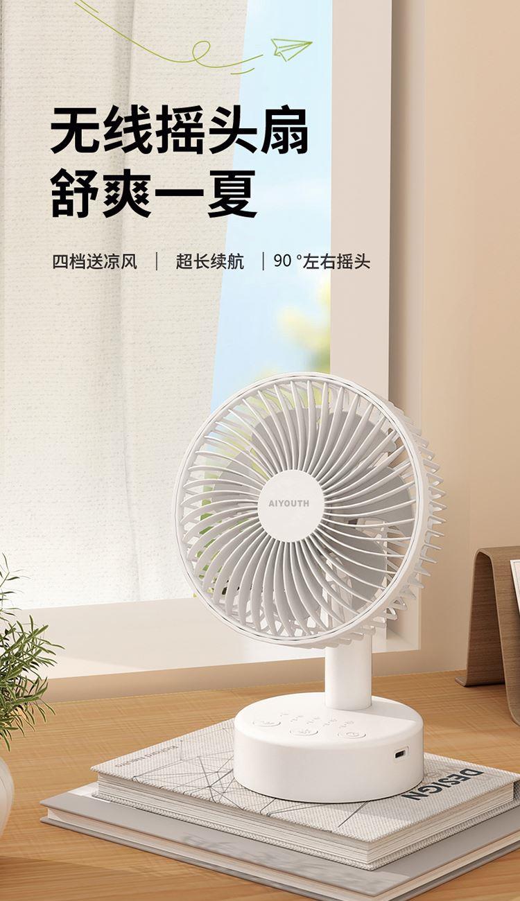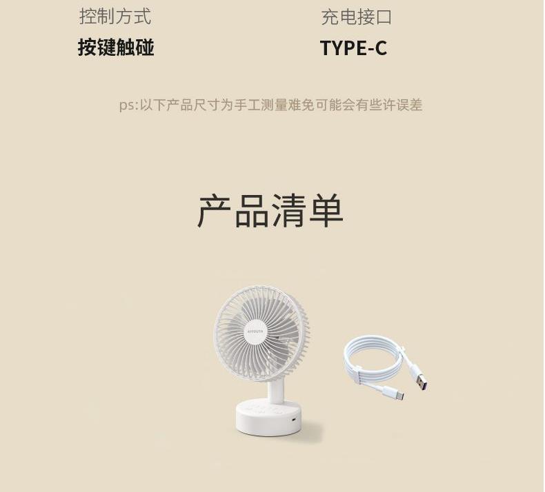 额定功率:10W 额定电压:5V 电池容量:1800mAh 产品颜色:白色 产品毛重:0.52kg/台 包装尺寸:230*160*130mm 包装清单:主机、说明书、数据线 主要材质:ABS 1. 风速/摇头/定时,独立功能按键 2. 四档风速,静怡自然,凉爽 3. 1-8小时定时关机,舒睡自然关机 4. 细密网罩,温馨呵护,不担心夹手 5. 高速无刷电机,运行平稳,有效降噪 6. 逆时针旋转拆卸,轻松拆洗,简单打理 7.90°自动摇头,广角送风 近距离聚焦风力