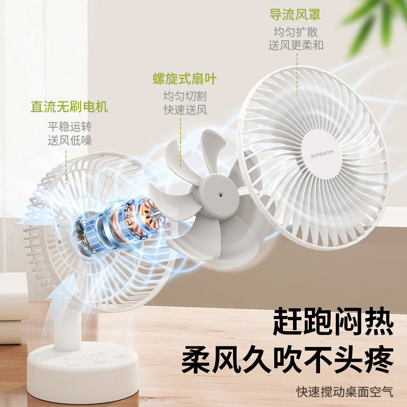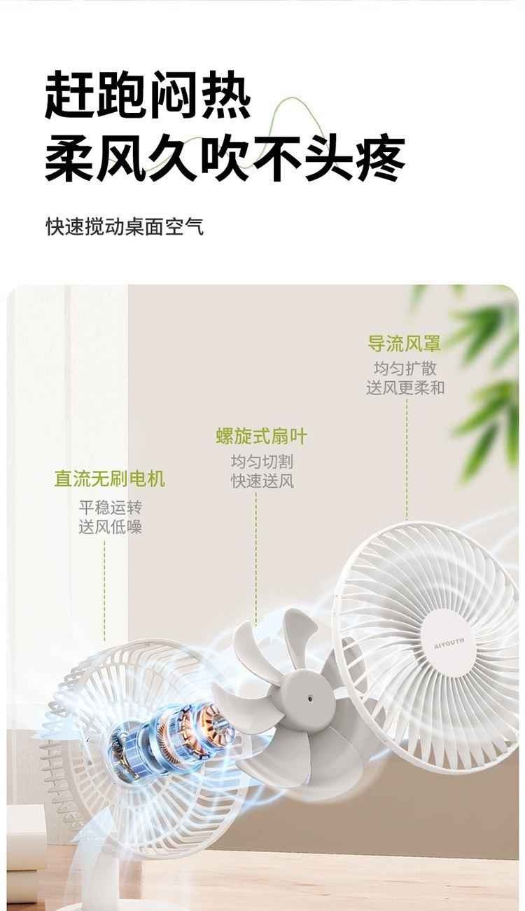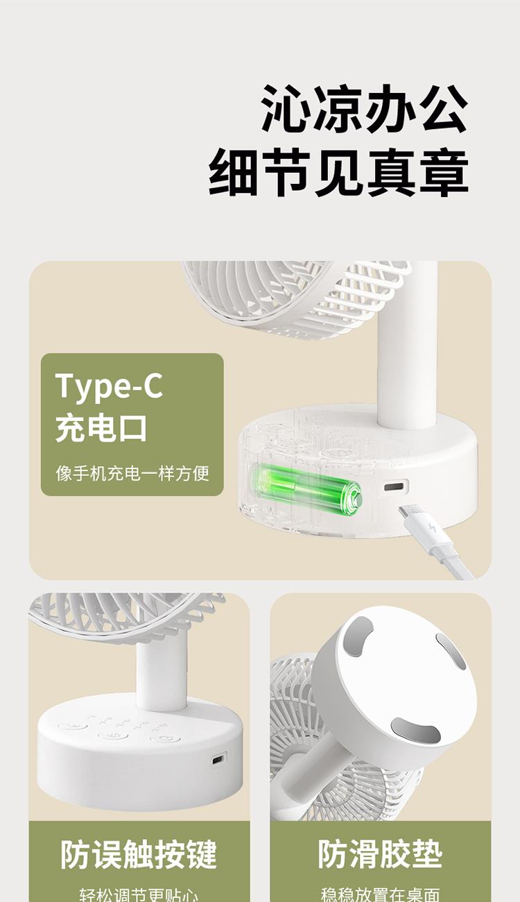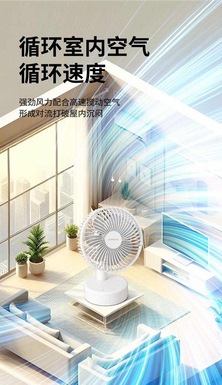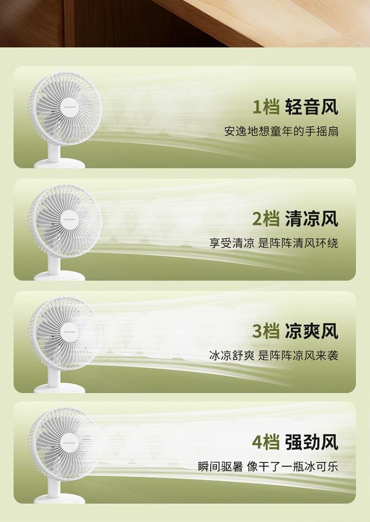 额定功率:10W 额定电压:5V 电池容量:1800mAh 产品颜色:白色 产品毛重:0.52kg/台 包装尺寸:230*160*130mm 包装清单:主机、说明书、数据线 主要材质:ABS 1. 风速/摇头/定时,独立功能按键 2. 四档风速,静怡自然,凉爽 3. 1-8小时定时关机,舒睡自然关机 4. 细密网罩,温馨呵护,不担心夹手 5. 高速无刷电机,运行平稳,有效降噪 6. 逆时针旋转拆卸,轻松拆洗,简单打理 7.90°自动摇头,广角送风 近距离聚焦风力