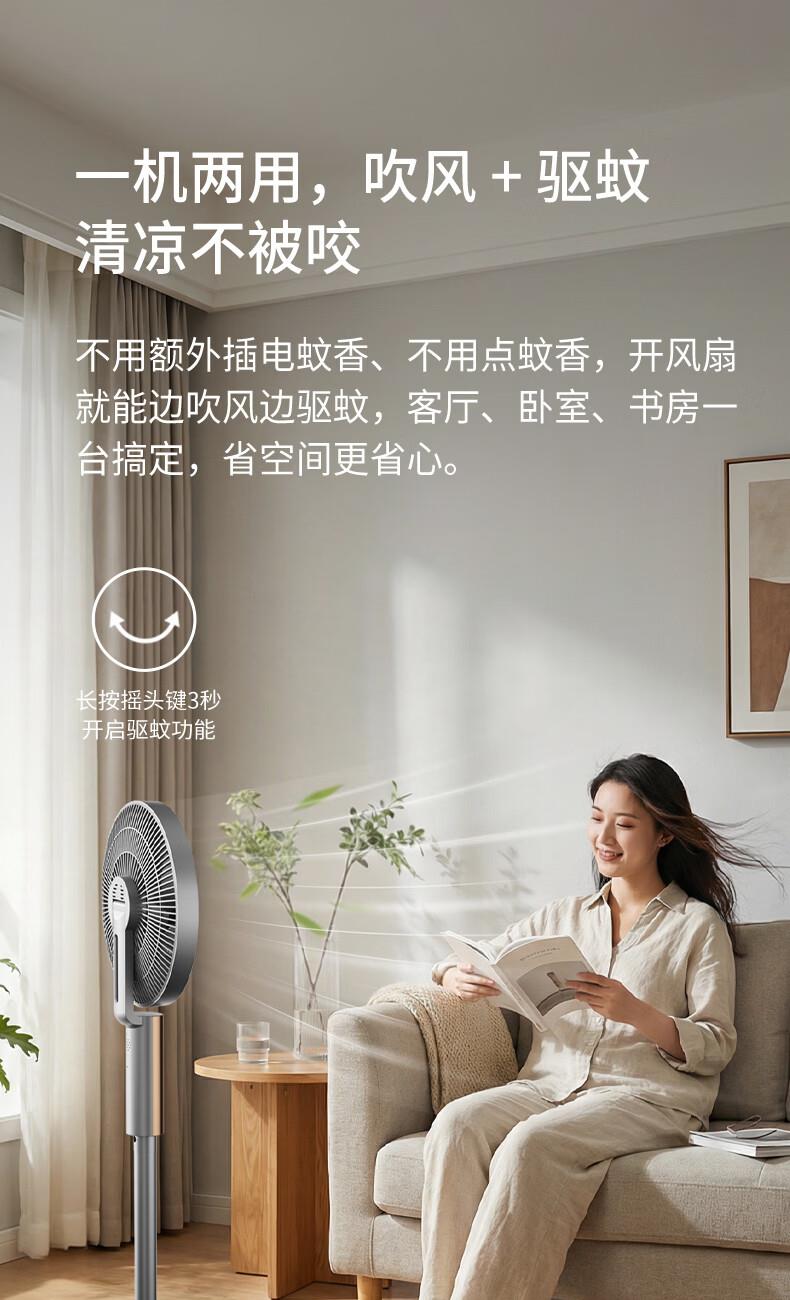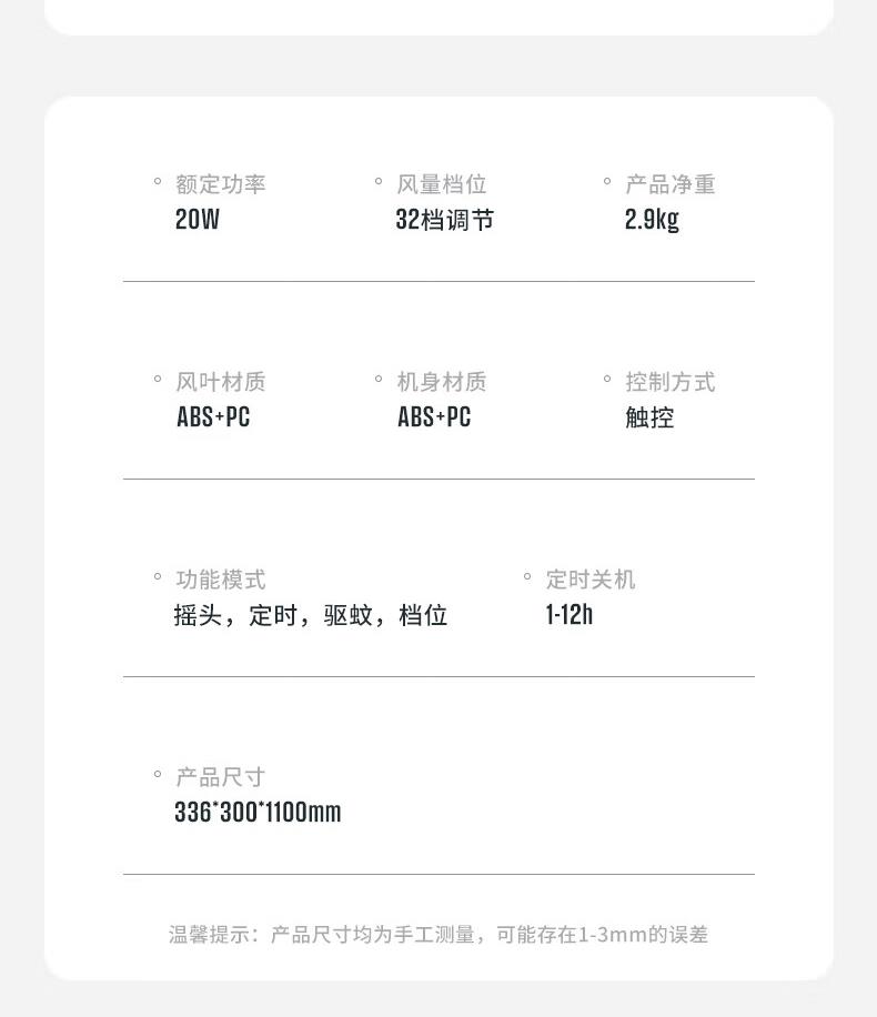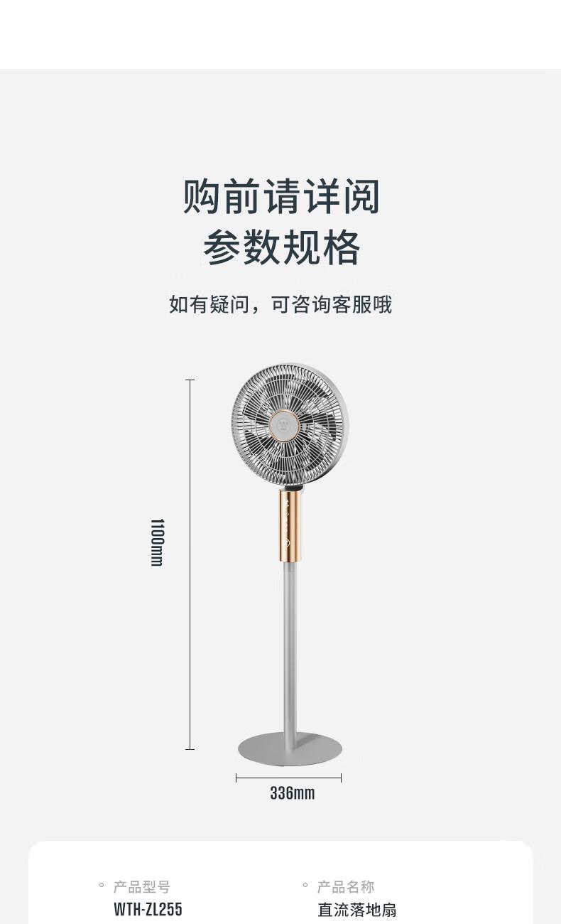 型号:WTH-ZL255 功率:20W 控制方式:智慧语音/触屏/遥控/手机小程序 风速档位:32档 产品尺寸:336*300*1100mm 一级能效 32档风速调节 直流无刷电机 智慧语音/触屏/遥控/小程序 一机两用,吹风+超声波驱蚊 自然、睡眠、婴儿、正常风