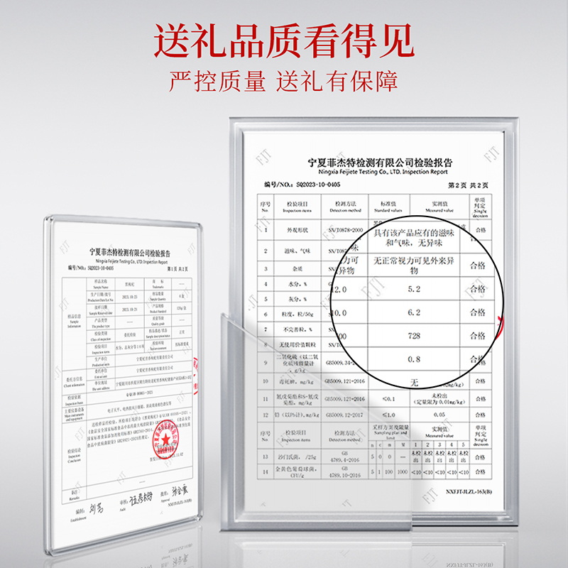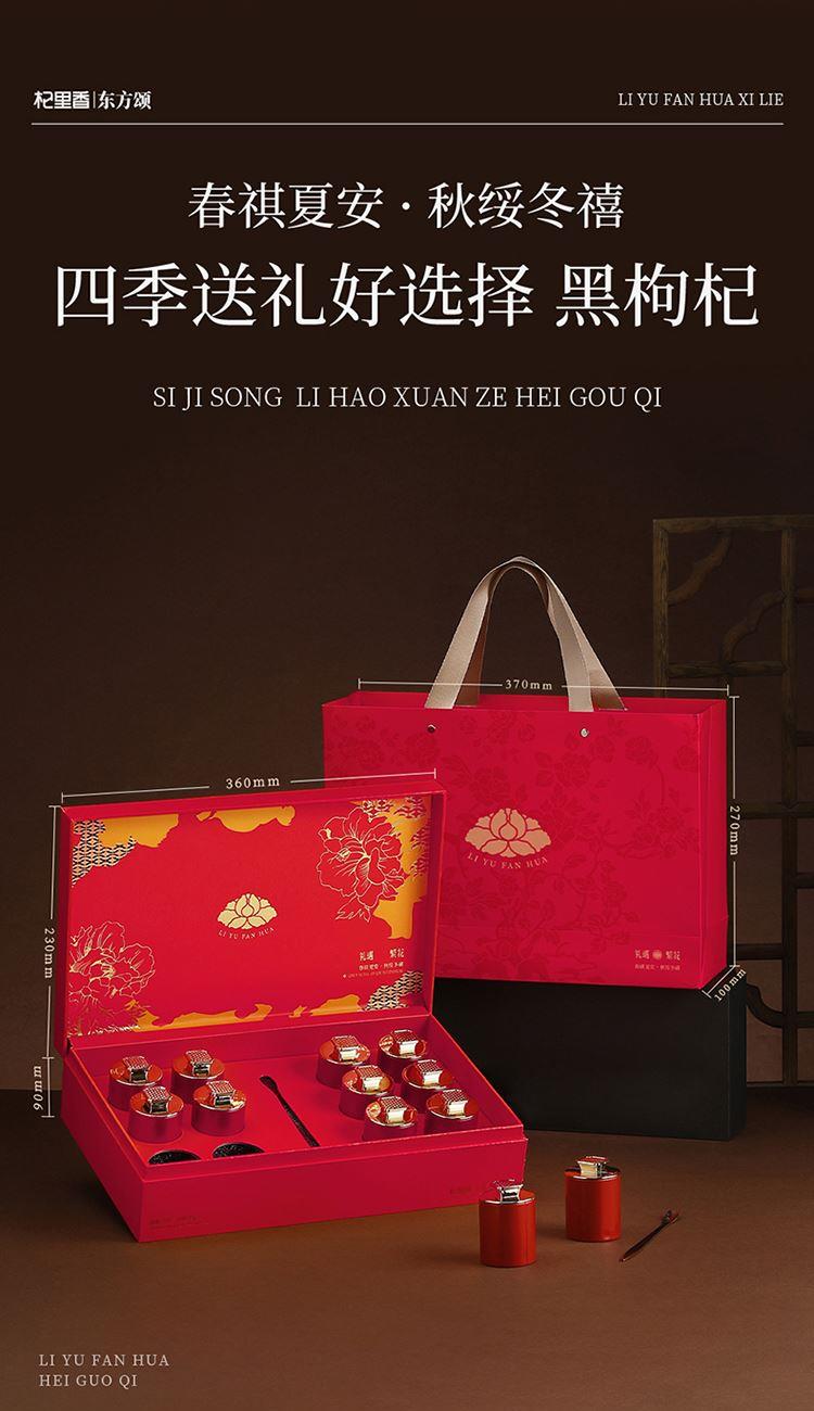 [配料表】:青海黑枸杞 [净含量】:200G(12罐) [礼盒尺寸】:360*230*90MM [礼袋尺寸】:370*270*90MM
