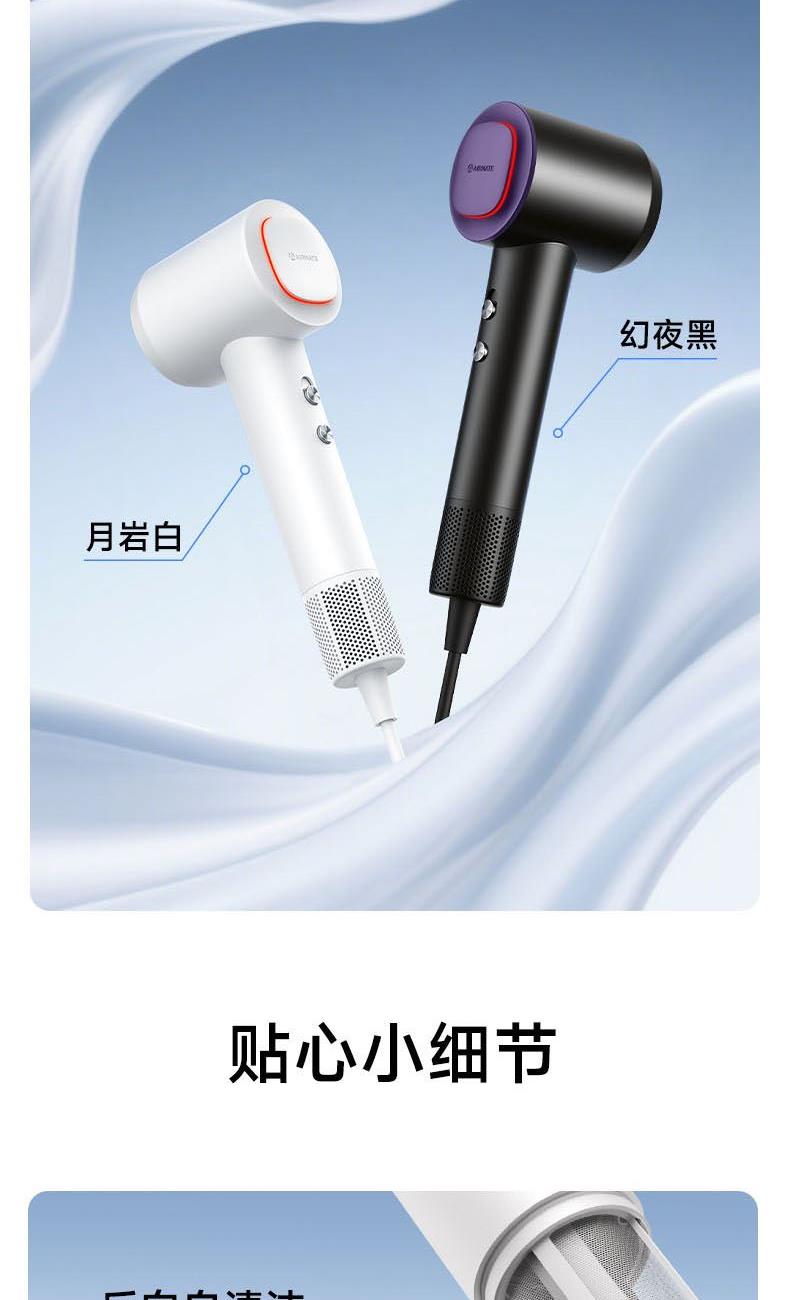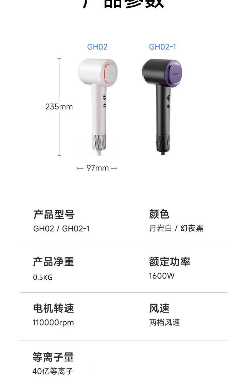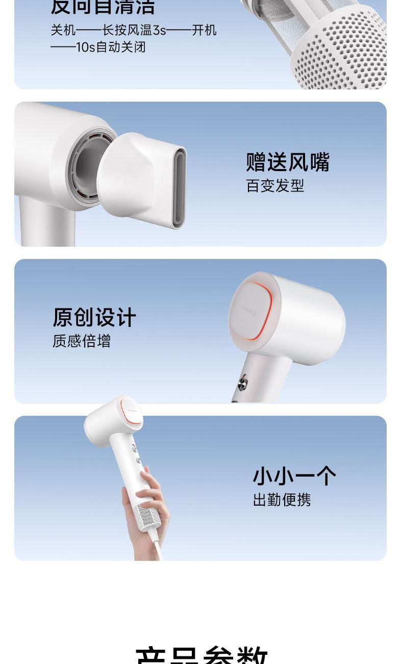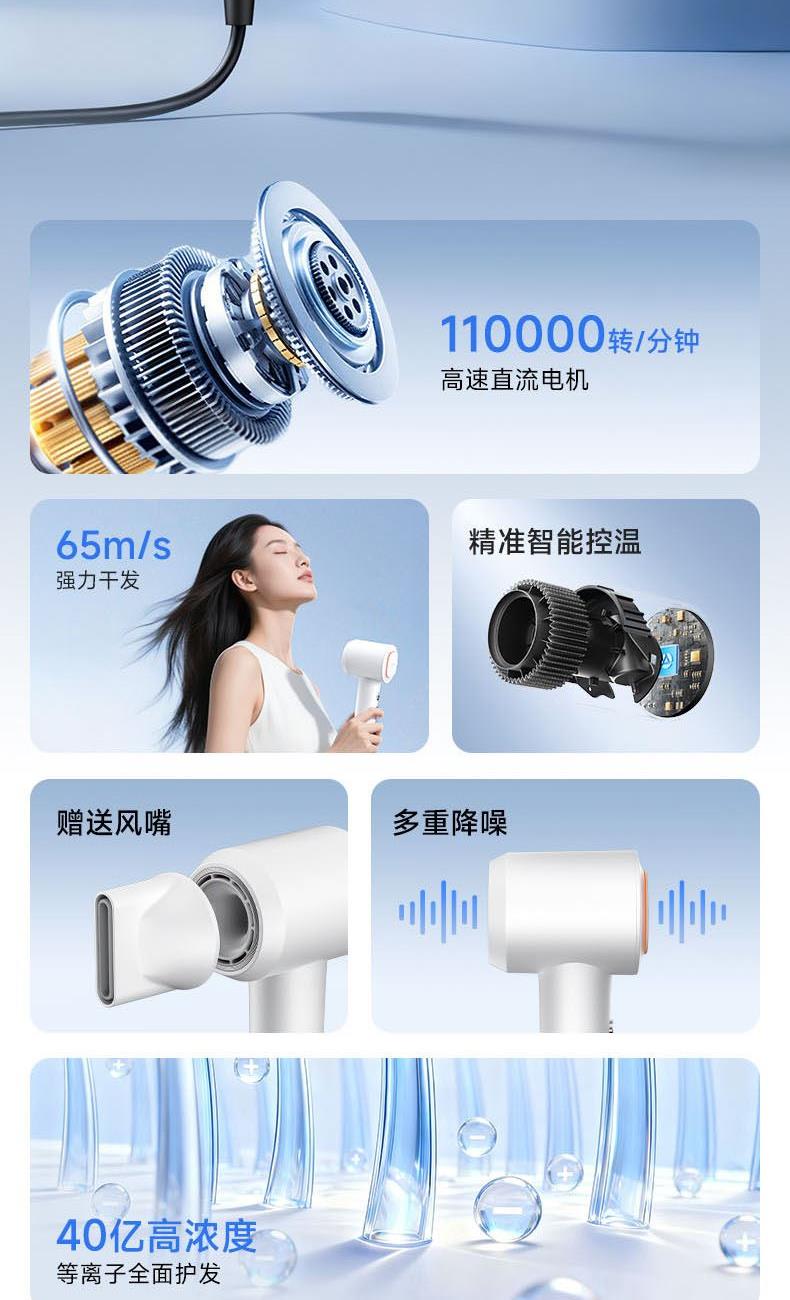 额定功率:1600W 电机转速:110000rpm 风速:两档风速 温度:低温、高温、循环 产品净重:0.46kg 风速:65m/s 护发:40亿等离子 电机:11万转高速电机 多档位:3档温度、2档风速 显示:环形灯条 安全:过热保护、AI智能控温 其他功能:反向出风清洁 配件:定型风嘴