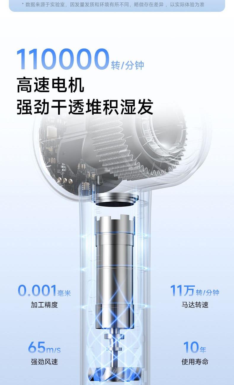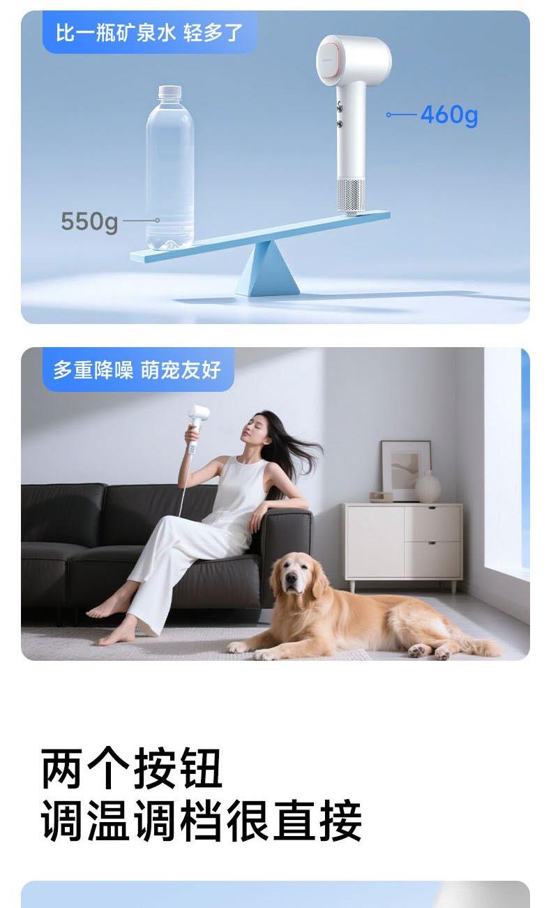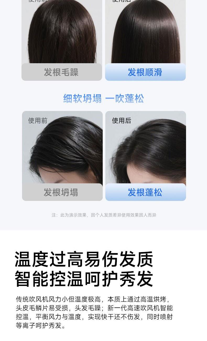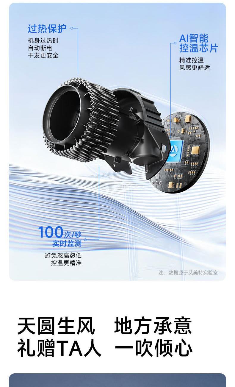 额定功率:1600W 电机转速:110000rpm 风速:两档风速 温度:低温、高温、循环 产品净重:0.46kg 风速:65m/s 护发:40亿等离子 电机:11万转高速电机 多档位:3档温度、2档风速 显示:环形灯条 安全:过热保护、AI智能控温 其他功能:反向出风清洁 配件:定型风嘴