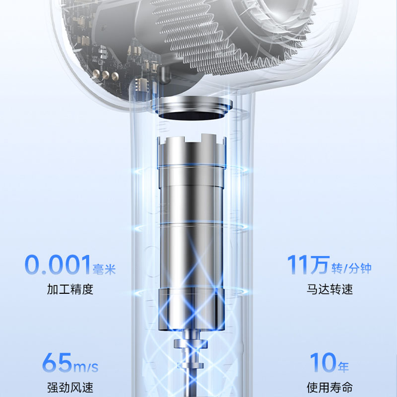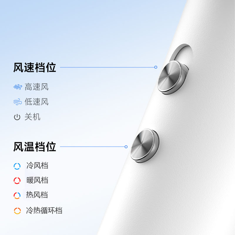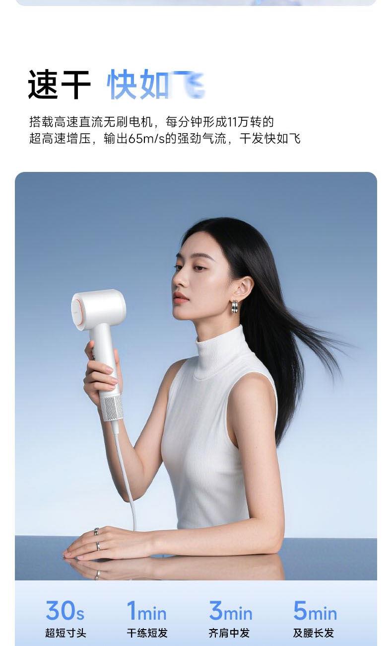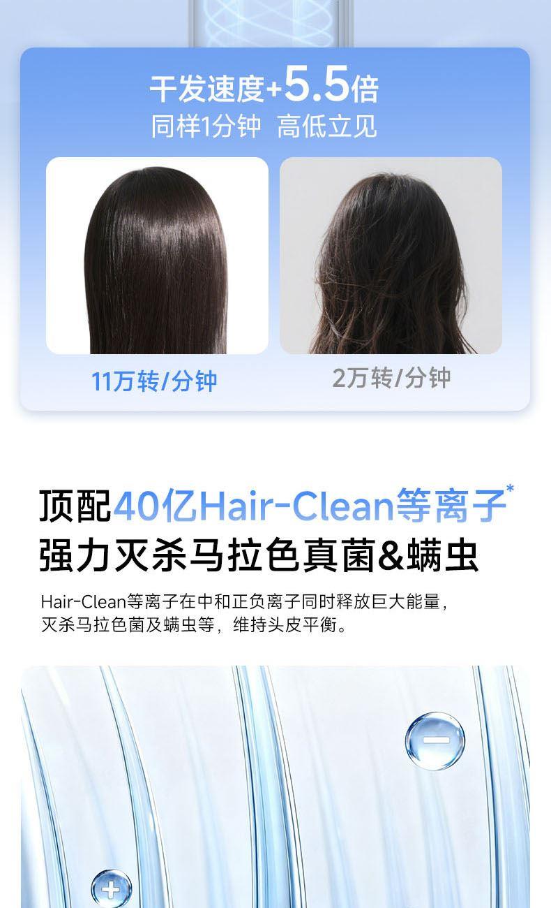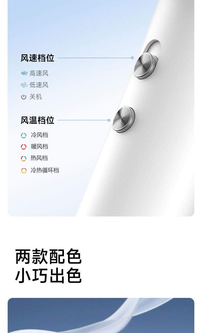 额定功率:1600W 电机转速:110000rpm 风速:两档风速 温度:低温、高温、循环 产品净重:0.46kg 风速:65m/s 护发:40亿等离子 电机:11万转高速电机 多档位:3档温度、2档风速 显示:环形灯条 安全:过热保护、AI智能控温 其他功能:反向出风清洁 配件:定型风嘴