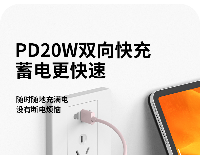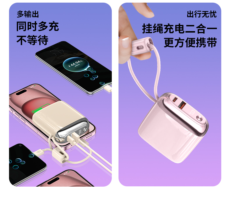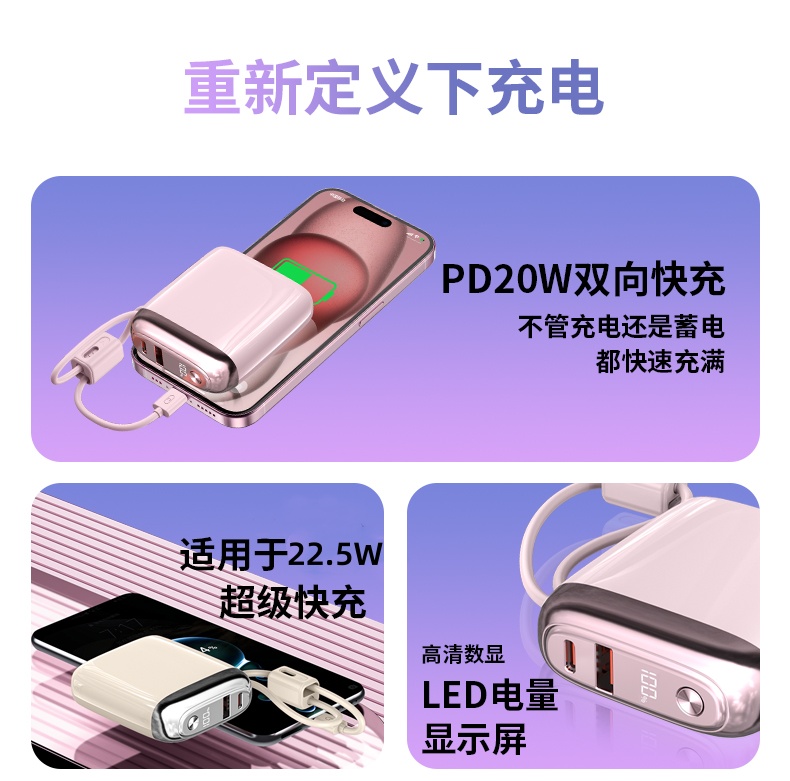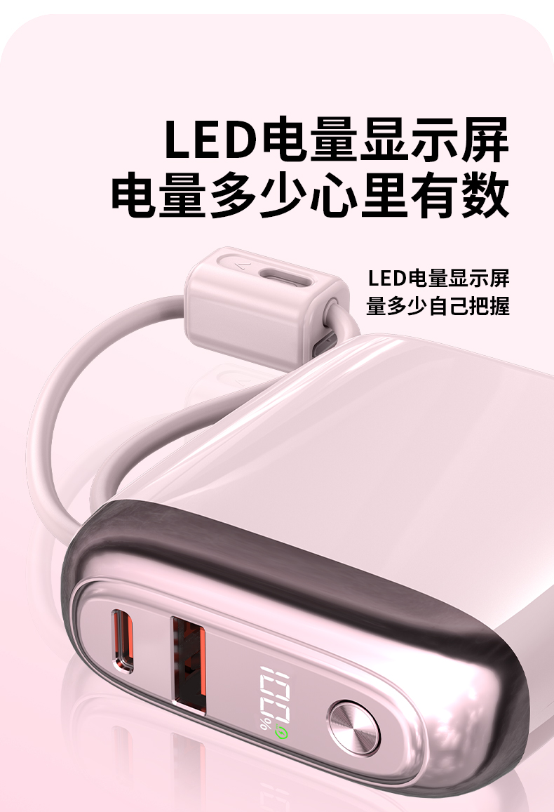LED数显电量,掌握剩余电量,Type-c自带线接口支持22.5W超级快充,充电宝支持快充蓄电,具有过压保护,过放保护,短路保护,过充保护等功能,可带上飞机。