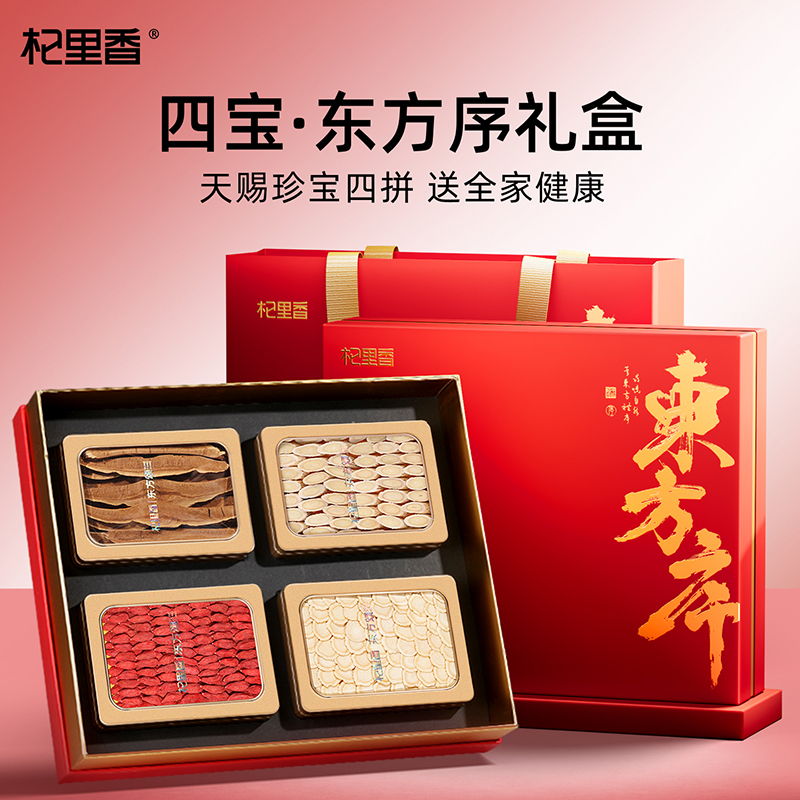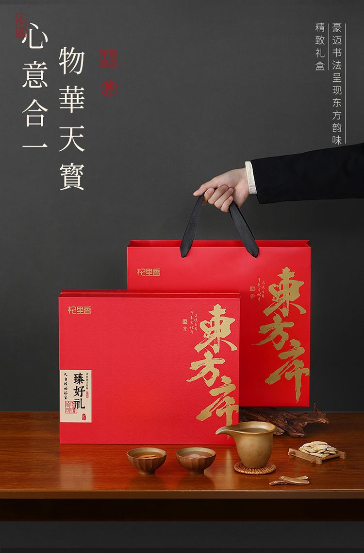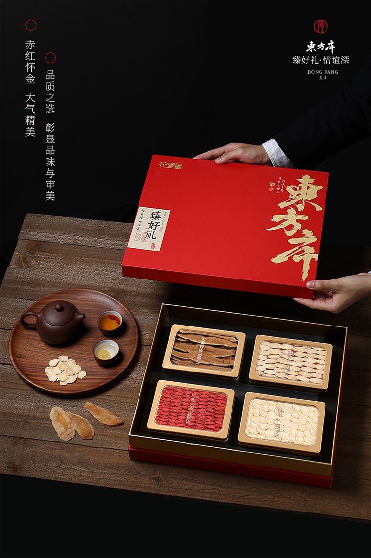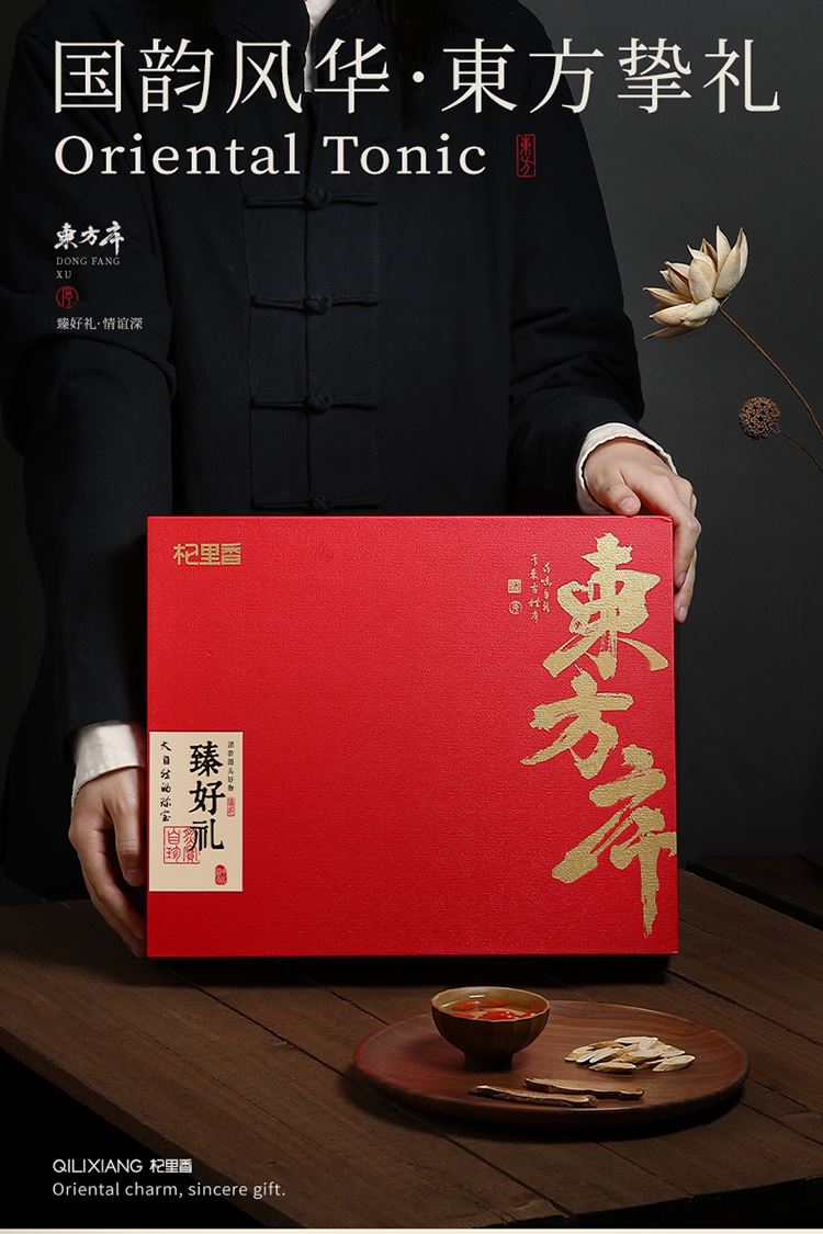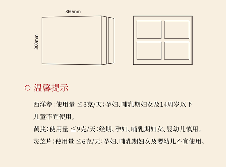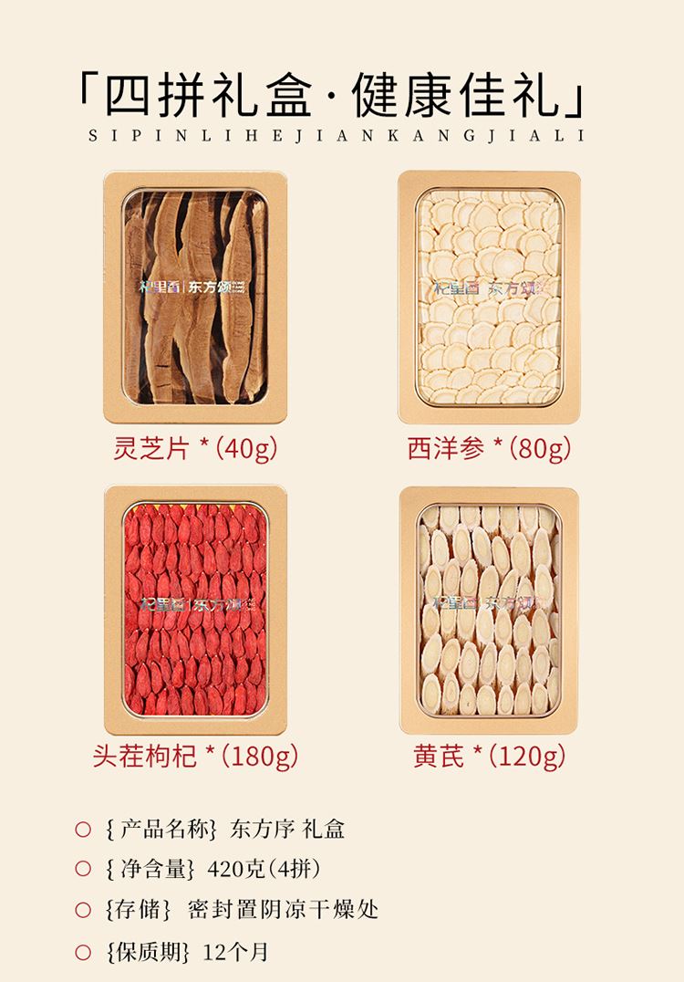 {产品 名 称}东方序礼盒 [净含量}420克(4拼) 内含:【10-12mm西洋参片(80g)、宁A150-170红枸杞(180g)、1.0-1.2黄芪大片(120g)、灵芝片(40g)】 {存储}密封置阴凉干燥处 {保质期}12个月