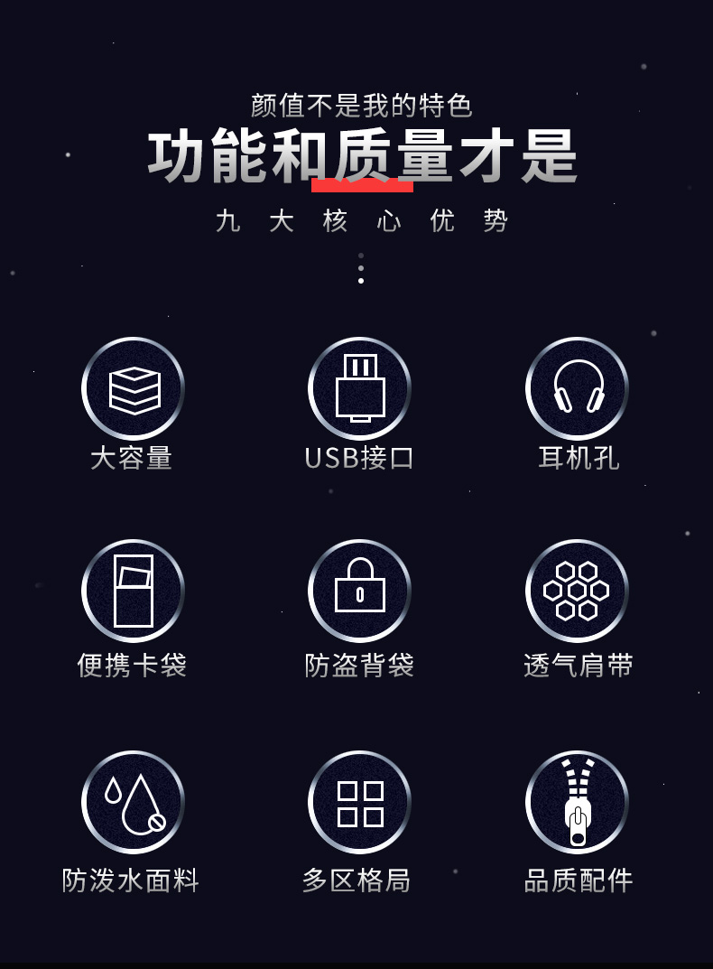 型 号:55001 尺 寸:330*200*110(MM) 材 质:织物 颜 色:黑色、灰色 重 量:0.23kg 2.采用840D抗撕裂尼龙材料 防泼水; 3.超大容量设计可放手机等 4.外置USB接口可直接连接手机充电
