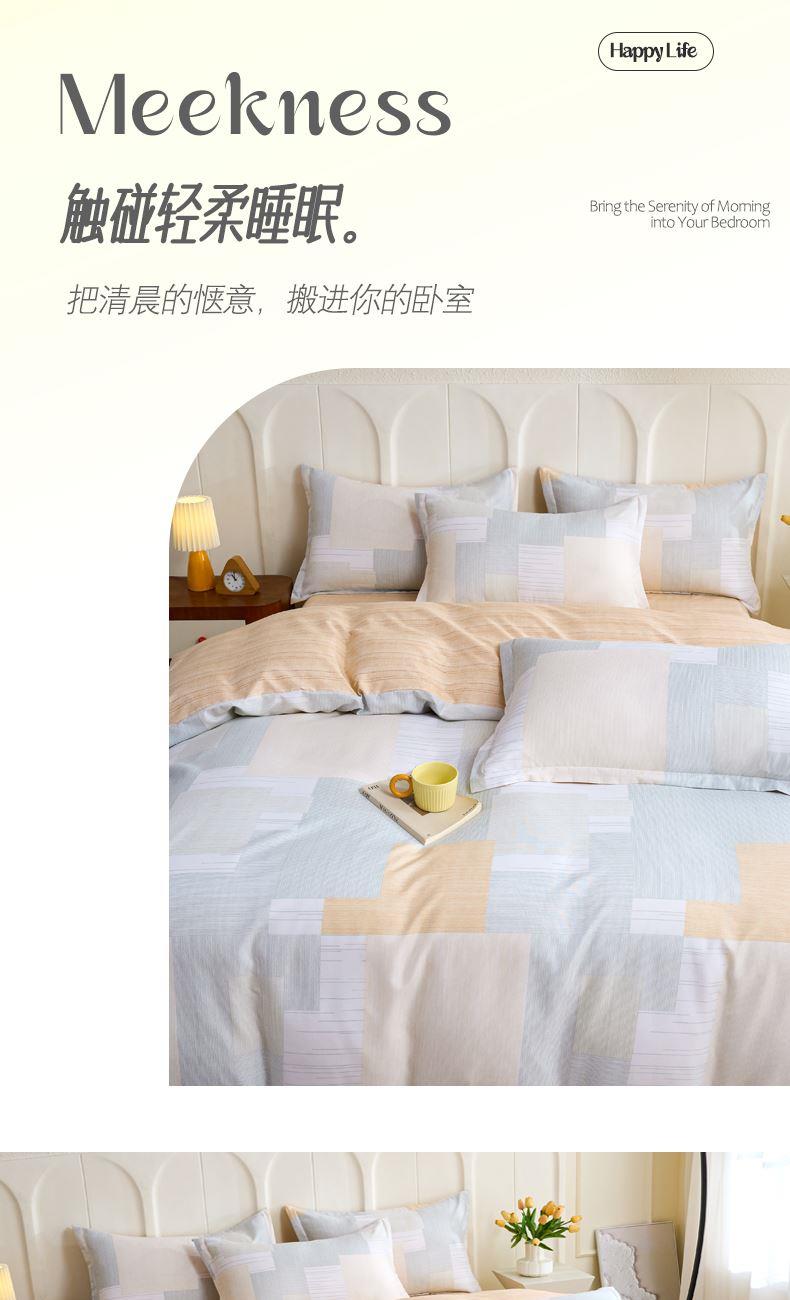 产品参数: 面料:聚酯纤维 规格: 被套200*230cm 床单230*250cm 枕套48*74cm*2只 产品卖点: 亲肤棉感聚酯纤维,柔软细腻不闷汗,耐磨抗皱好打理,机洗不变形 透气亲肤不压身,夜夜安睡不粘腻,柔软贴身,告别粗糙化纤感