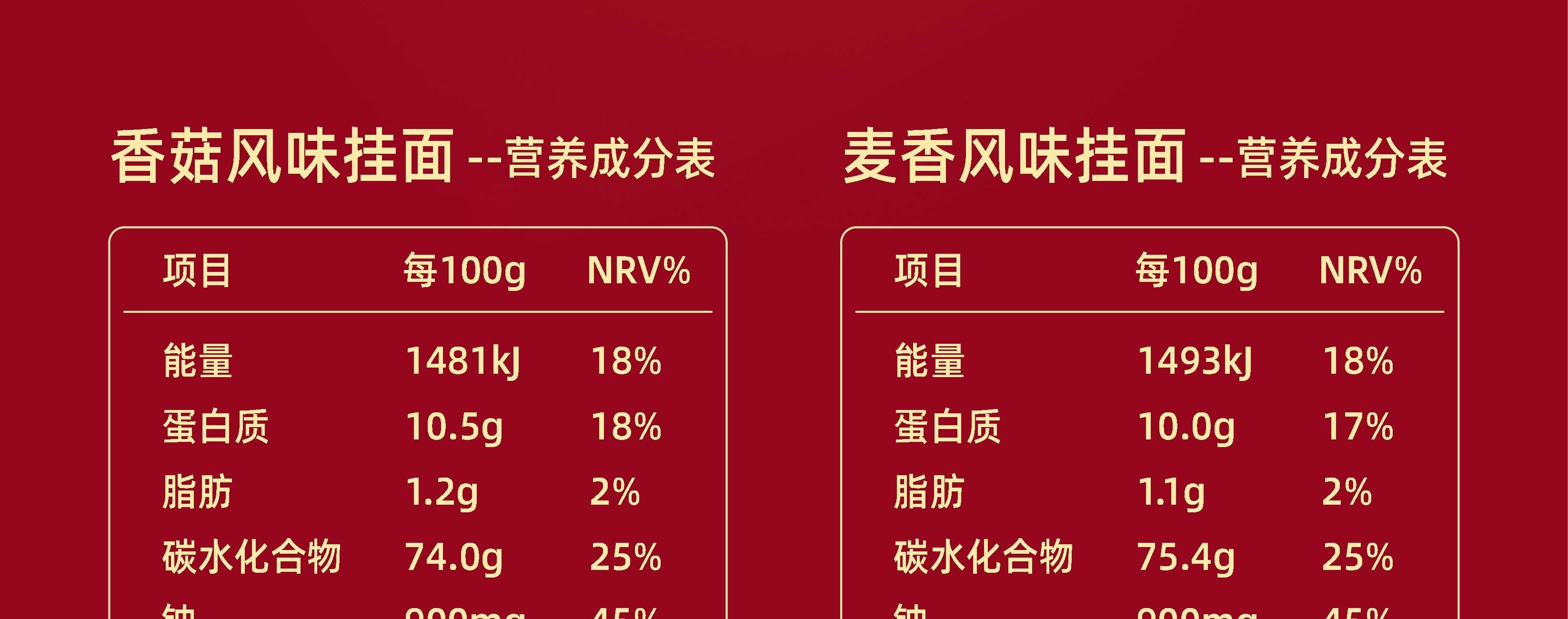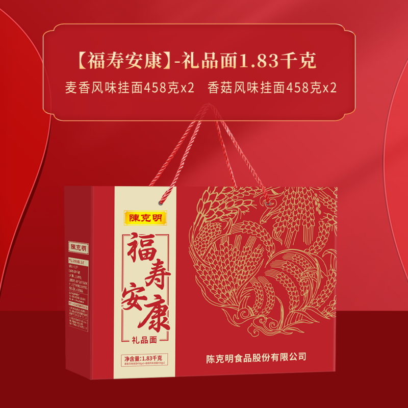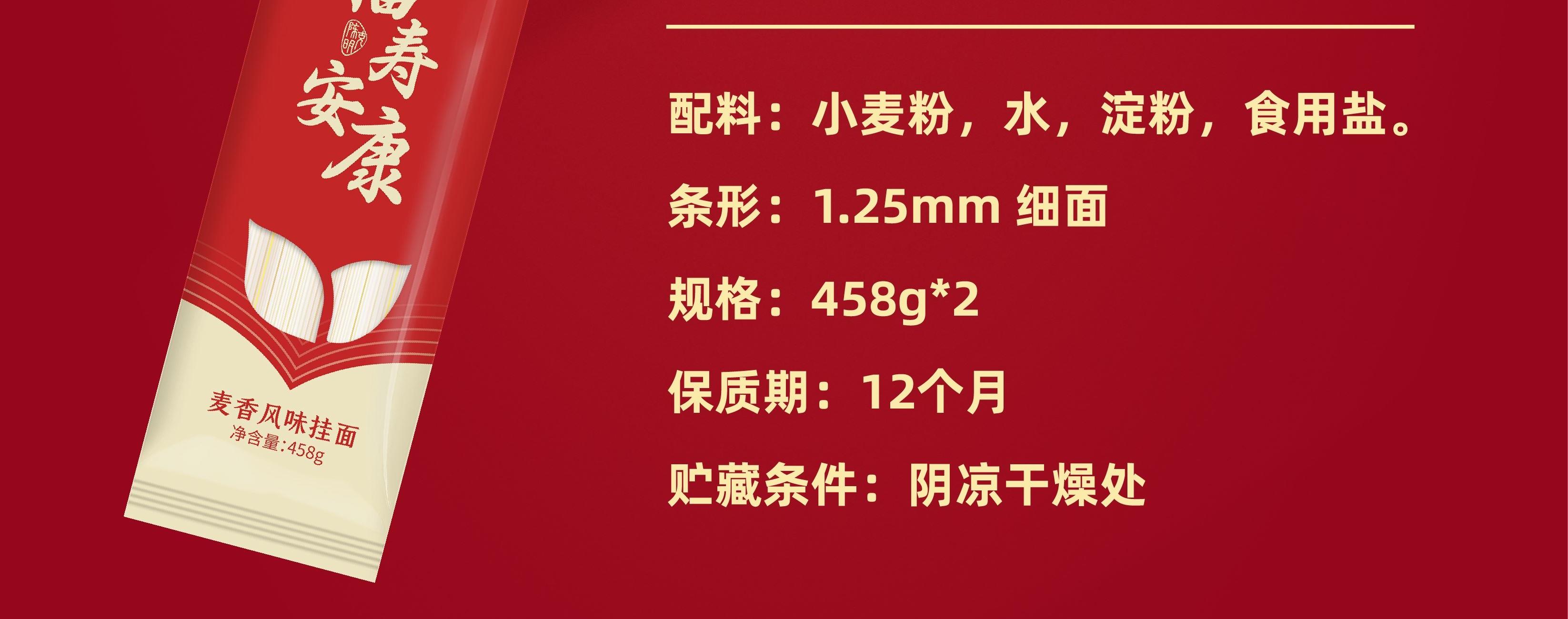 重量:1.83KG 内配:香菇风味挂面458g*2 麦香风味挂面458g*2 “福寿绵延,安康顺遂”, 好礼常相伴:两款高人气 风味挂面组合,精选优质麦 源,麦香浓郁,劲道爽滑, 匠心品质,易煮不糊汤, 不止Q弹更加健康。