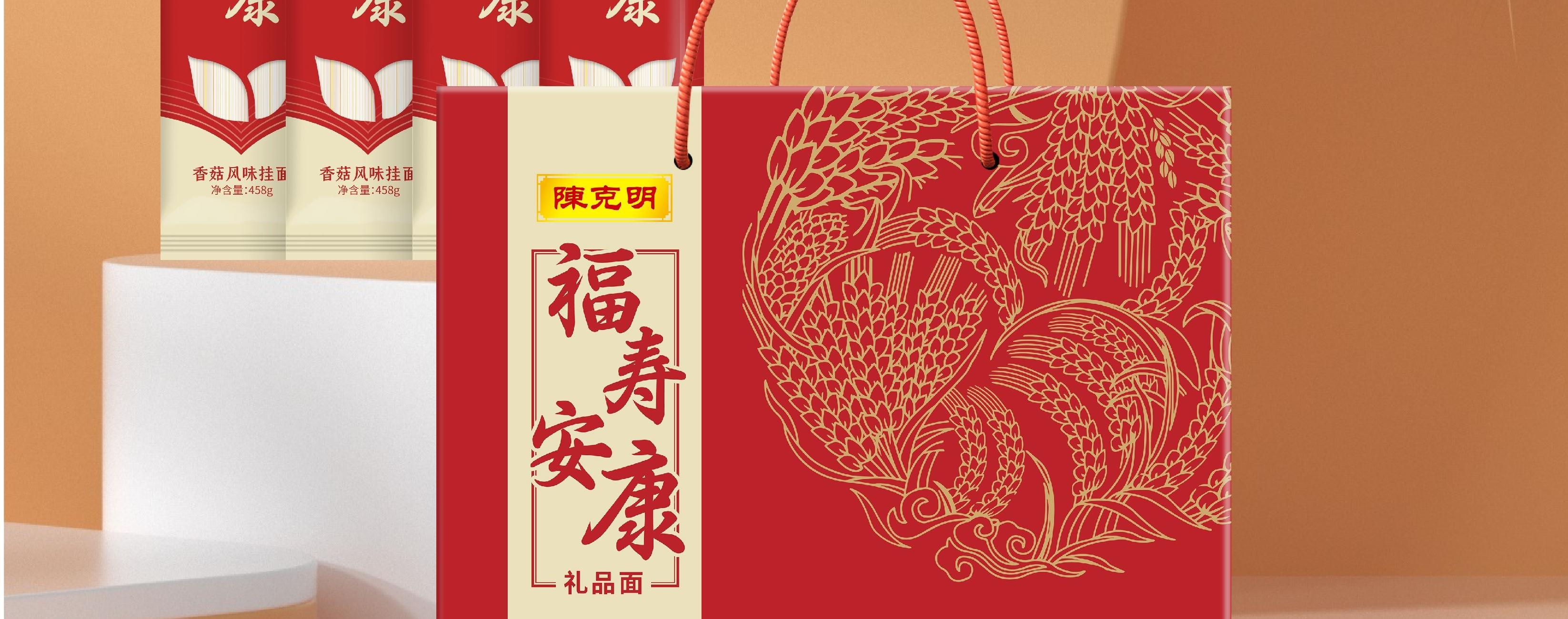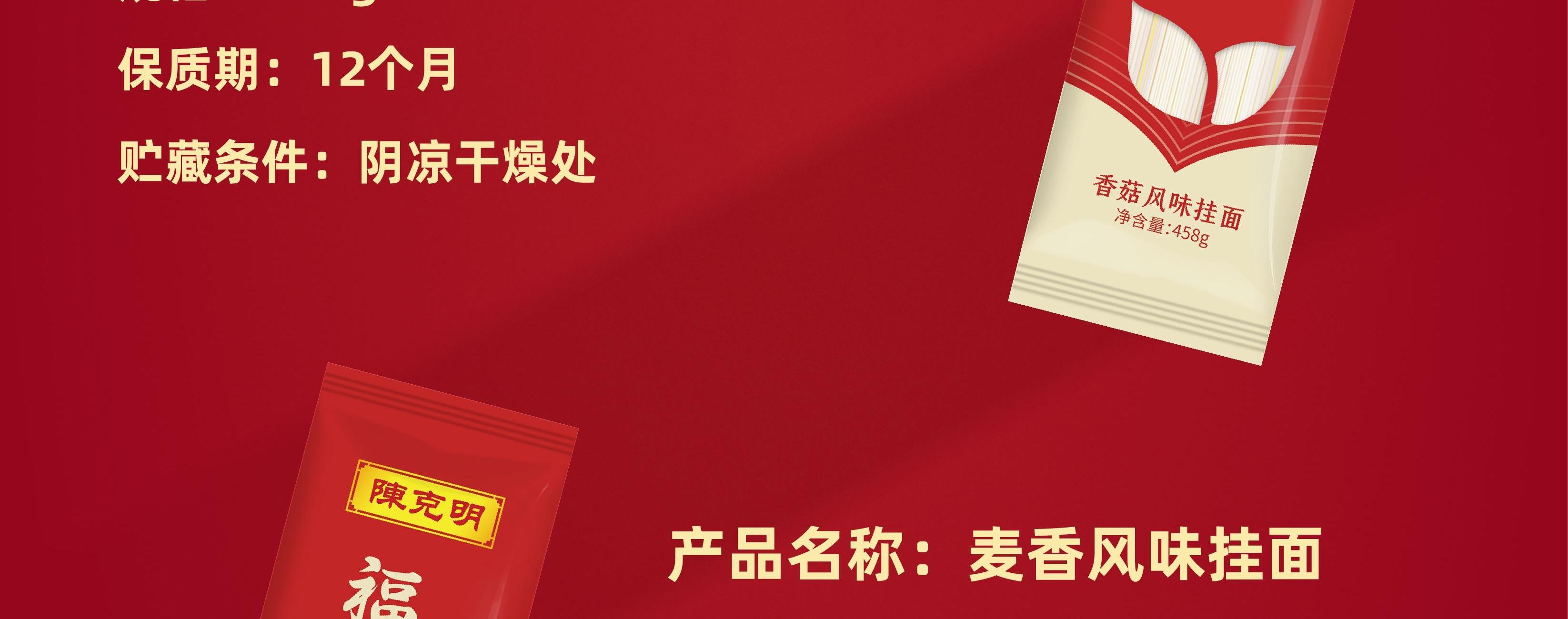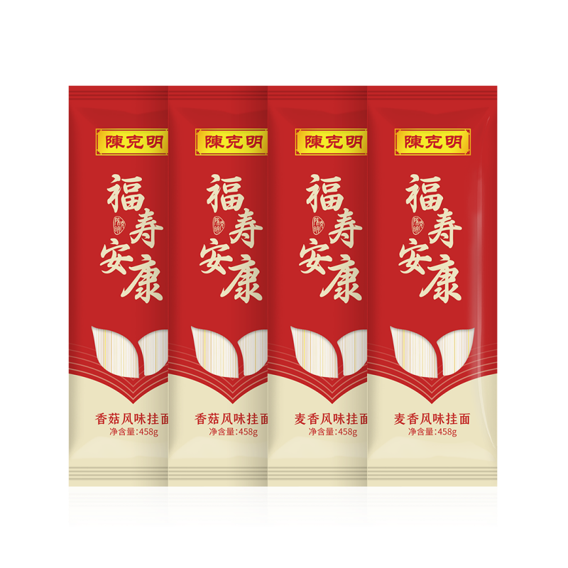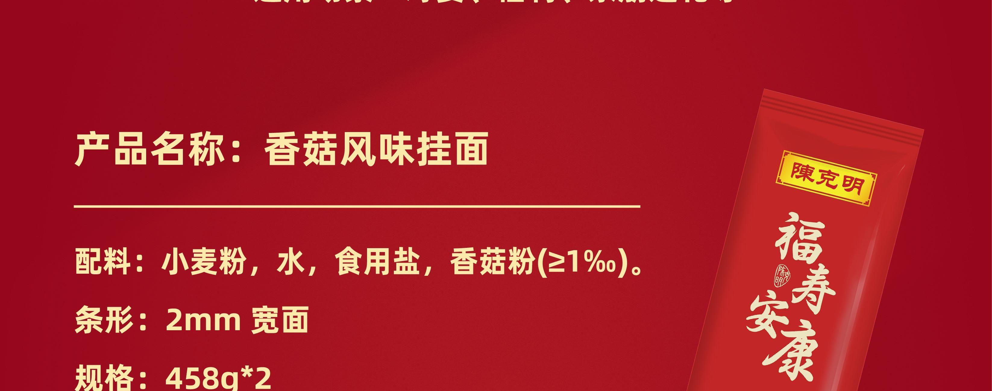 重量:1.83KG 内配:香菇风味挂面458g*2 麦香风味挂面458g*2 “福寿绵延,安康顺遂”, 好礼常相伴:两款高人气 风味挂面组合,精选优质麦 源,麦香浓郁,劲道爽滑, 匠心品质,易煮不糊汤, 不止Q弹更加健康。
