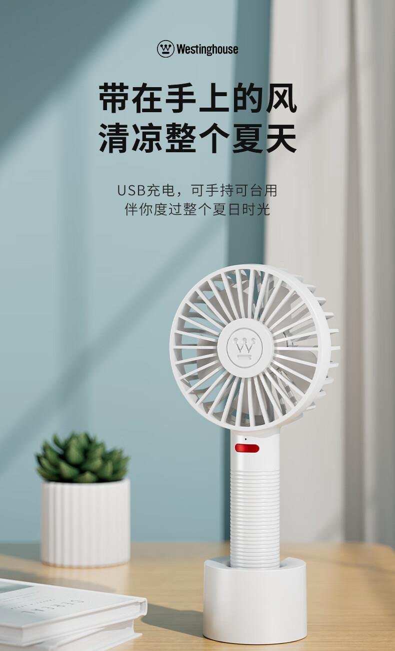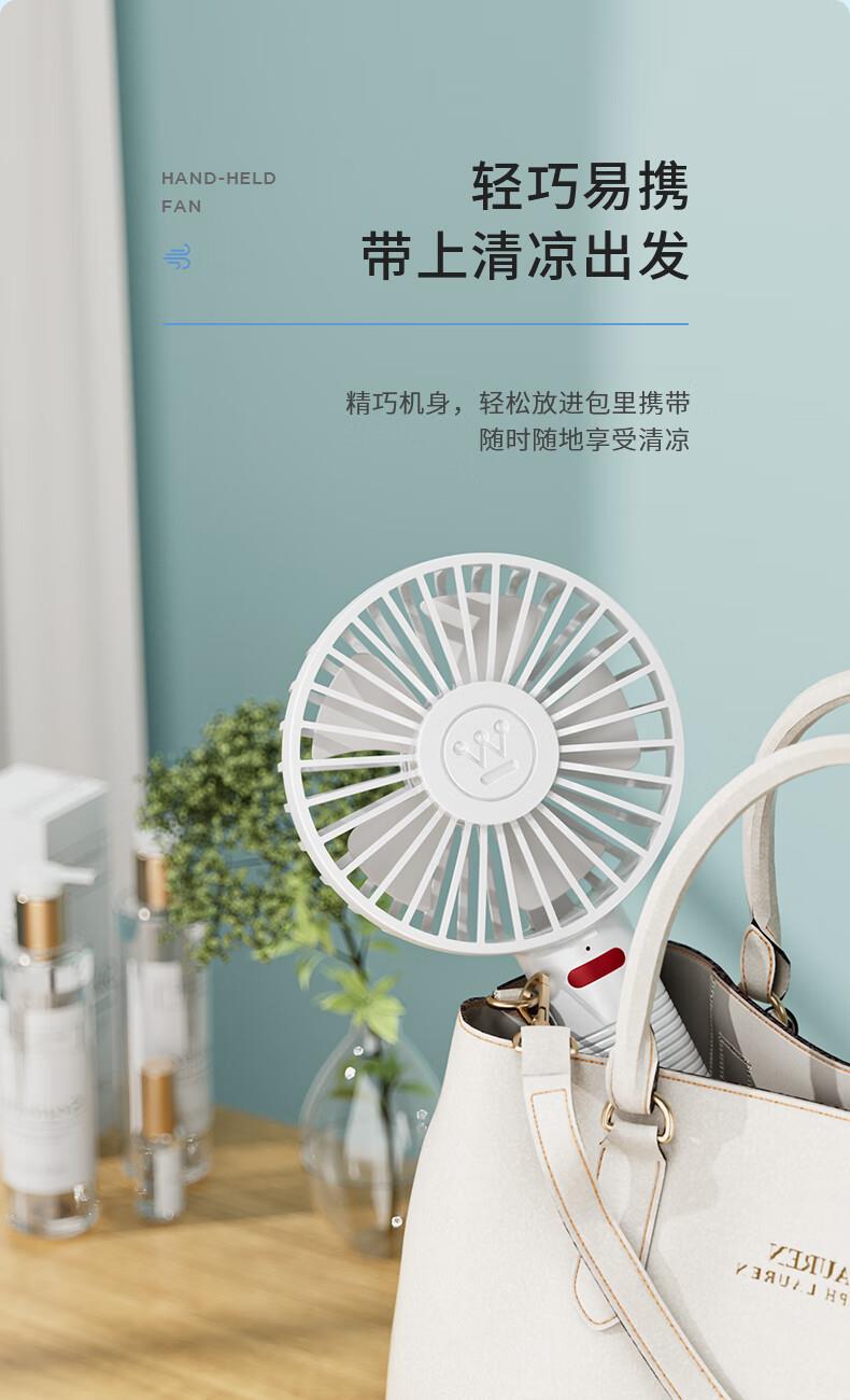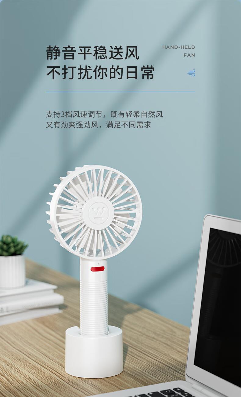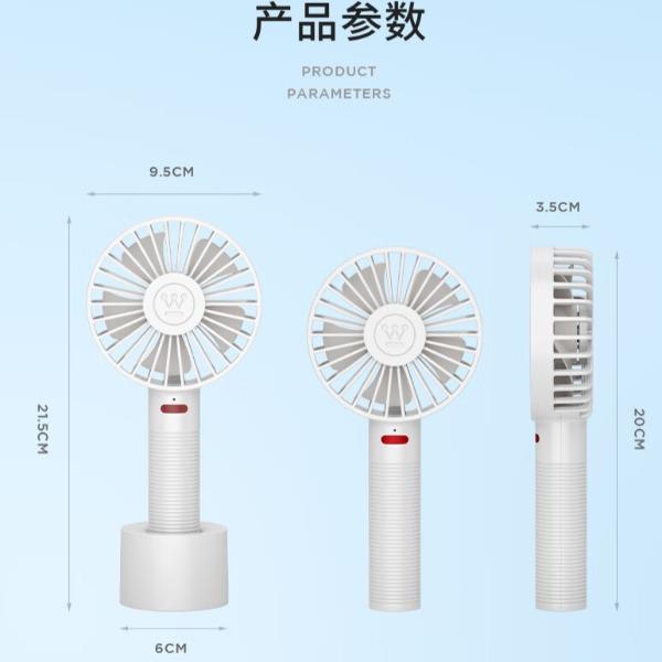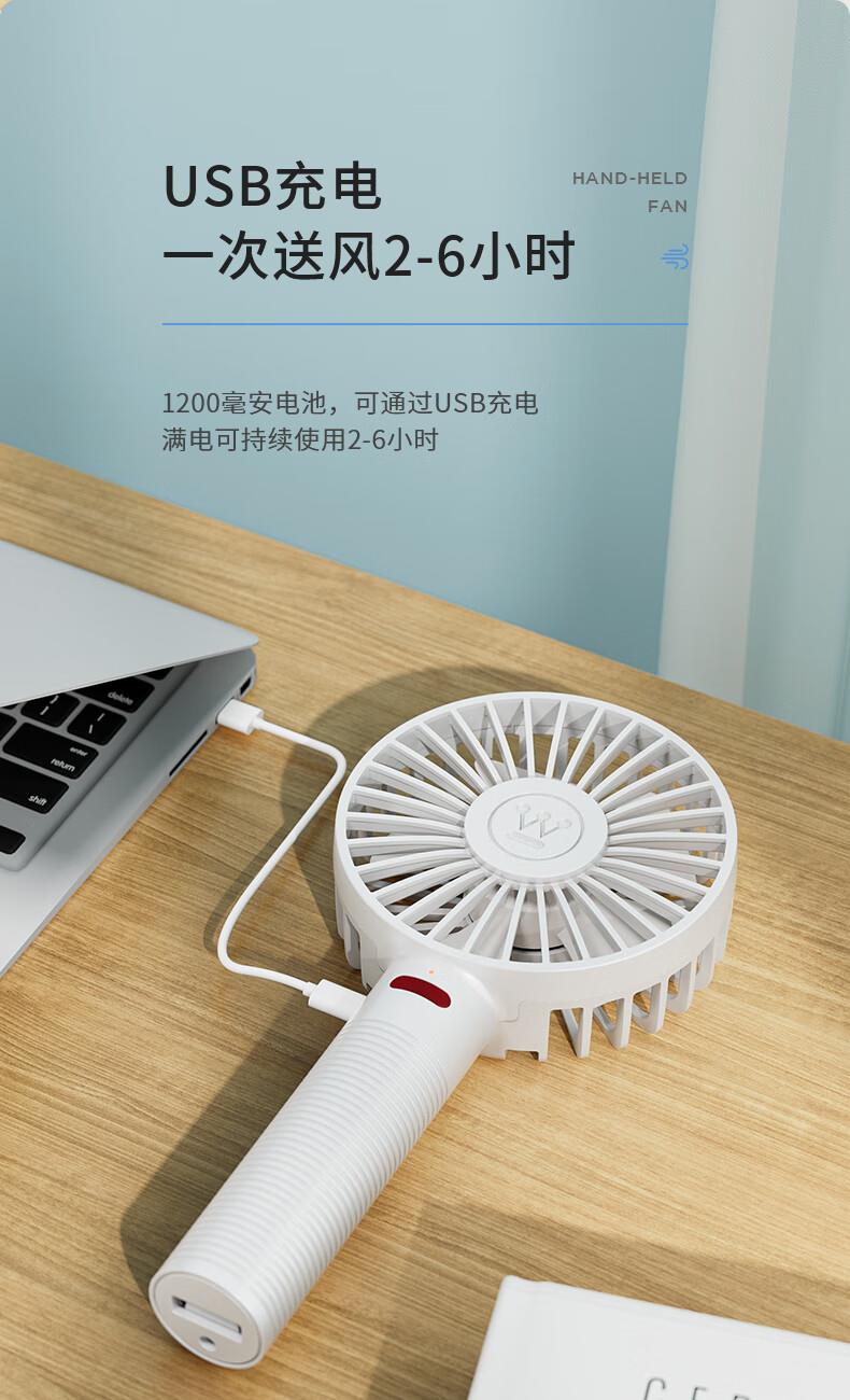 功率:4W 毛重:0.4kg 档位:3档 产品尺寸: 95*35*215mm 3档风速调节 USB快速充电 1200mA电池 轻音送风 小巧便携