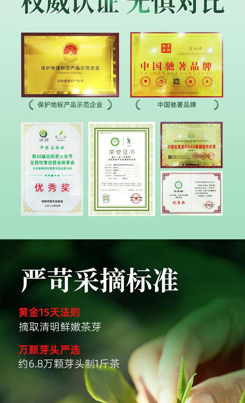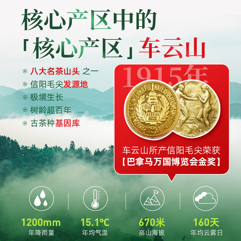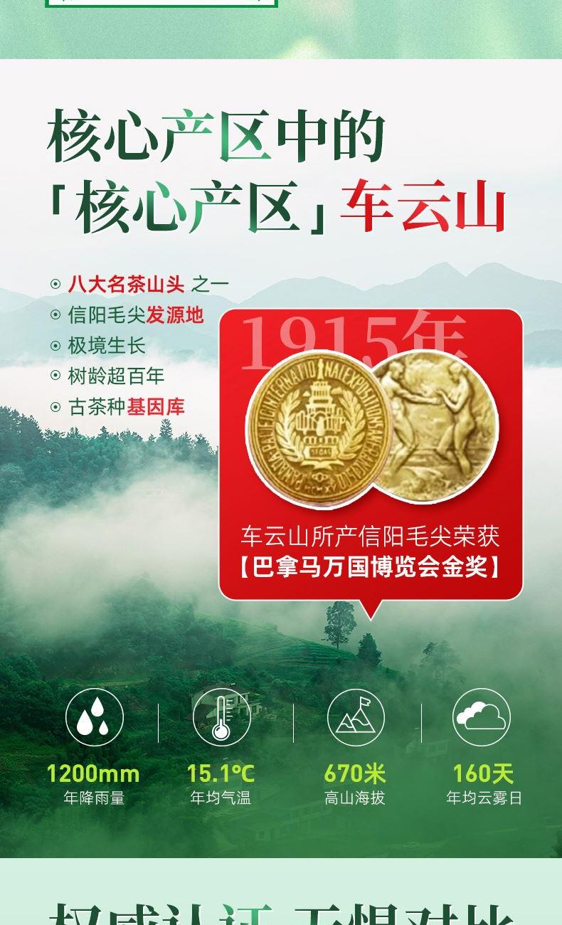 2、产自于信阳毛尖核心产区“车云山”,茶山平均海拔600米,全年平均气温15.1℃,昼夜温差大,气候湿润,雨量充沛,茶叶内含物质丰富。