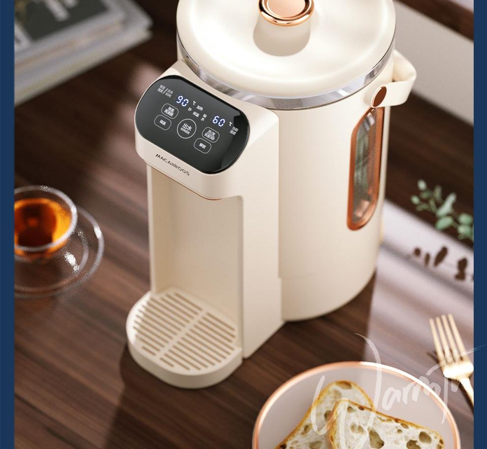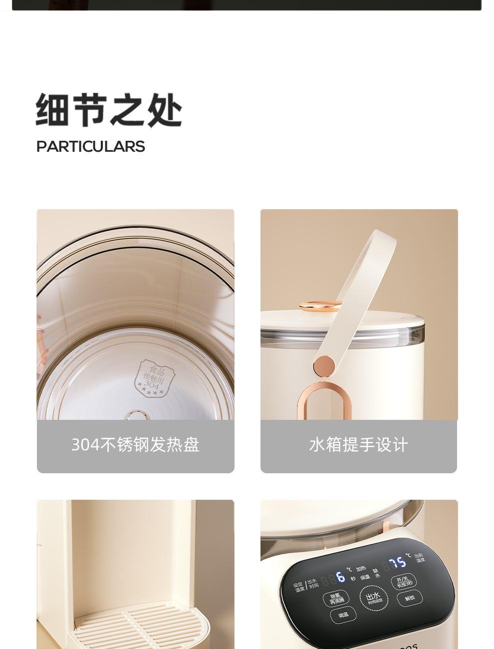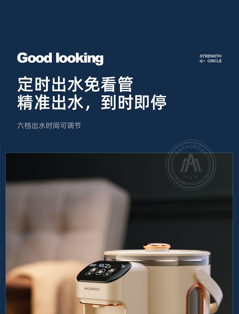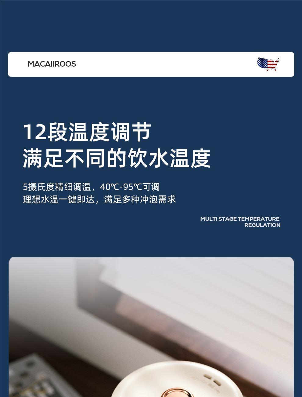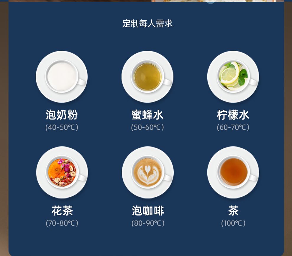 多段温度选择40°-100°C调温,满足泡茶、冲奶、咖啡等需求,实时水温显示;
