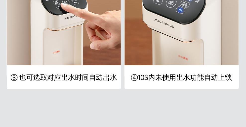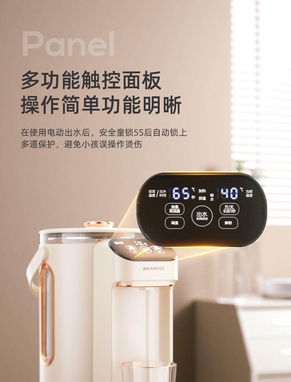 智能触控功能清晰显示,可选时长电动出水,通电长时保温,安全童锁;