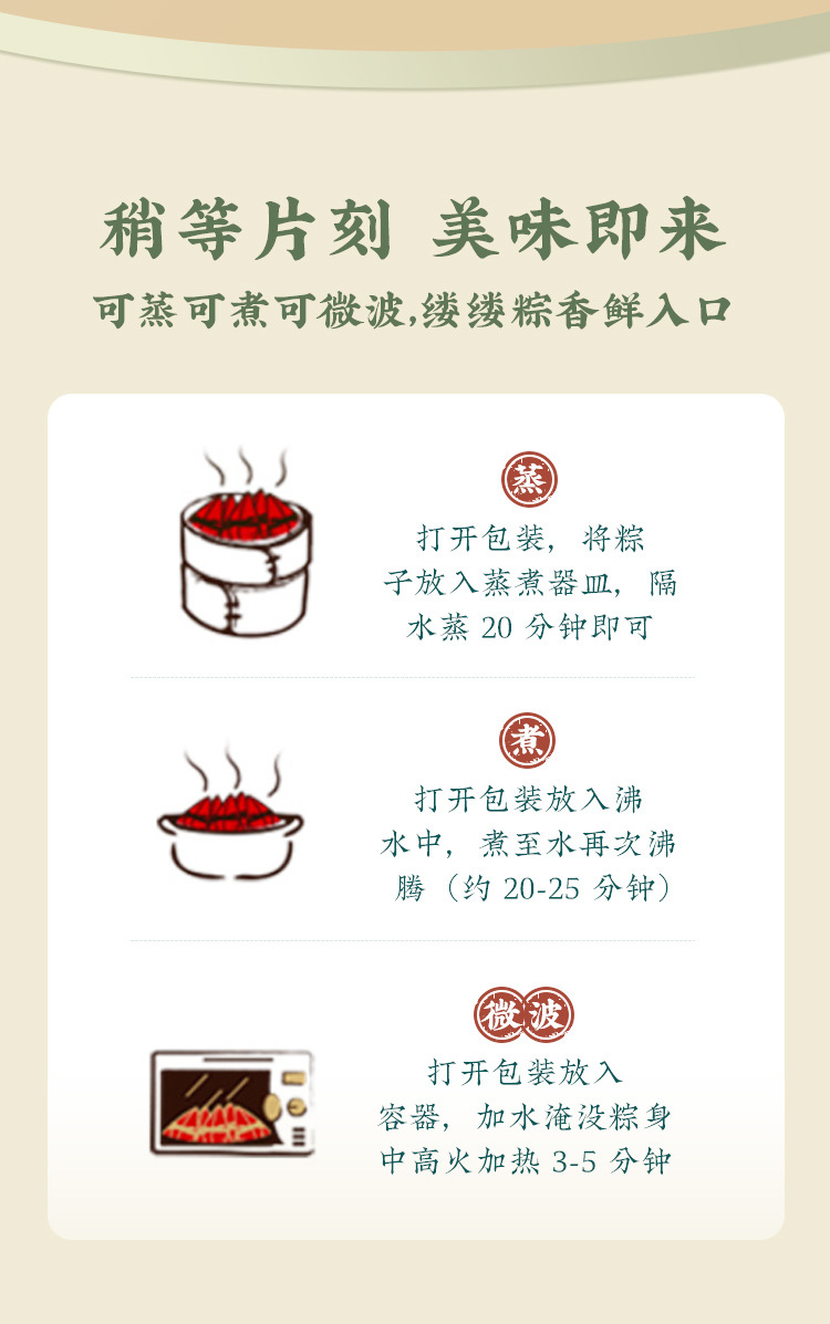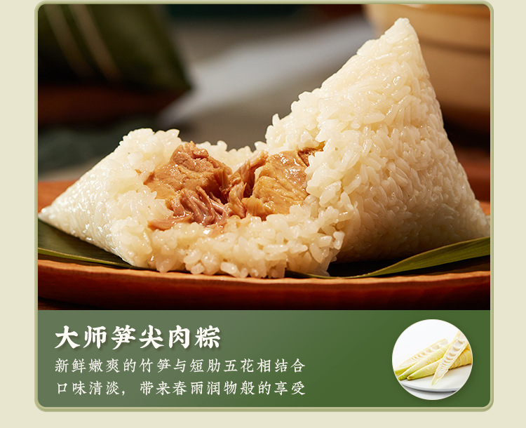 臻选短肋五花肉,肉质精实鲜美,口感醇厚;精心挑选9-12公分的高山箬叶,粽叶宽大,质感细腻;精选肥沃土地种植的稻米,米香浓厚,口感有韧劲。既可做聚会茶点,加盒牛奶又可做早餐,上市企业生产,品质有保障