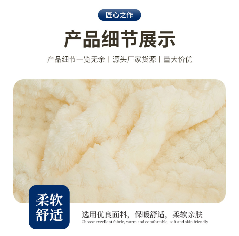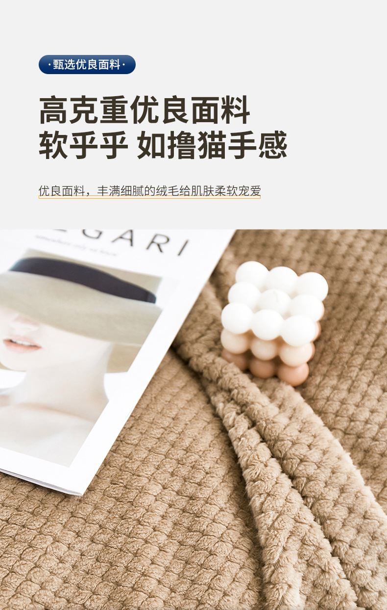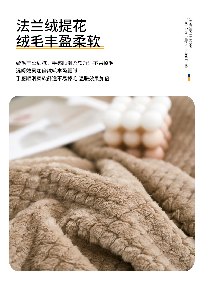 法兰绒菠萝格午睡毯:220克D丝法兰绒,100*150cm重420g,表面覆盖了超柔软的法兰绒绒毛,编织紧密,手感柔顺机洗不掉毛,采用活性印染工艺,更亲肤贴身,卷边工艺,有效固定毛毯边缘,细节满满