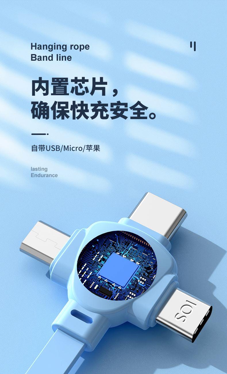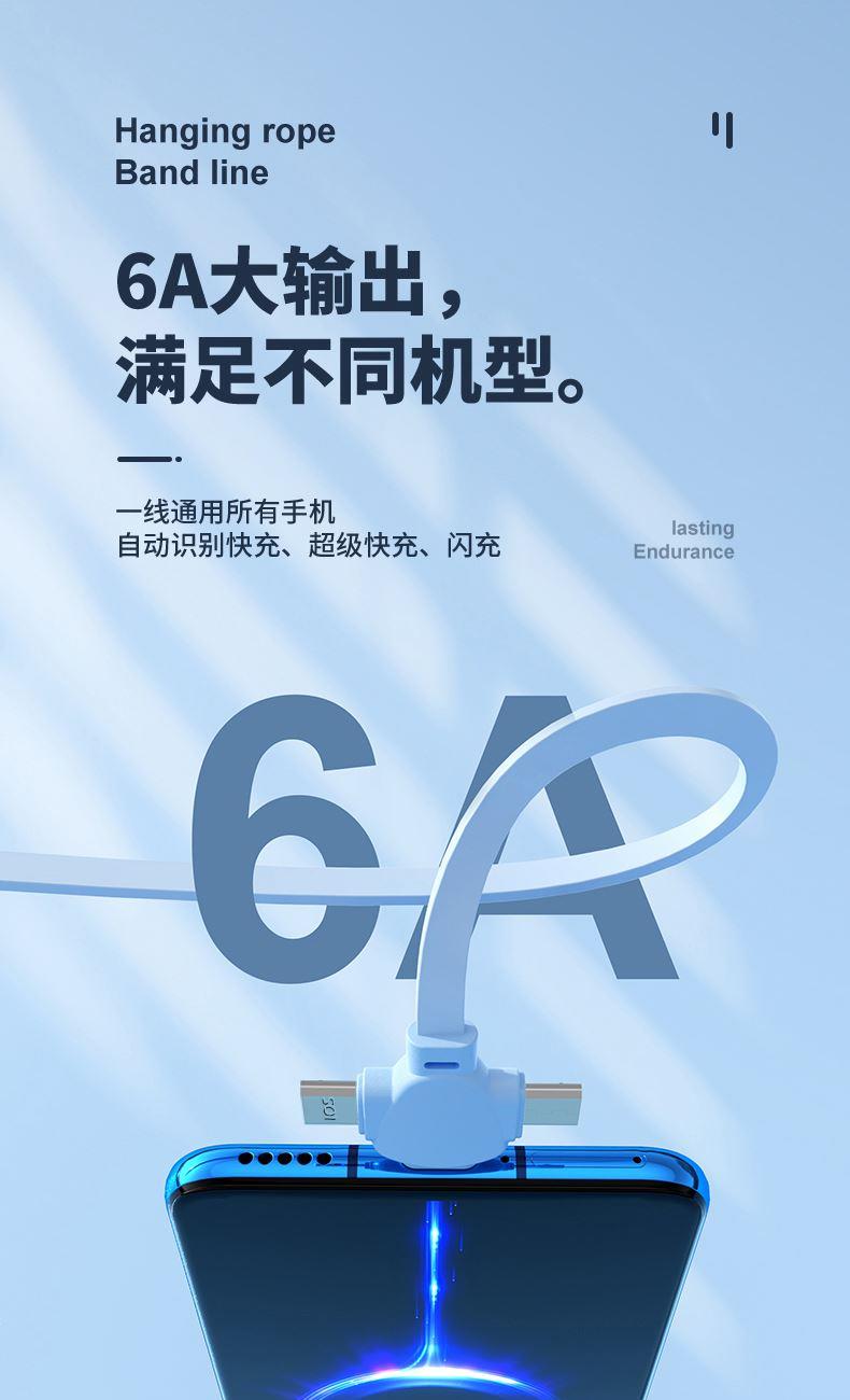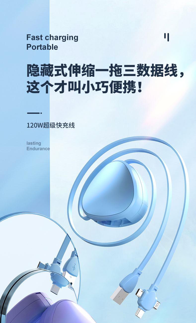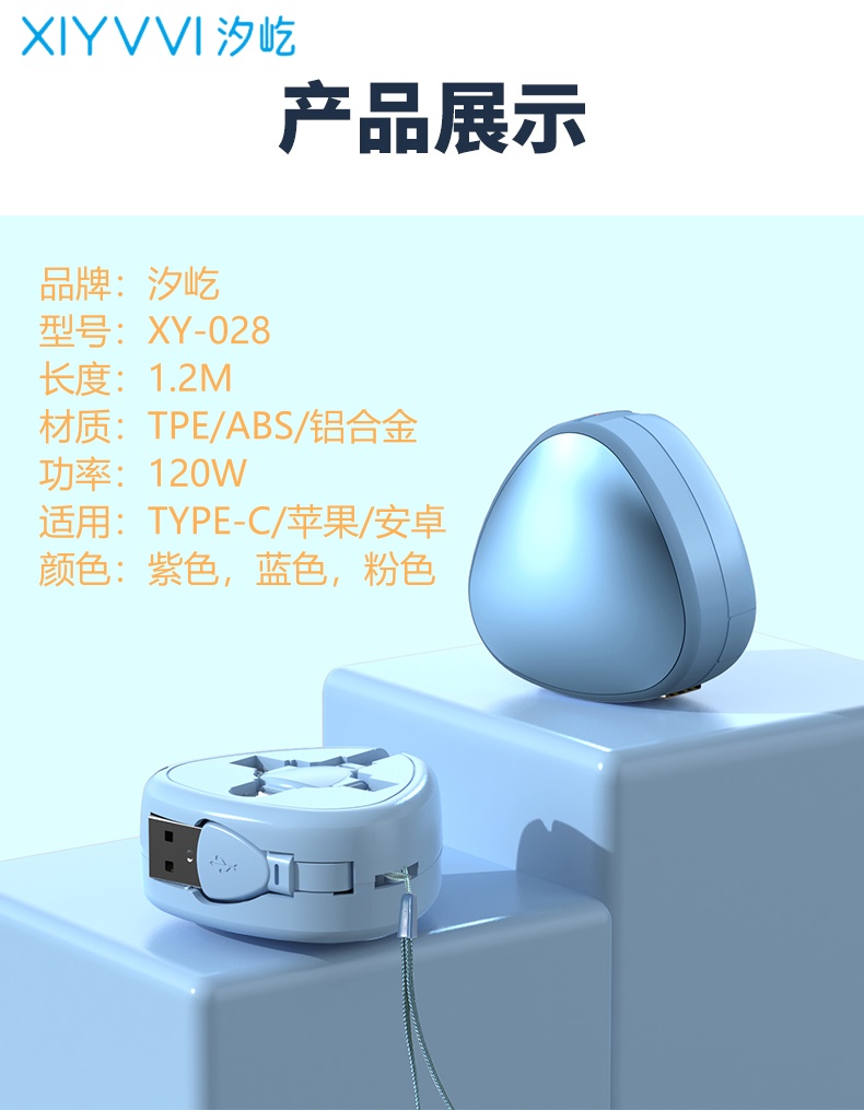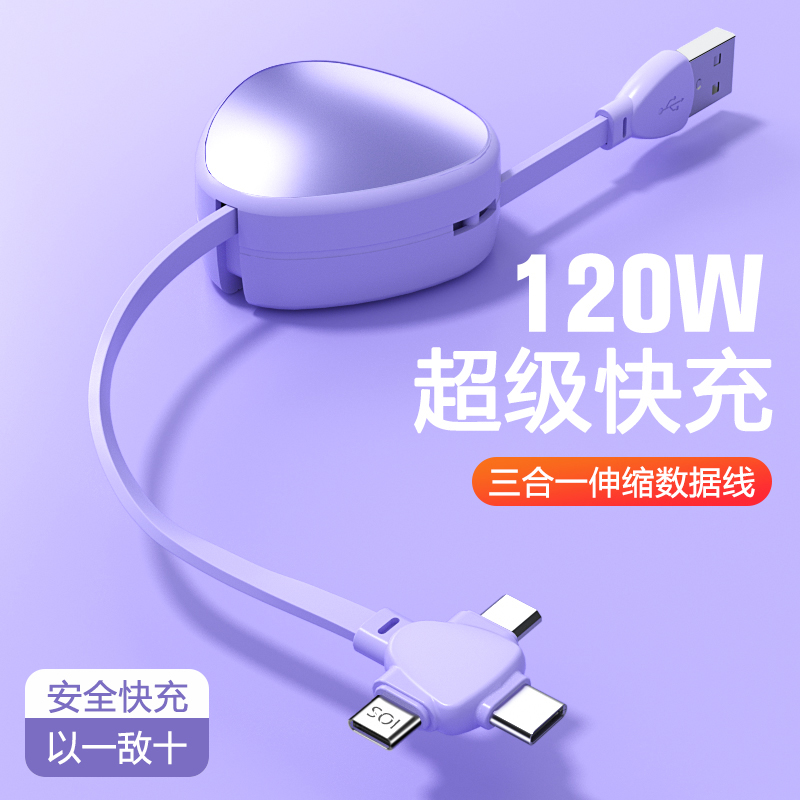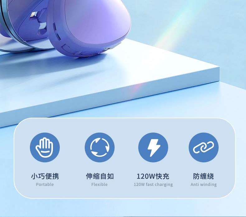 长度:1.2M 材质:TPE/ABS/铝合金 功率:120W 适用:TYPE-C/苹果/安卓 颜色:紫色,蓝色,粉色 产品重量:约49g 产品包装尺寸:140*90*27mm(彩盒) 产品卖点:Type-c接口支持快充, TPE环保材质,防缠绕,耐拉伸,经久耐用,加固接头,广泛兼容,适用市面绝大多数手机。