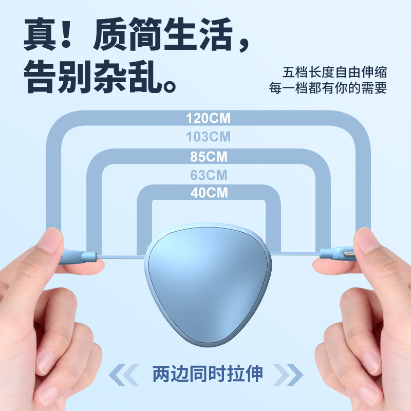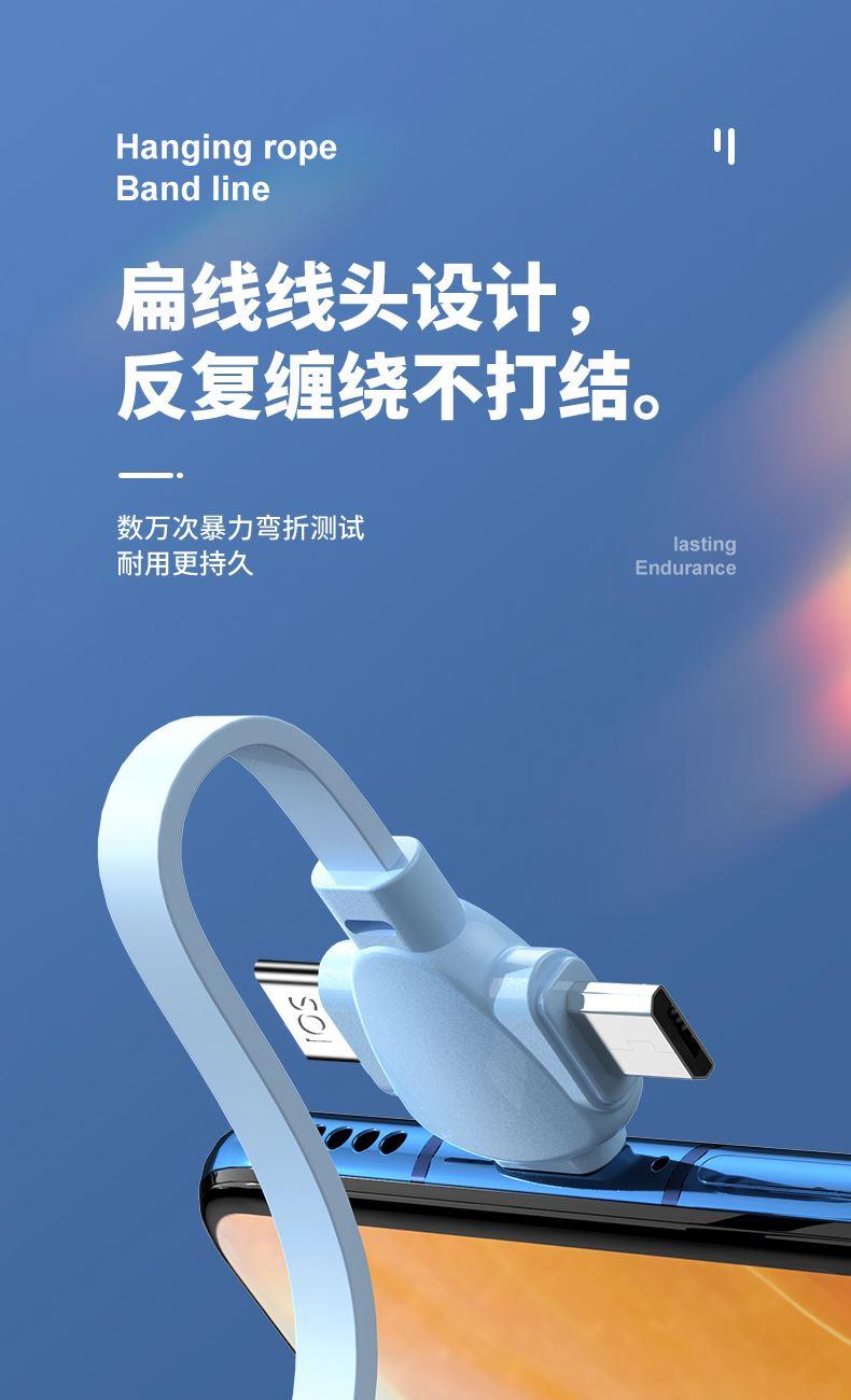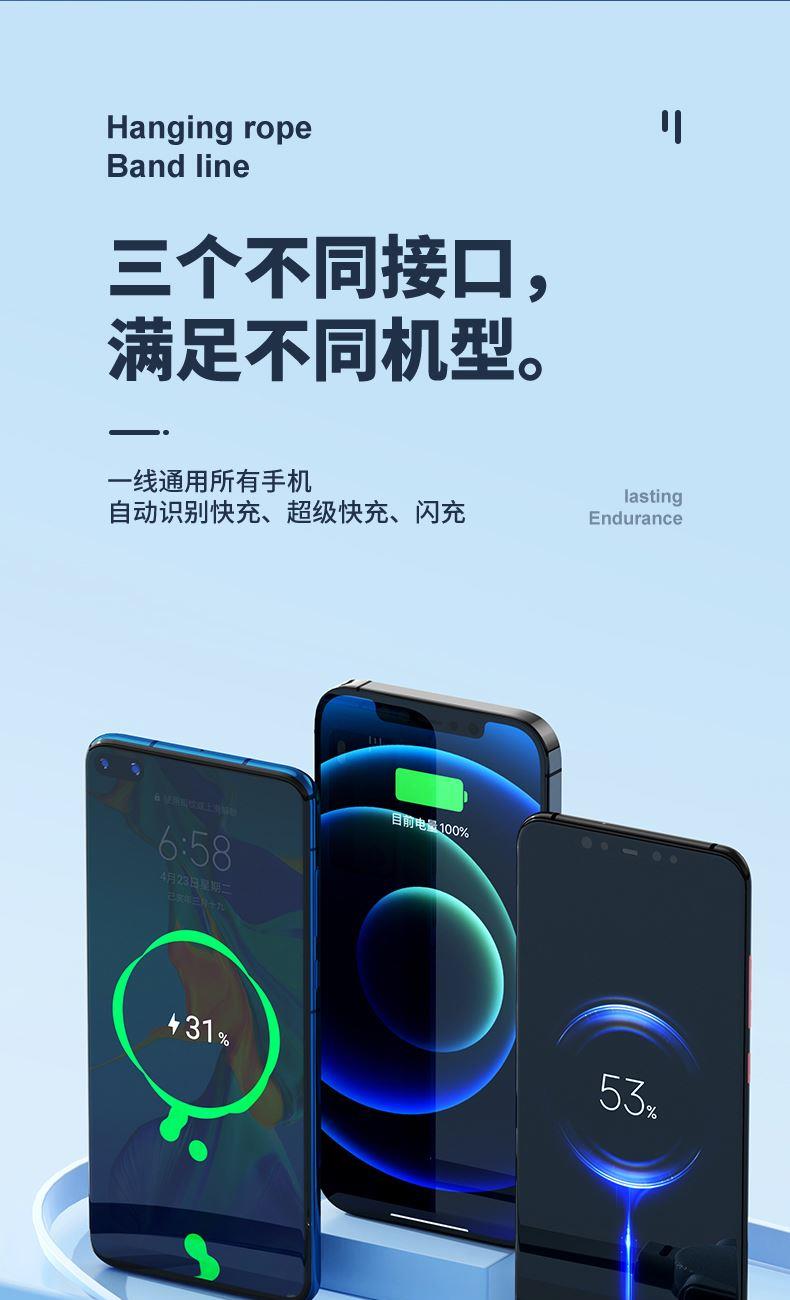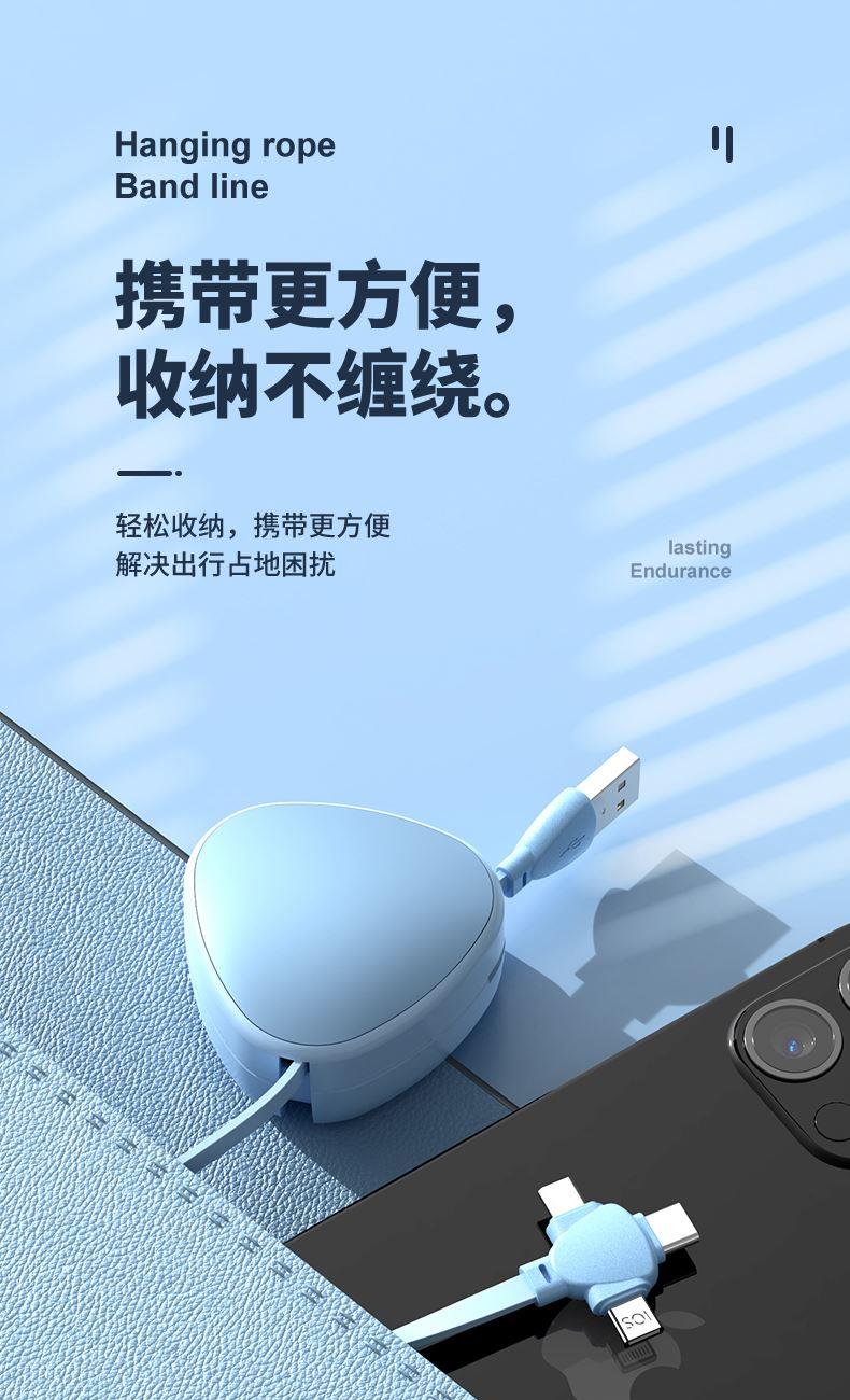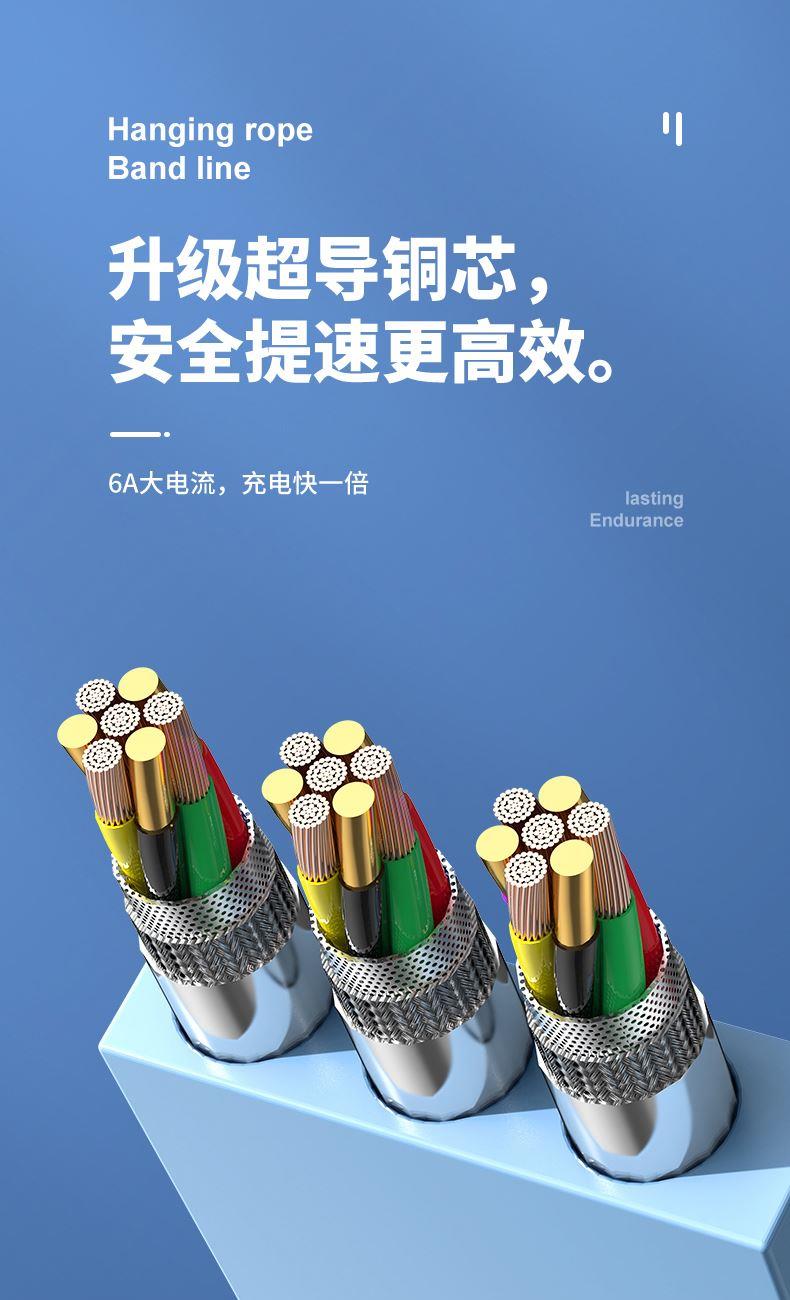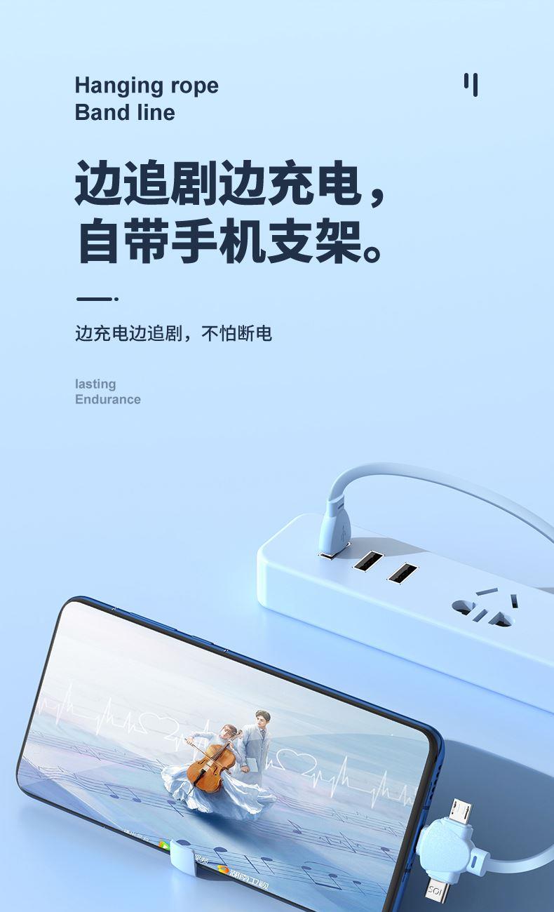 长度:1.2M 材质:TPE/ABS/铝合金 功率:120W 适用:TYPE-C/苹果/安卓 颜色:紫色,蓝色,粉色 产品重量:约49g 产品包装尺寸:140*90*27mm(彩盒) 产品卖点:Type-c接口支持快充, TPE环保材质,防缠绕,耐拉伸,经久耐用,加固接头,广泛兼容,适用市面绝大多数手机。