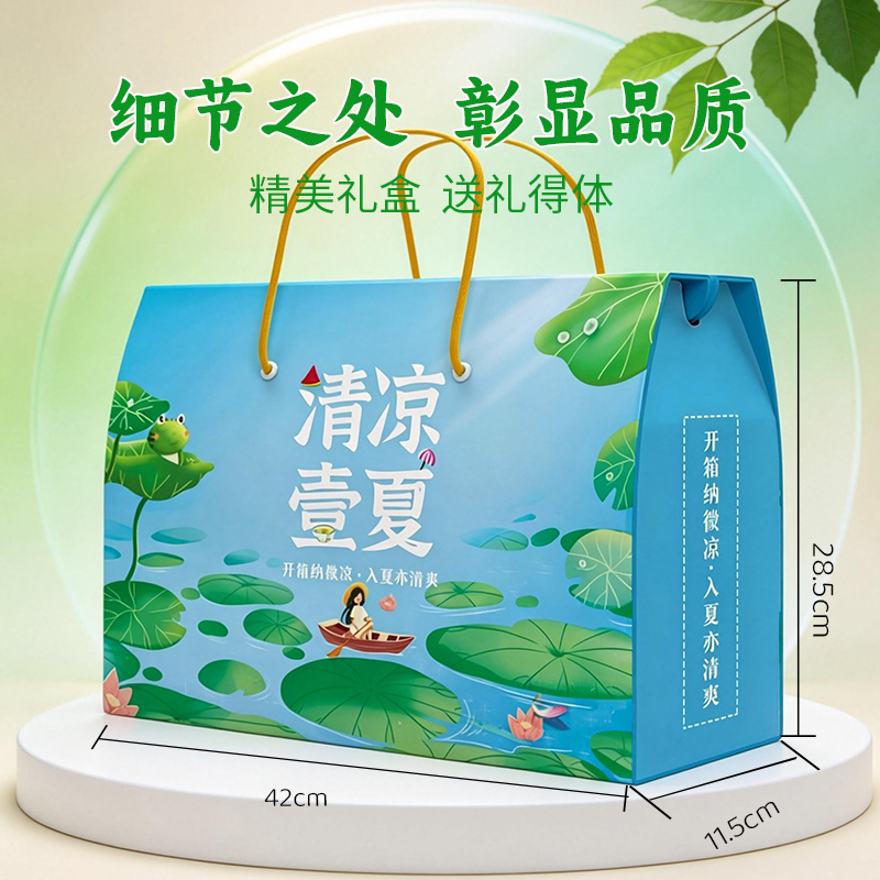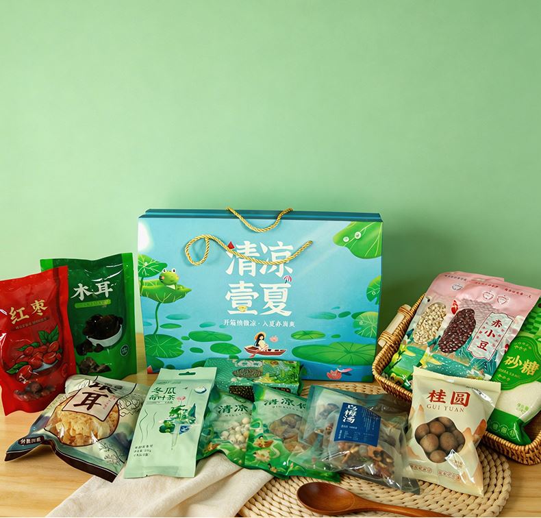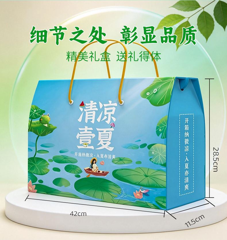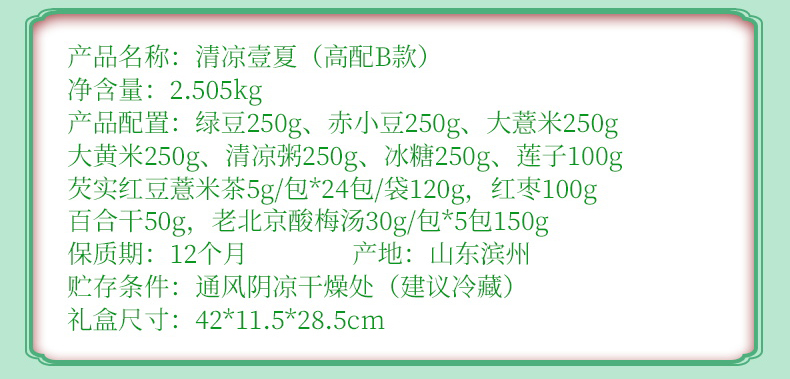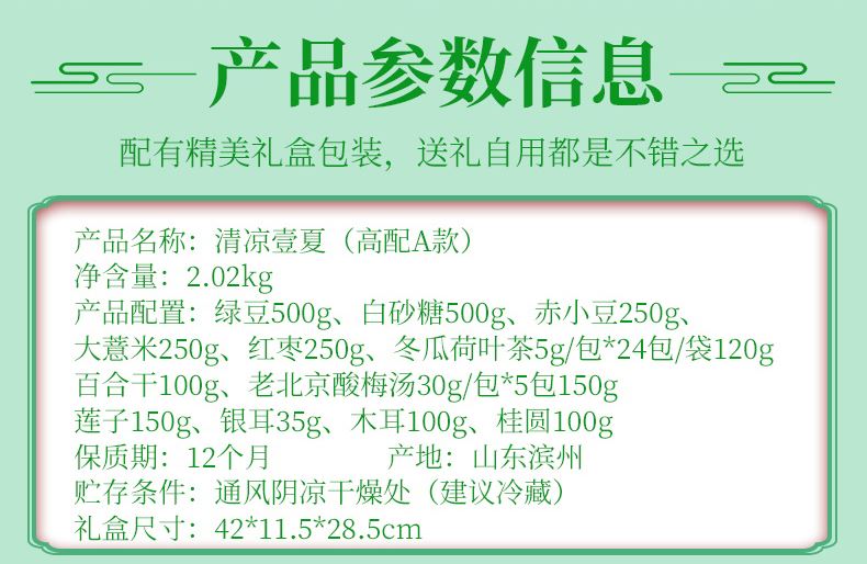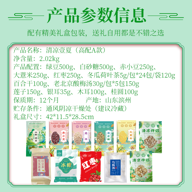 清凉壹夏(高配A款) 净含量:2.02kg 产品规格配:绿豆250g、赤小豆250g、大薏米250g、大黄米250g、清凉粥250g、冰糖250g、莲子100g、芡实红豆薏米茶5g/包*24包/袋120g,红枣100g百合干50g,老北京酸梅汤30g/包*5包150g 盒尺寸:42*11.5*28.5cm 箱体积:0.077方 箱尺寸:59.5*43*30 箱重量:13.2kg