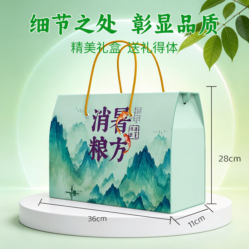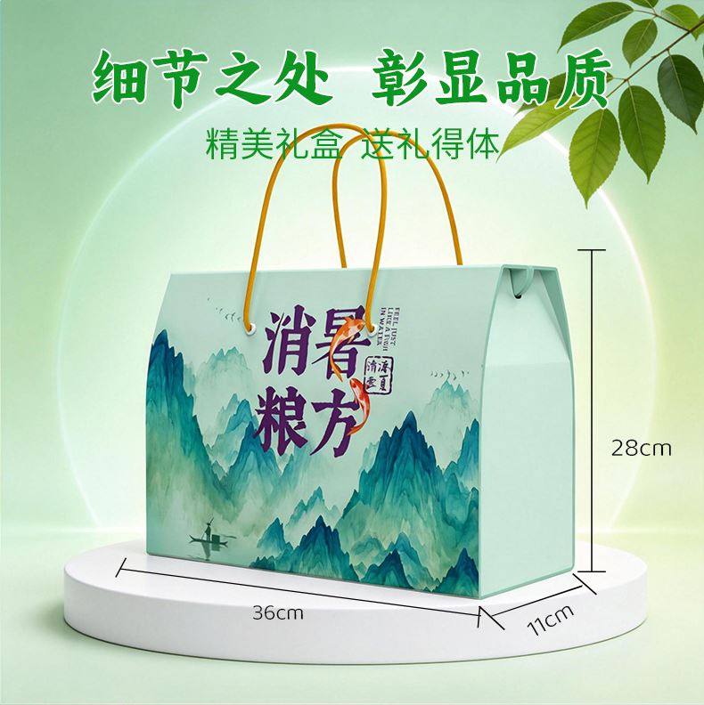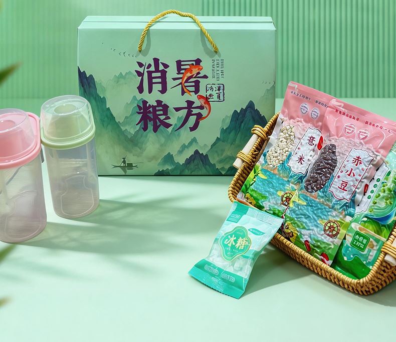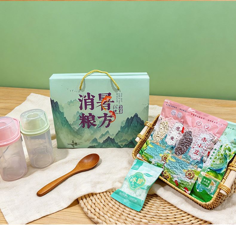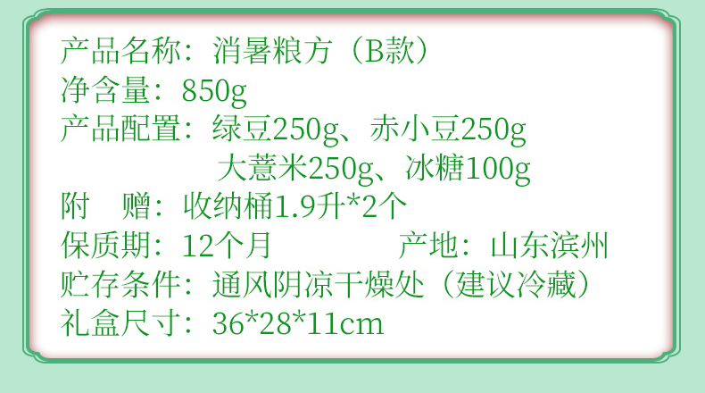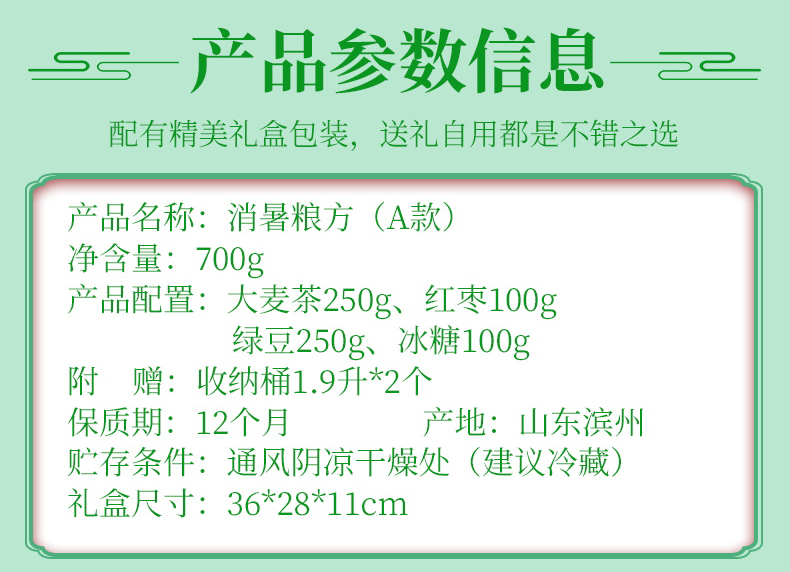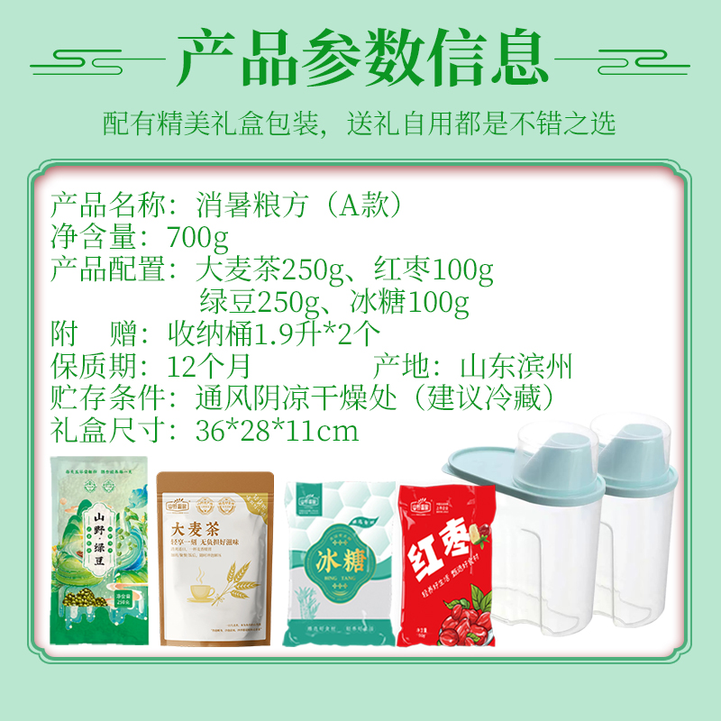 消暑粮方 (A款) 净含量:700g 产品规格配置:大麦茶250g、红枣100g 绿豆250g、冰糖100g 附盒赠:收纳桶1.9升*2个 盒尺寸:36*11*28cm 箱尺寸:57.5*37.5*58 箱体积:0.158方 箱重量:13.6kg